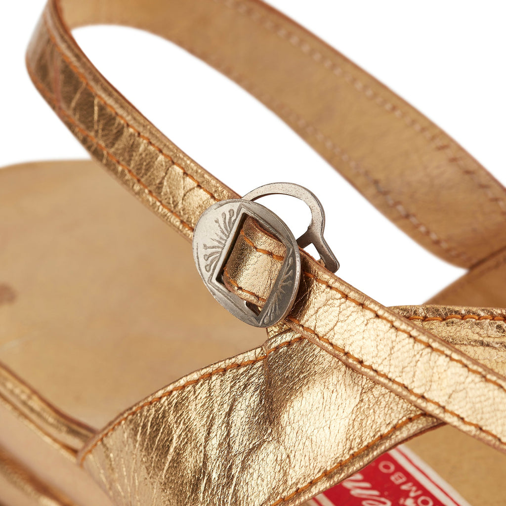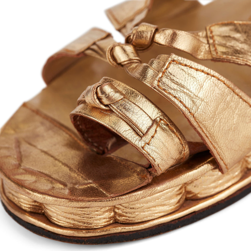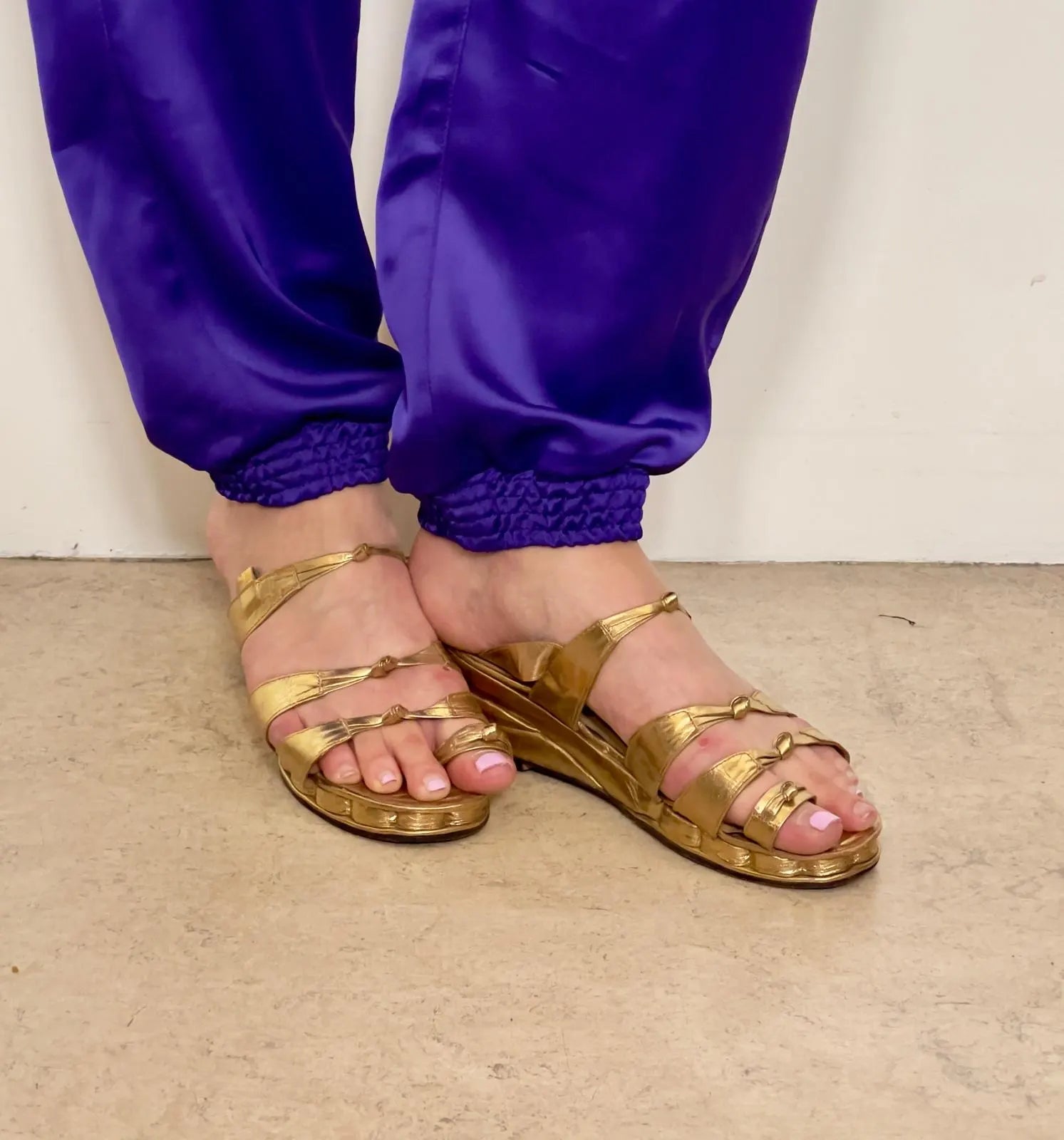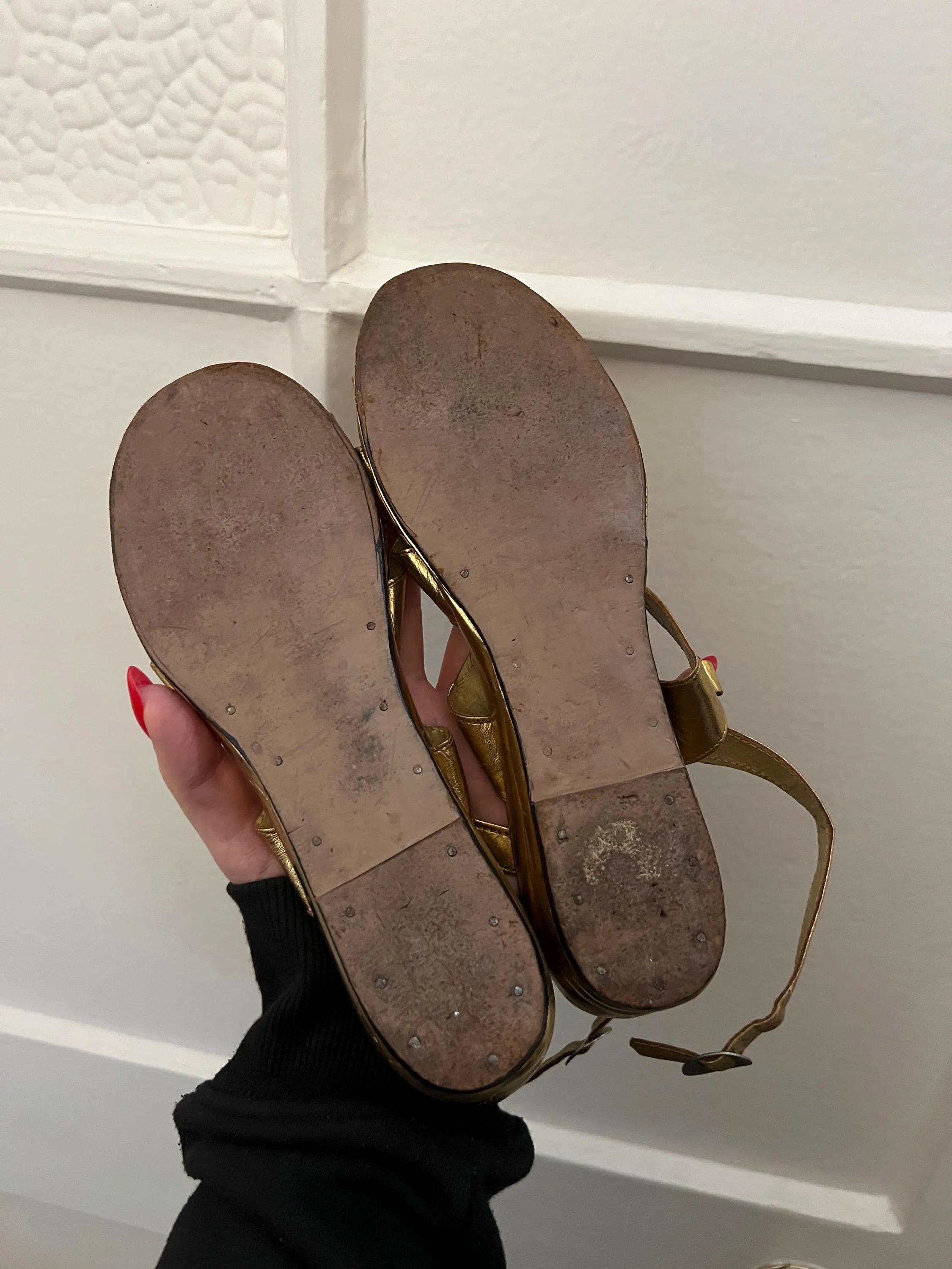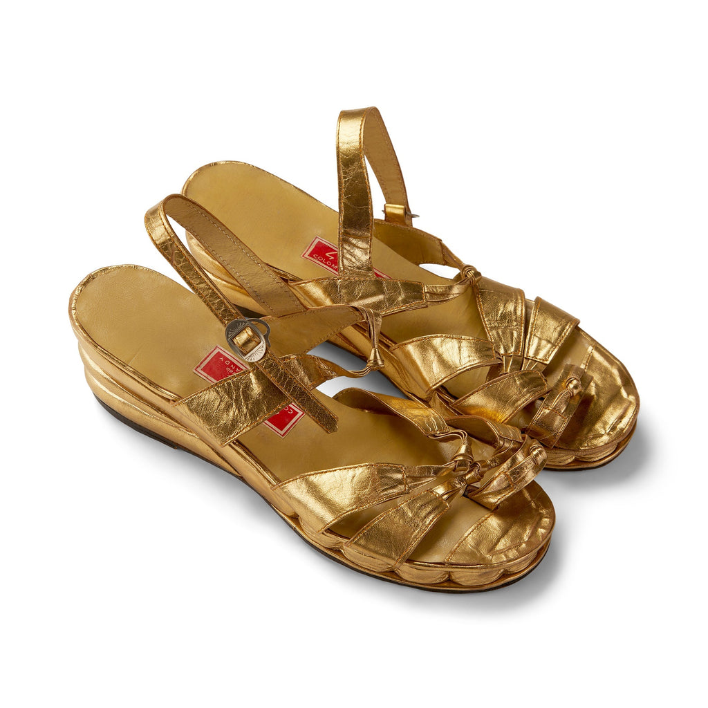 A rare pair of true vintage 1940s strappy wedge sandals designed by Gemrich. Crafted from a rich gold metallic leather and lined with matte beige leather, these sandals feature a caged front detailed with gold leather knots and a gold leather toe strap, also detailed with a knot. They are secured with an ankle strap and adjustable buckle. The buckle is crafted from a silver-toned metal with pretty carved detailing. The wedge heel measures just over 2”. The heels feature curved gold-leather panels which add a decadent, Hollywood regency feel.