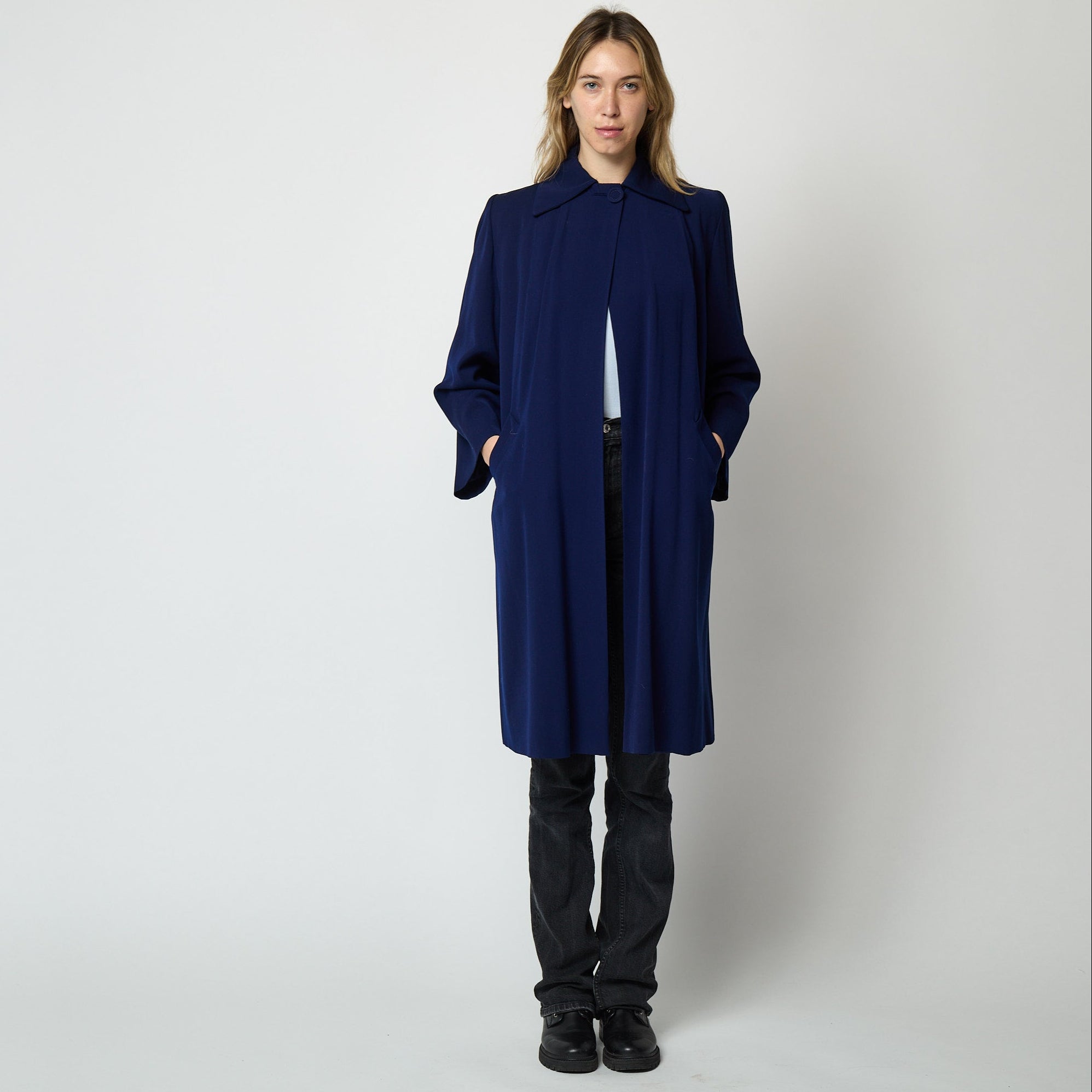 Tailored from 100% virgin wool, it fastens at the neck with a large tonal fabric button and features a wide pointed collar and slip pockets to the front. It is exceptionally well lined in very high quality rayon which has been wool backed for extra warmth. The additional weight of these combined fabrics provide the "swing" and it is a joy to wear. A coat of this quality is a rare find, especially in such excellent vintage condition. Very fresh looking, there are no visible faults and she appears unaltered. Will fit a great range of sizes up to a UK 14 or US 10. Our model is a UK 6 US 0-2 and 5'11" and this coat had plenty of room on her.
