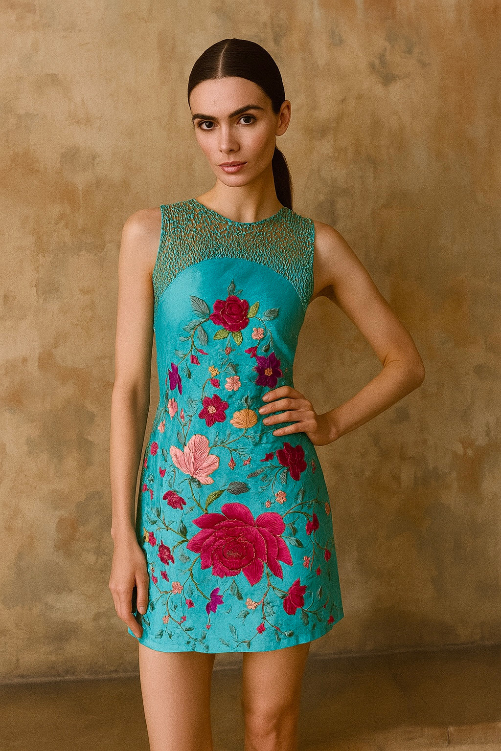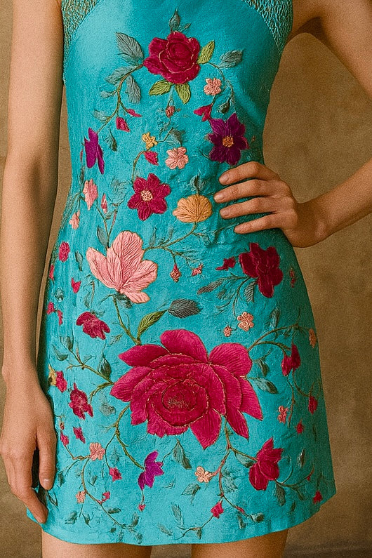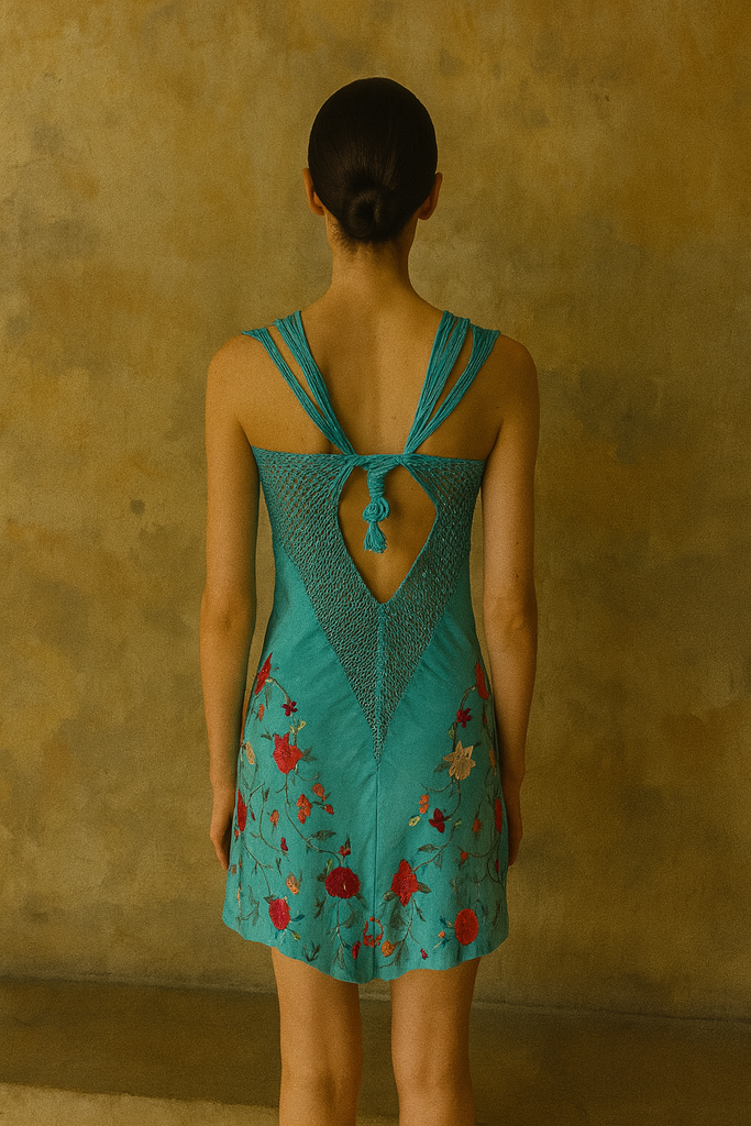 This unique one-of-a-kind dress features a beautiful aqua green floral embroidery from a 40s piano shawl and features  a macramé neckline, and adjustable button closure at the back. Perfect for summer, this short dress will add a touch of elegance to any occasion. Stand out in style with the Adrianne dress.
