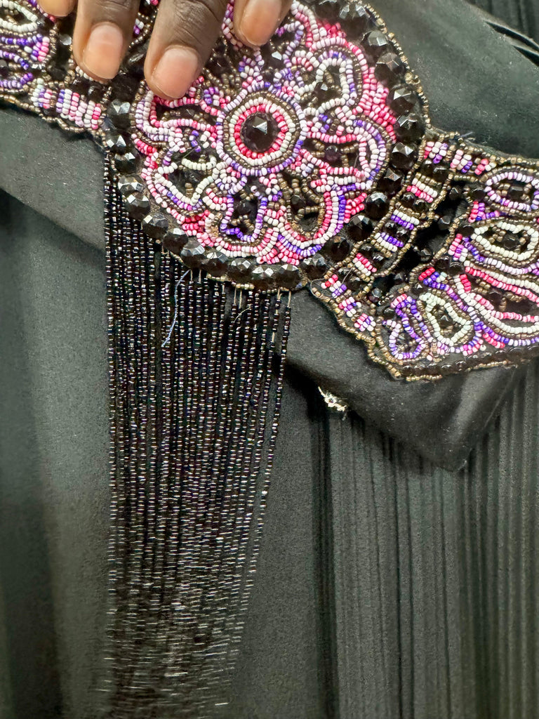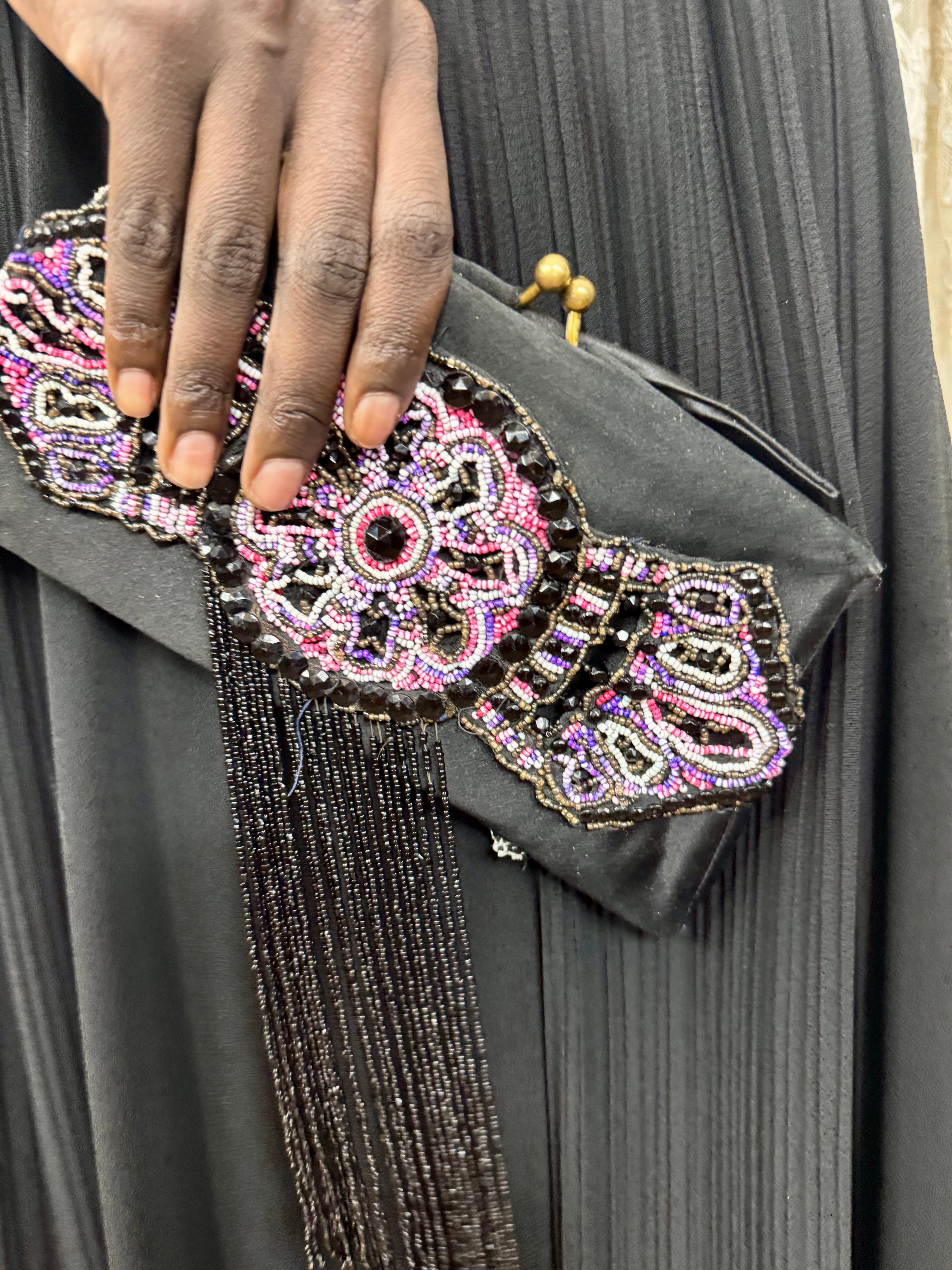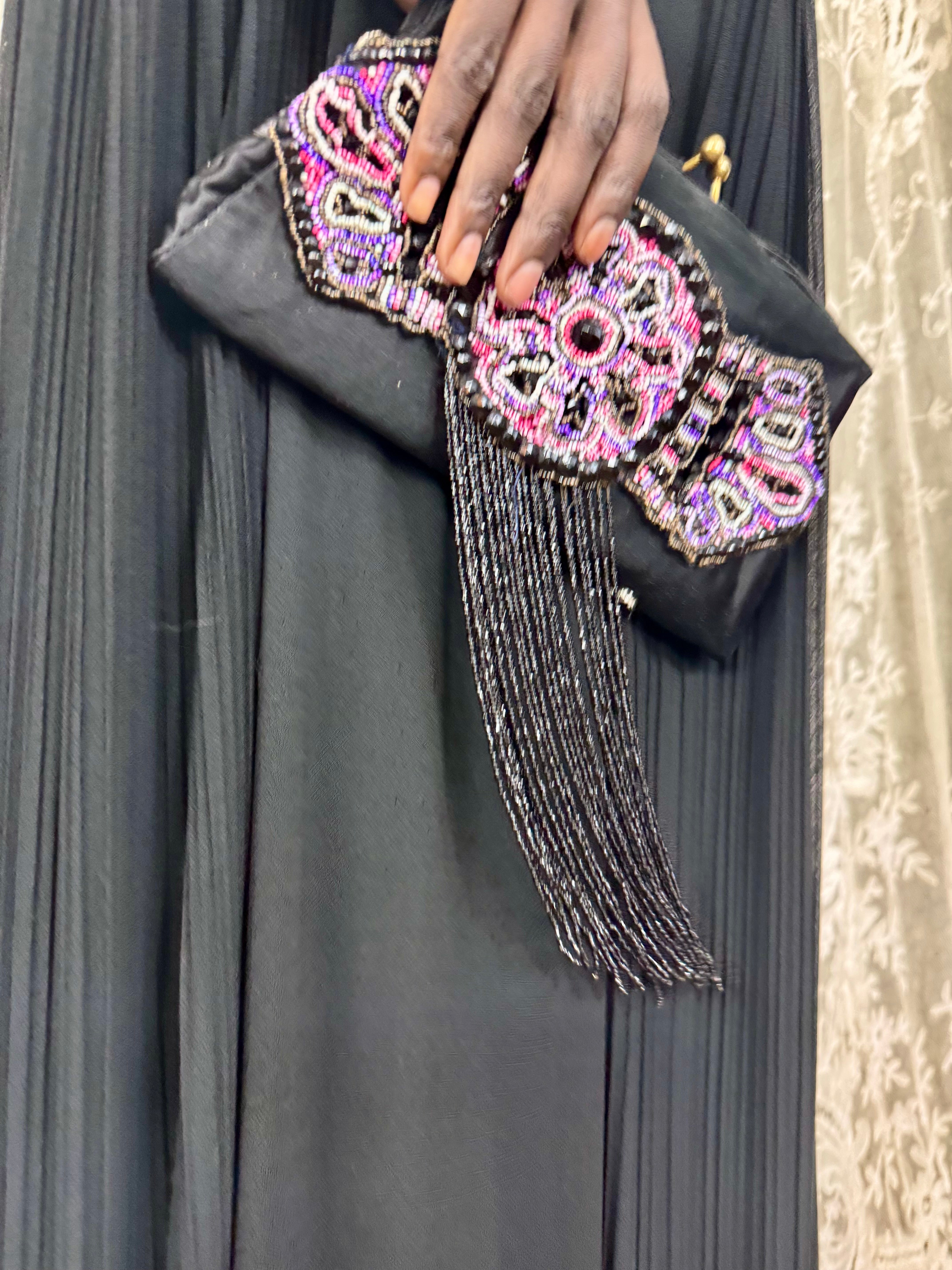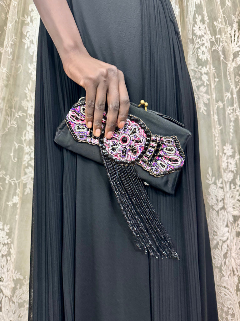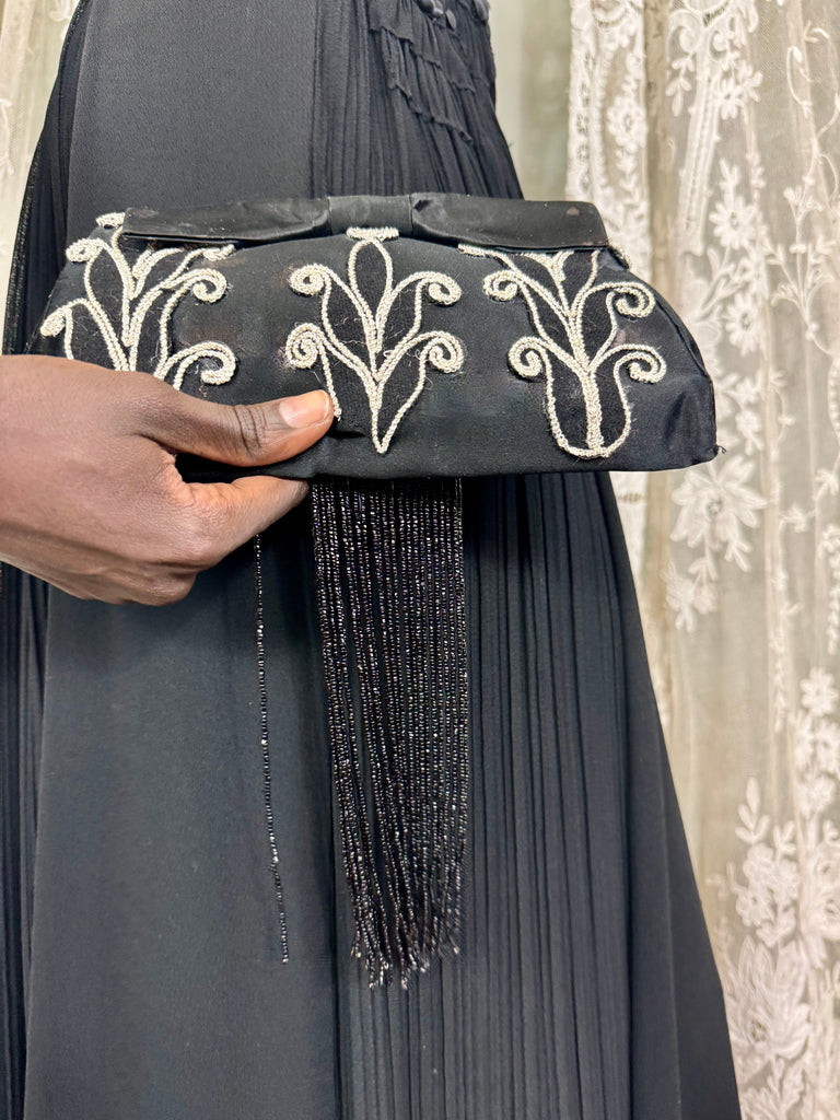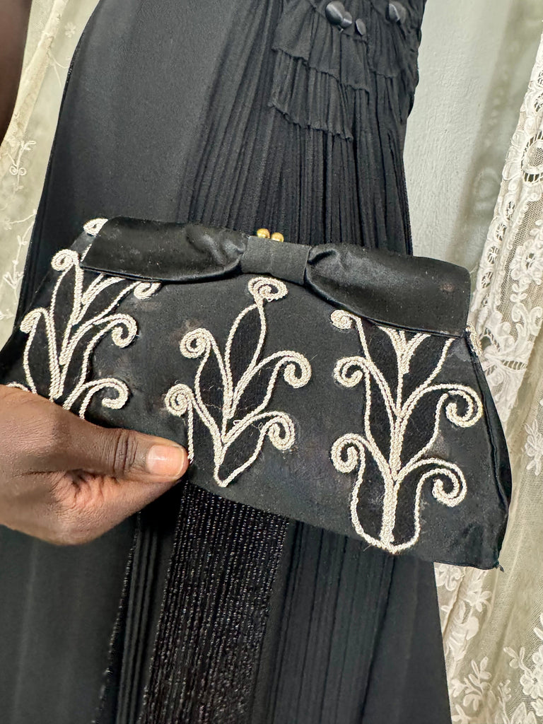 Truly stunning 40s black silk beaded clutch bag. Featuring a delicately crafted bow and beaded tassel on one side, and an elegant Edwardian leaf design on the other, this bag is both stylish and timeless. Has an internal pocket. Elevate any outfit with this statement accessory.