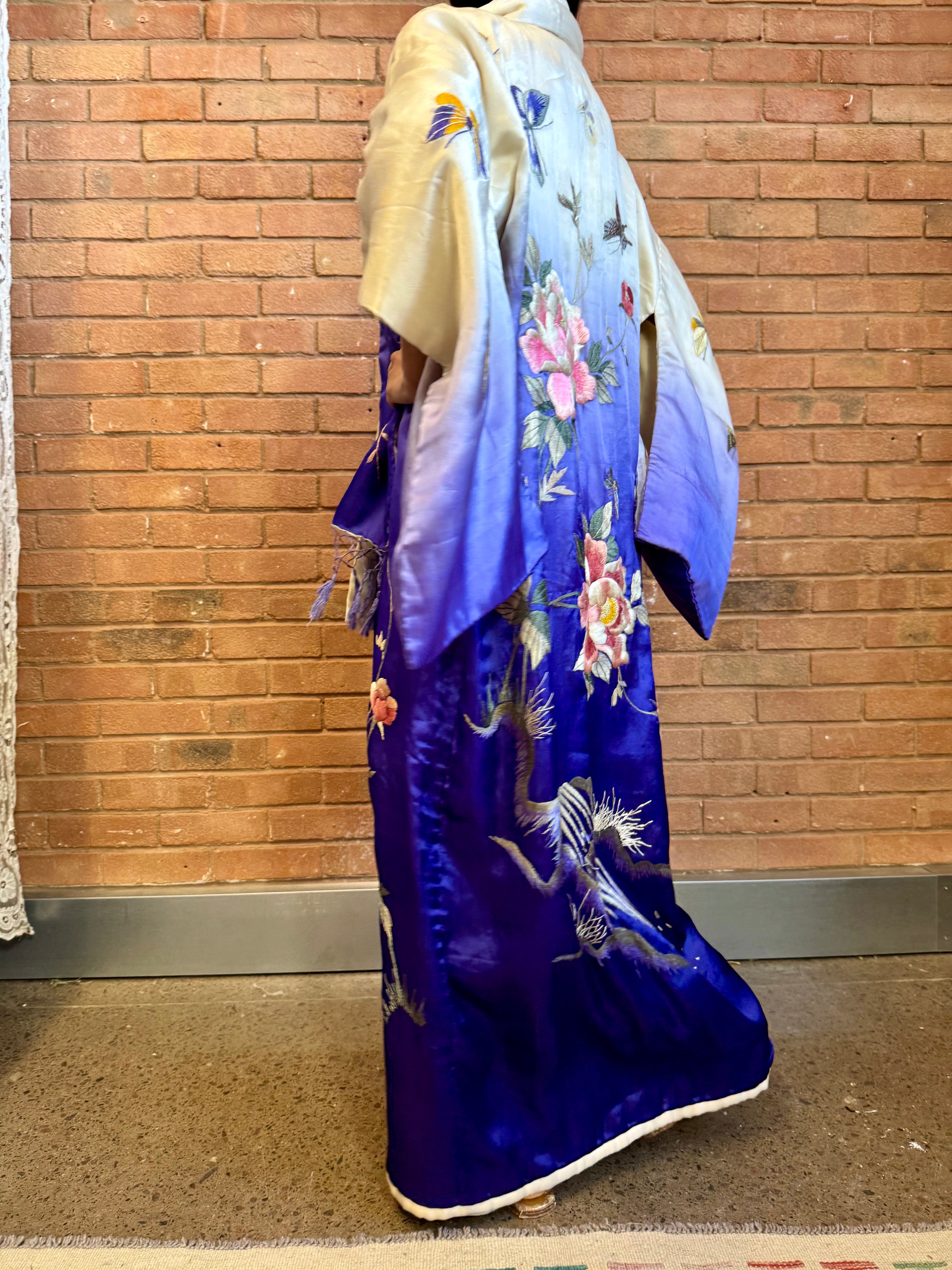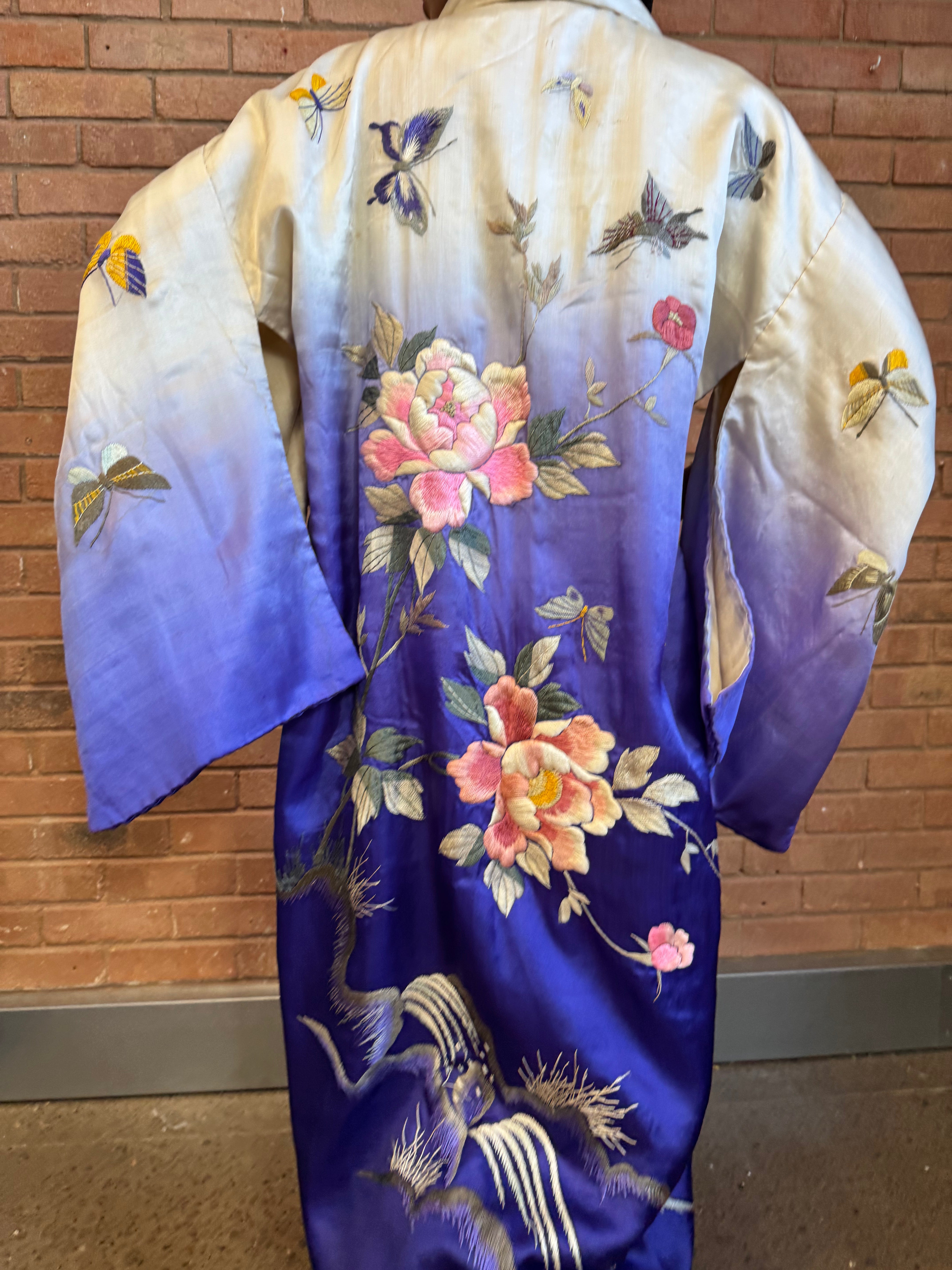 Elevate any outfit with this collectable 40s Japanese silk ombré embroidered kimono, featuring stunning florals and delicate butterflies. Made from high-quality silk, this kimono exudes elegance and style. Perfect for any occasion, experience the luxurious feel and exquisite design of this incredible piece.