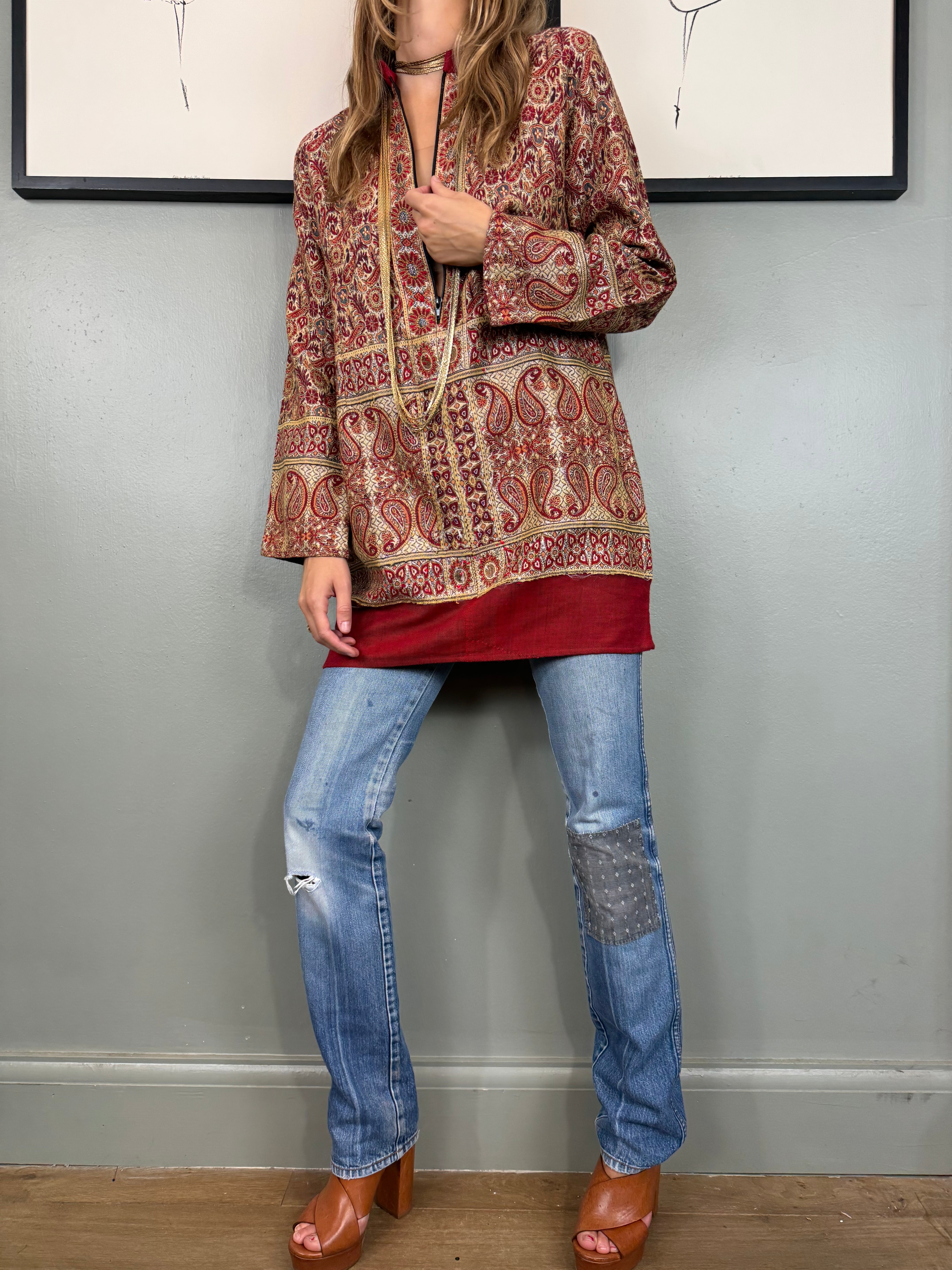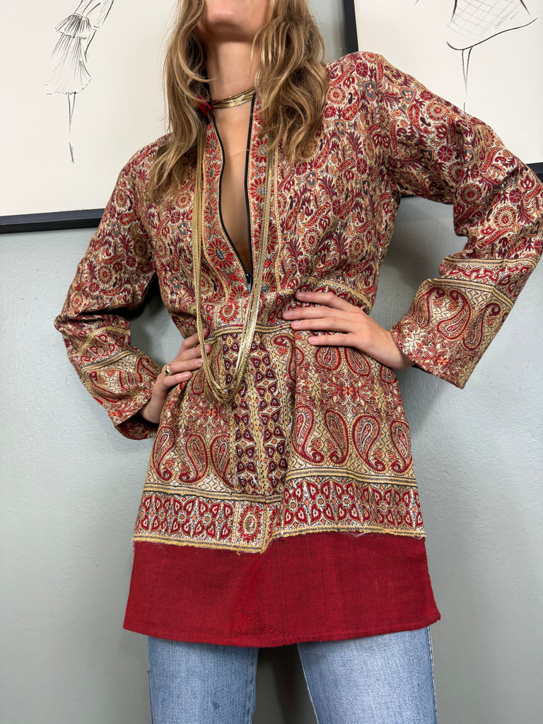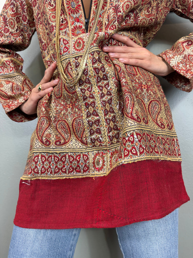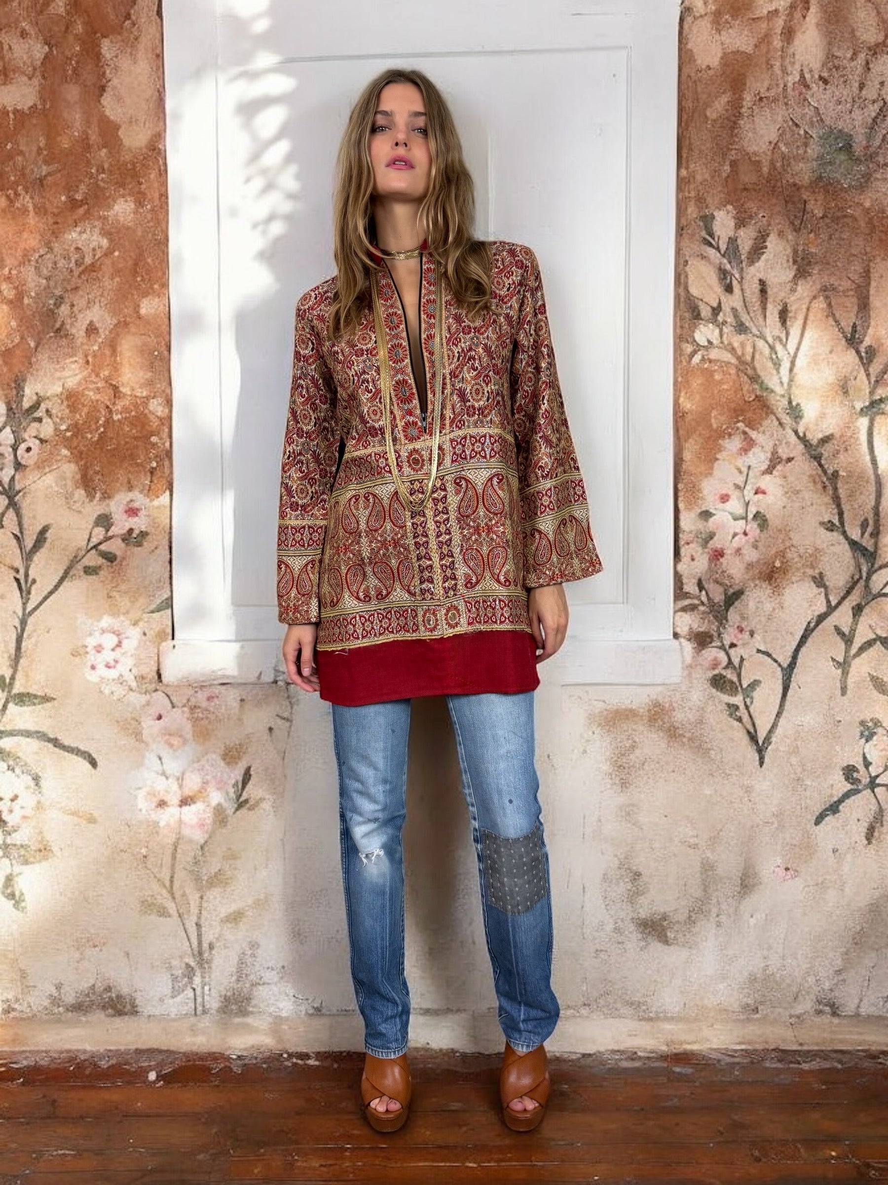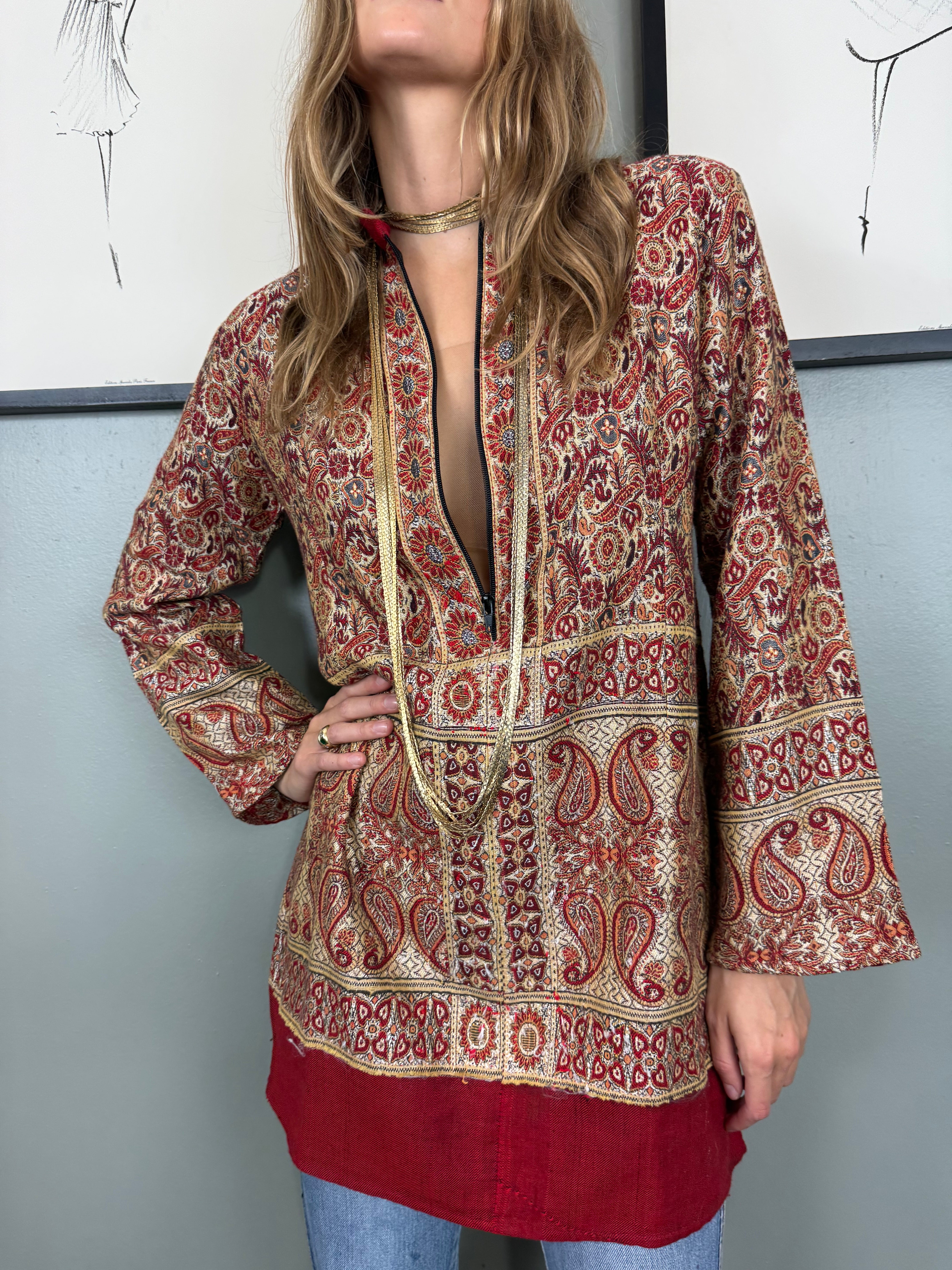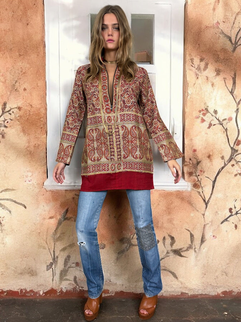 Expertly crafted with a fine, soft wool blend, the Eros paisley tunic boasts a classic 40s floral print and a sleek front zip. With long sleeves and a flattering straight fit, stay stylish while staying comfortably chic.