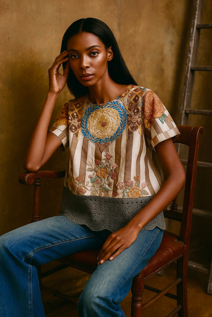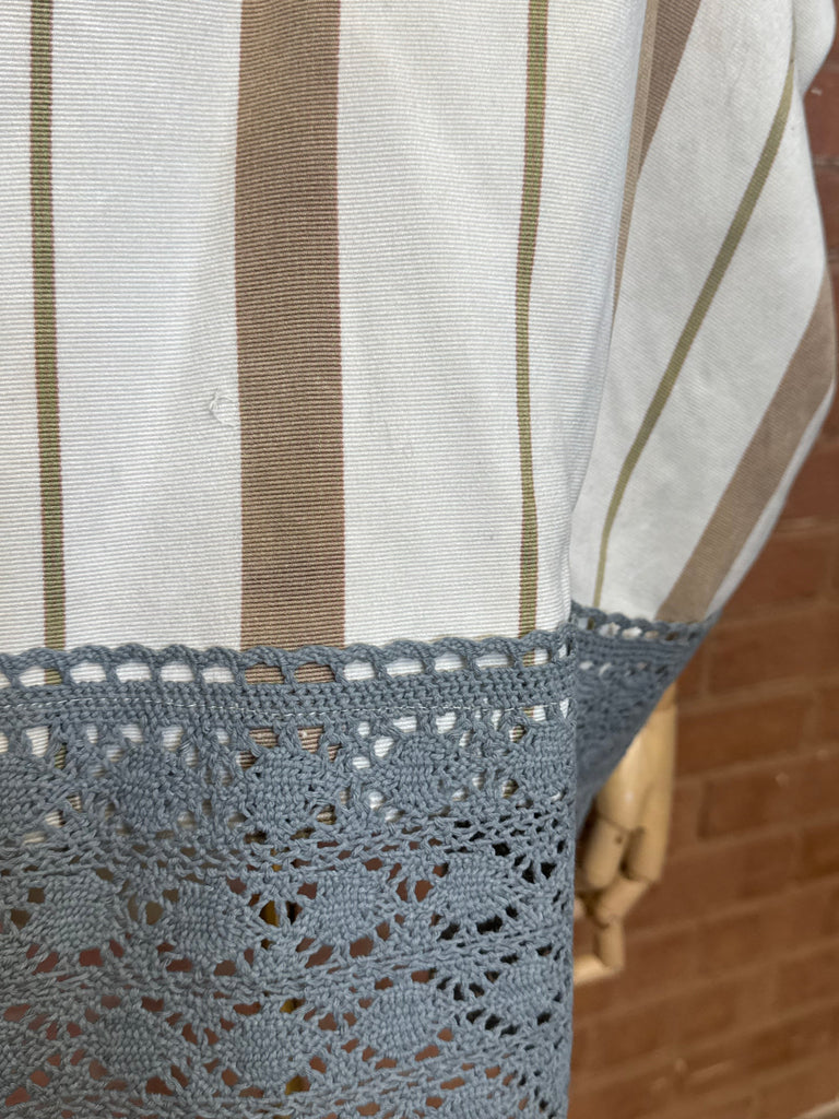 This unique 1940s Eastern European blouse features intricate embroidery and crochet detailing on striped cotton fabric. With short sleeves and a loose, straight cut, it offers both comfort and a distinctive vintage aesthetic. As a rare, reworked historical garment, it embodies exceptional craftsmanship and cultural heritage.