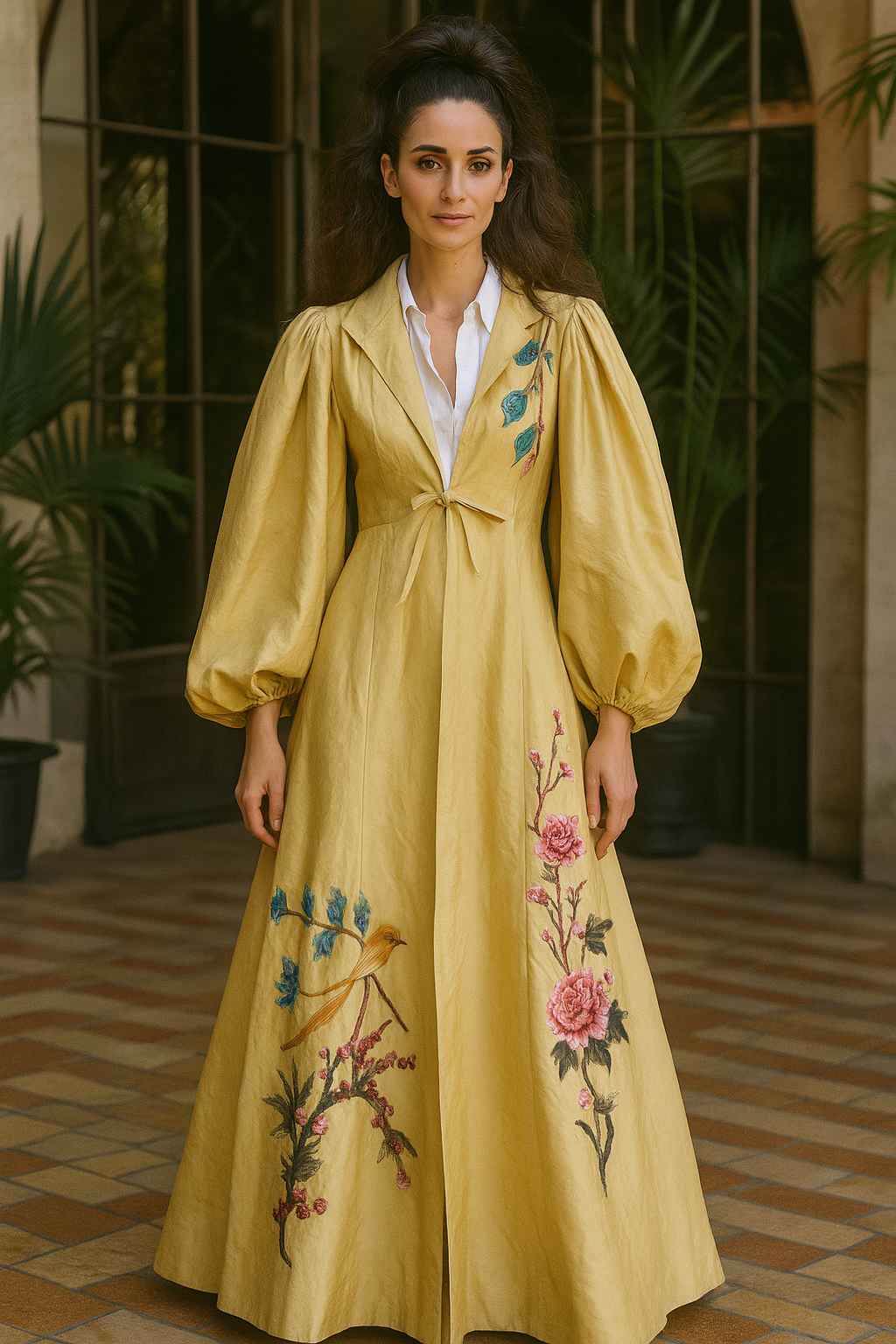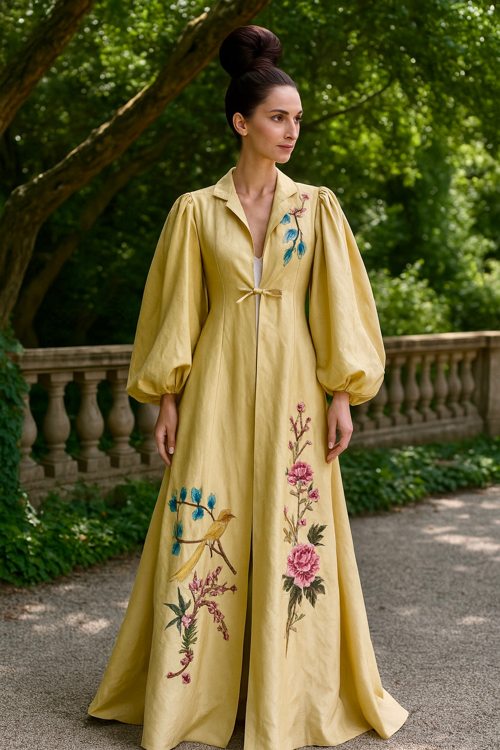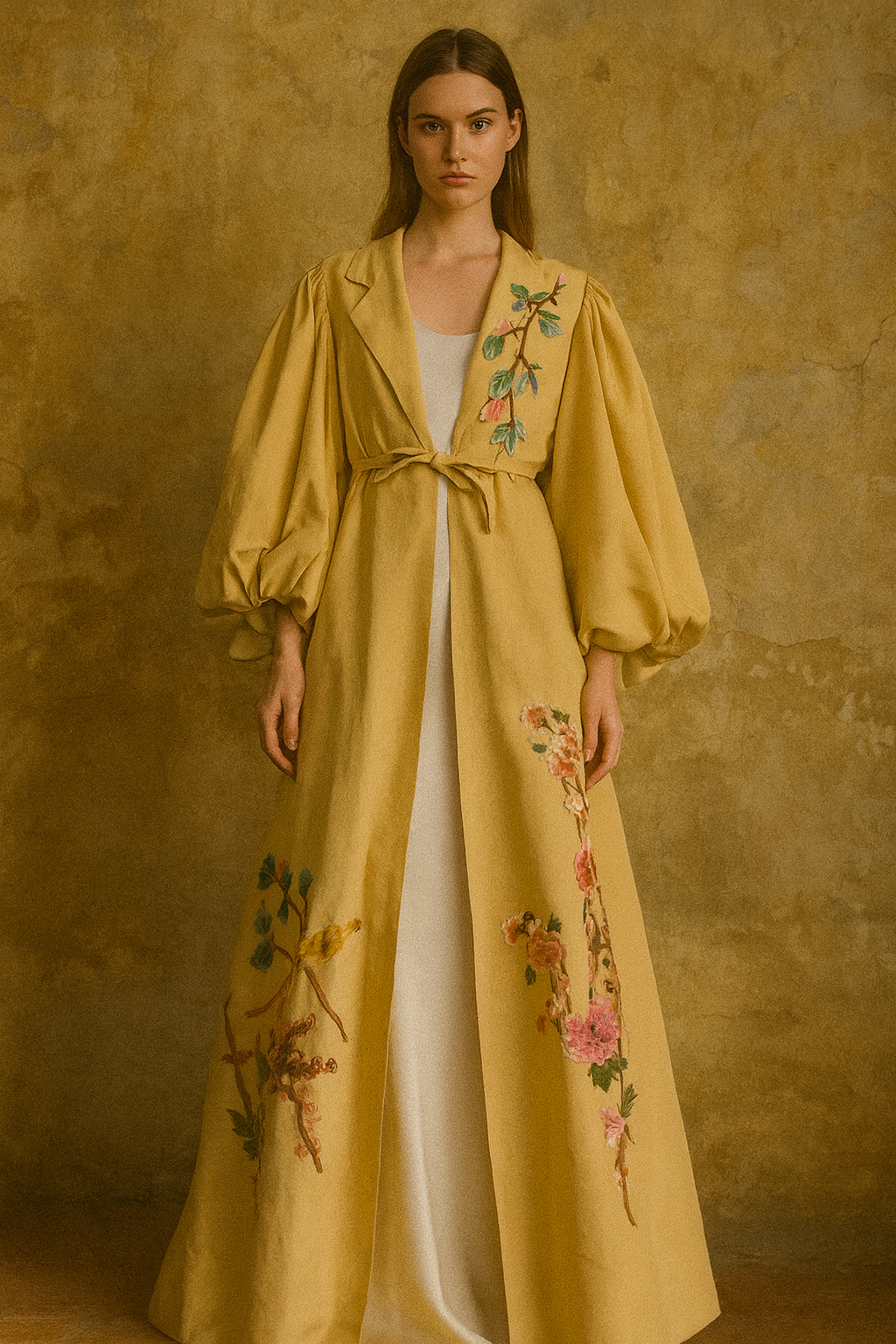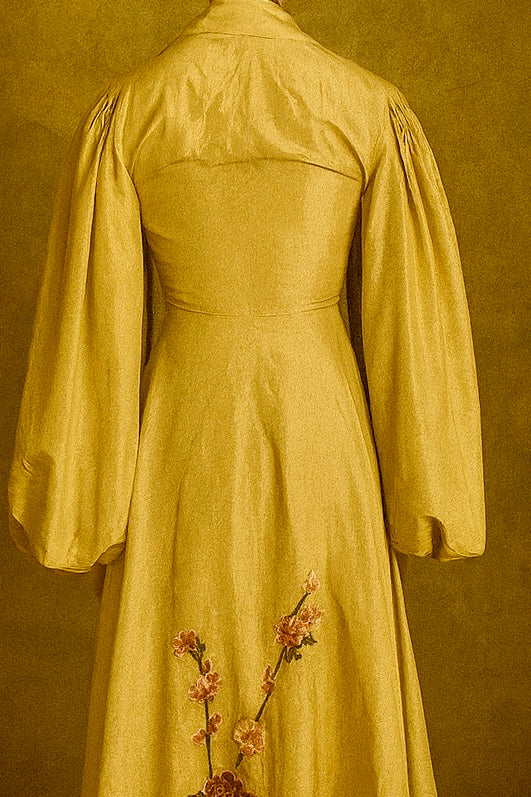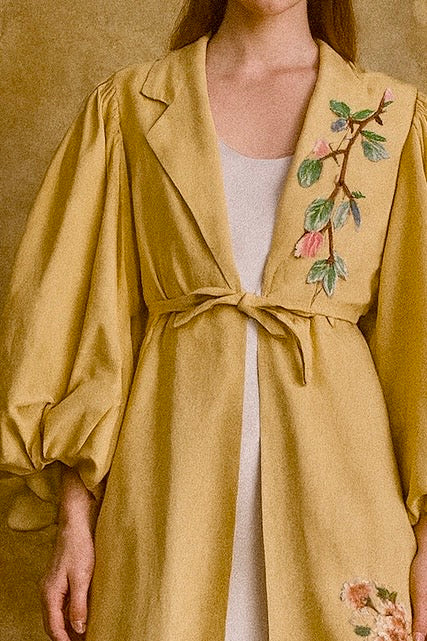 This exquisite silk coat in a buttery golden hue showcases expert craftsmanship with its voluminous pleated sleeves and elegant A-line silhouette. Detailed with delicate floral embroidery throughout, it features a front tie and classic lapels, offering versatile styling options. Perfectly suited to elevate both casual jeans and simple dresses, this unique piece combines timeless sophistication with contemporary flair.