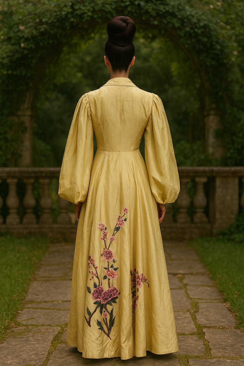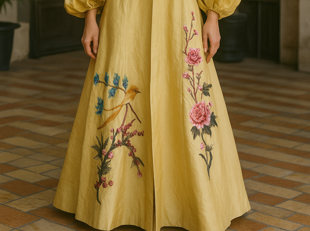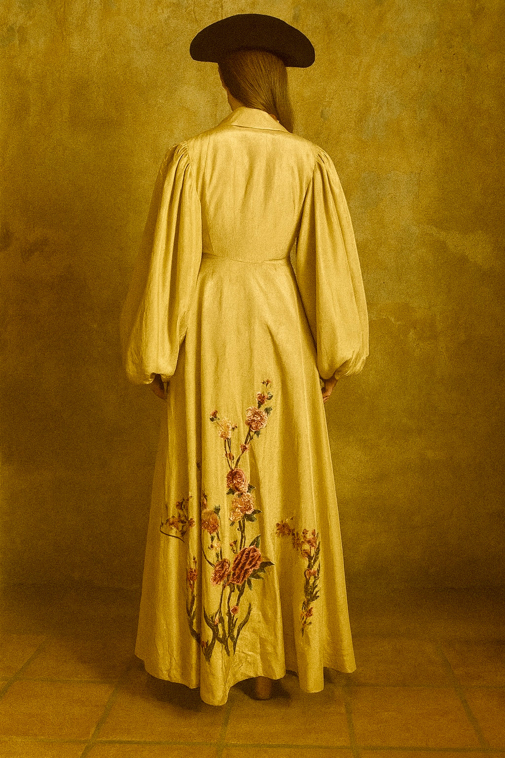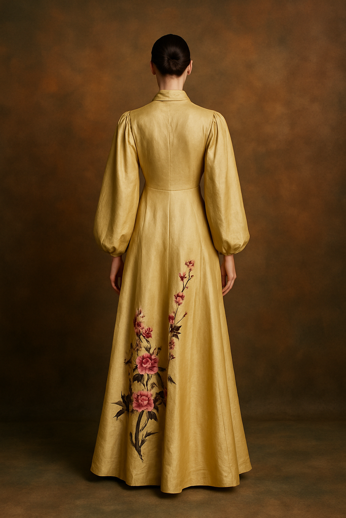This exquisite silk coat in a buttery golden hue showcases expert craftsmanship with its voluminous pleated sleeves and elegant A-line silhouette. Detailed with delicate floral embroidery throughout, it features a front tie and classic lapels, offering versatile styling options. Perfectly suited to elevate both casual jeans and simple dresses, this unique piece combines timeless sophistication with contemporary flair.