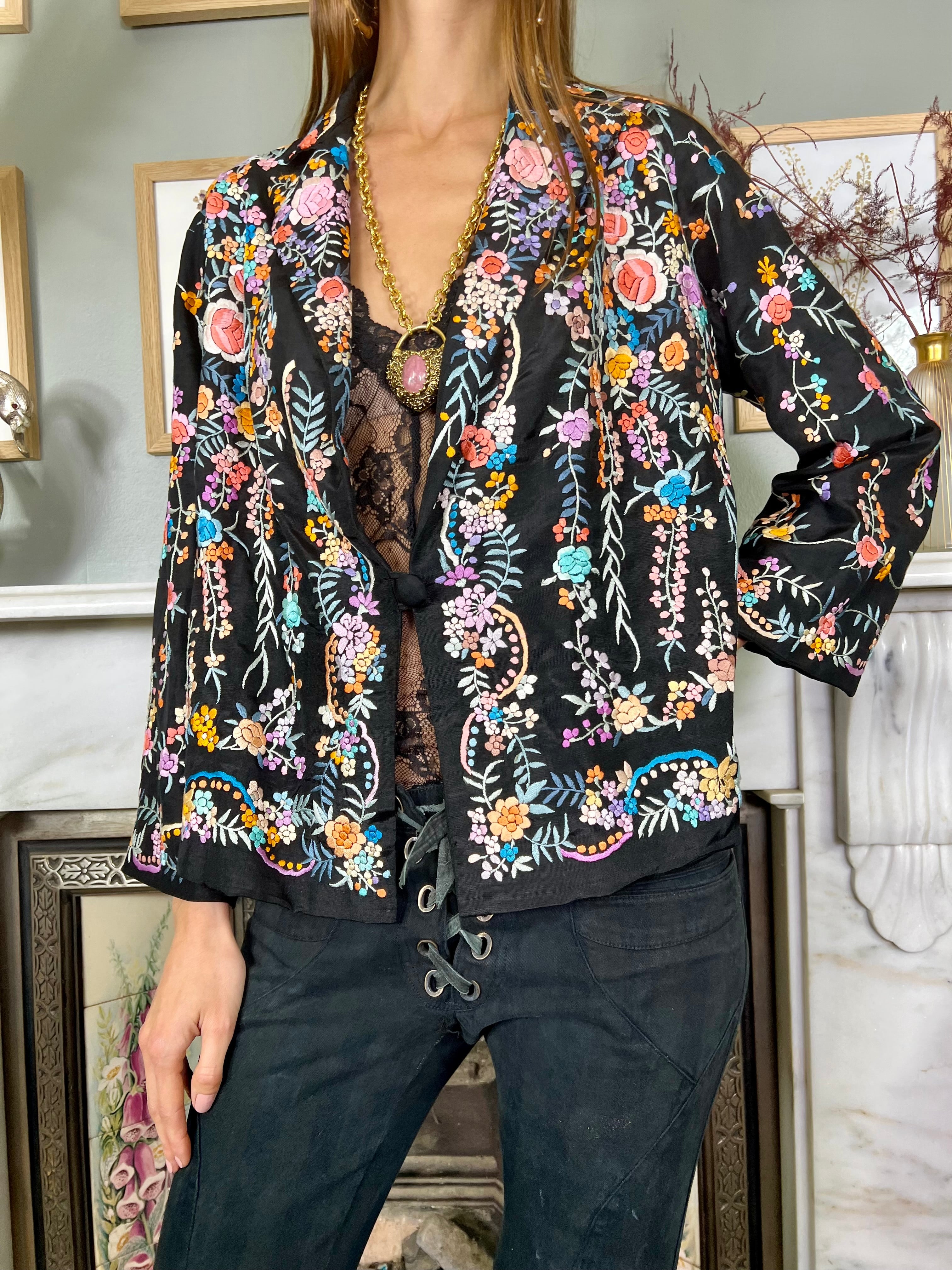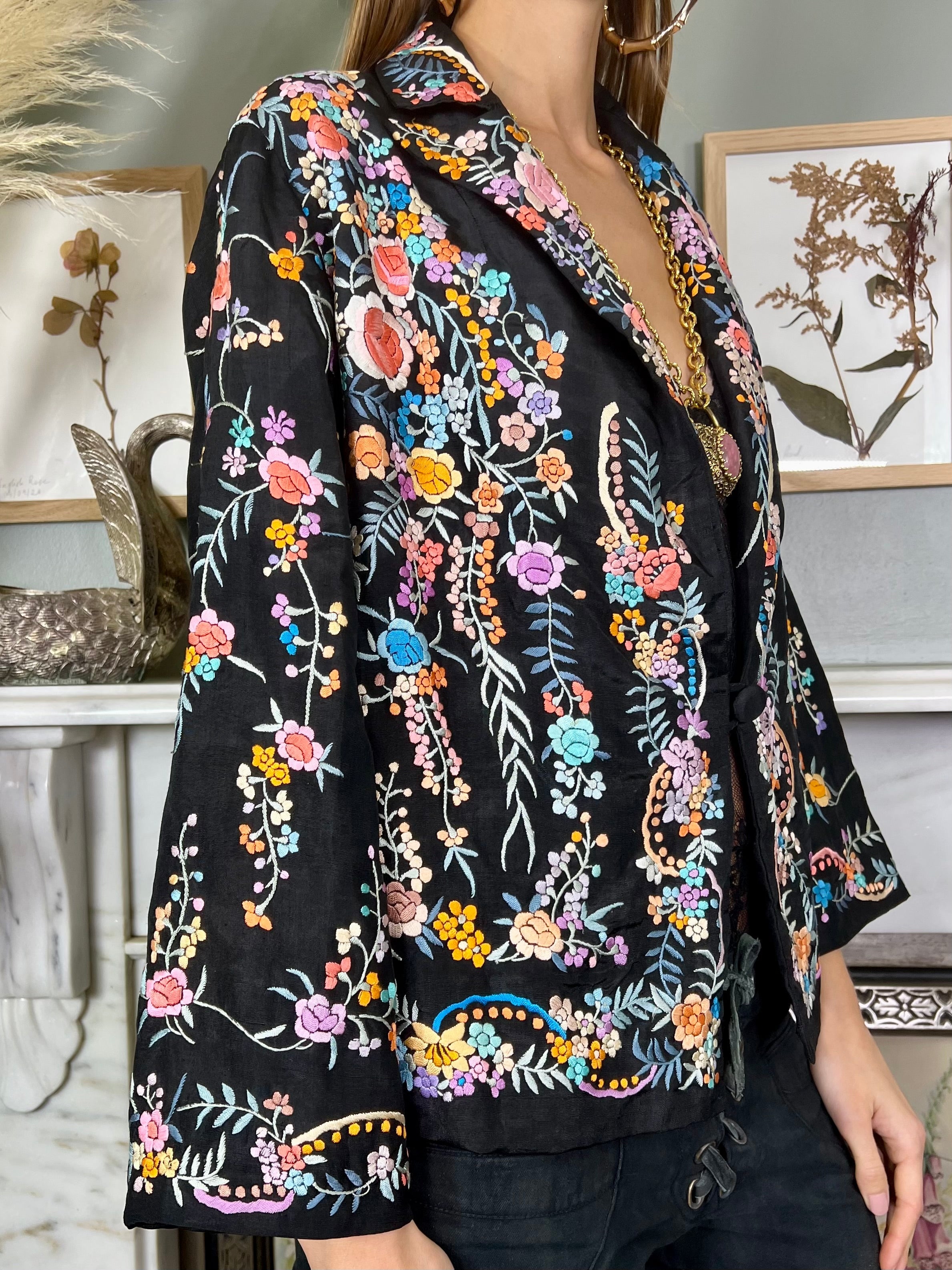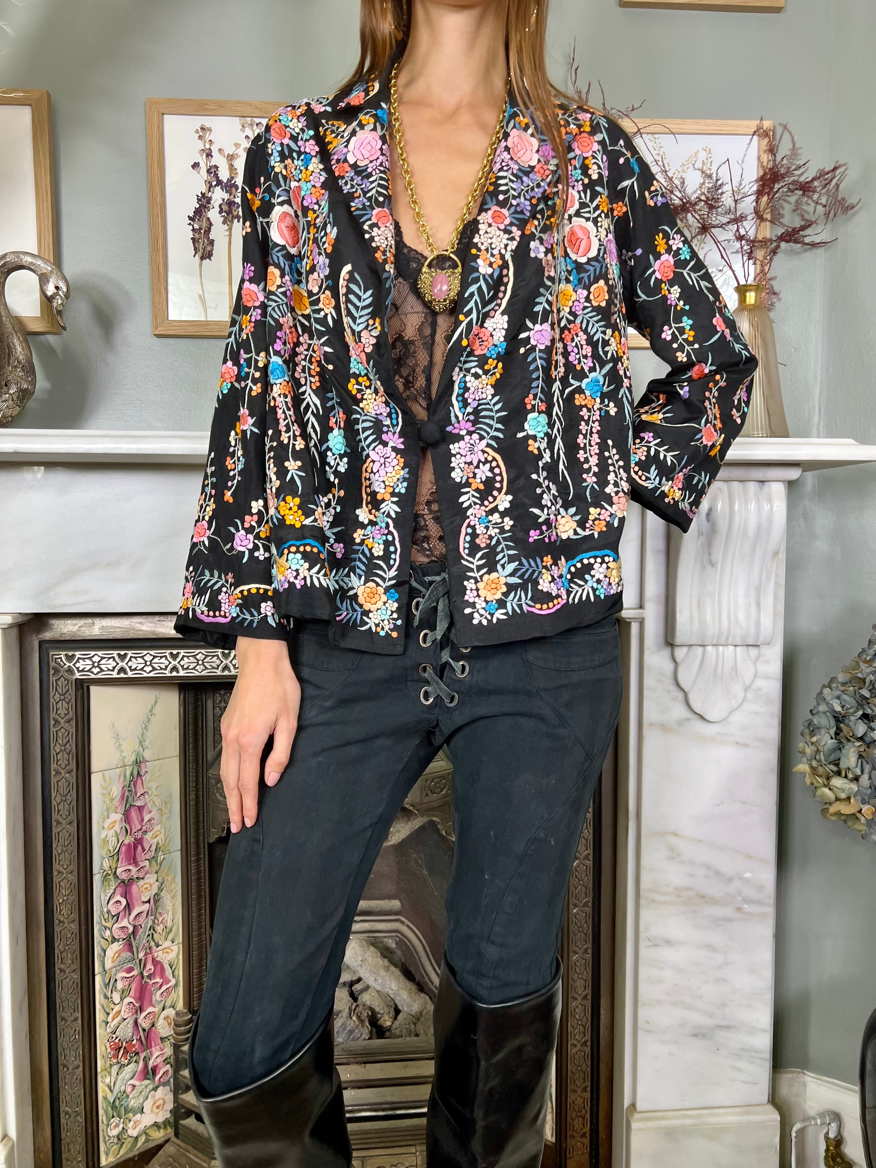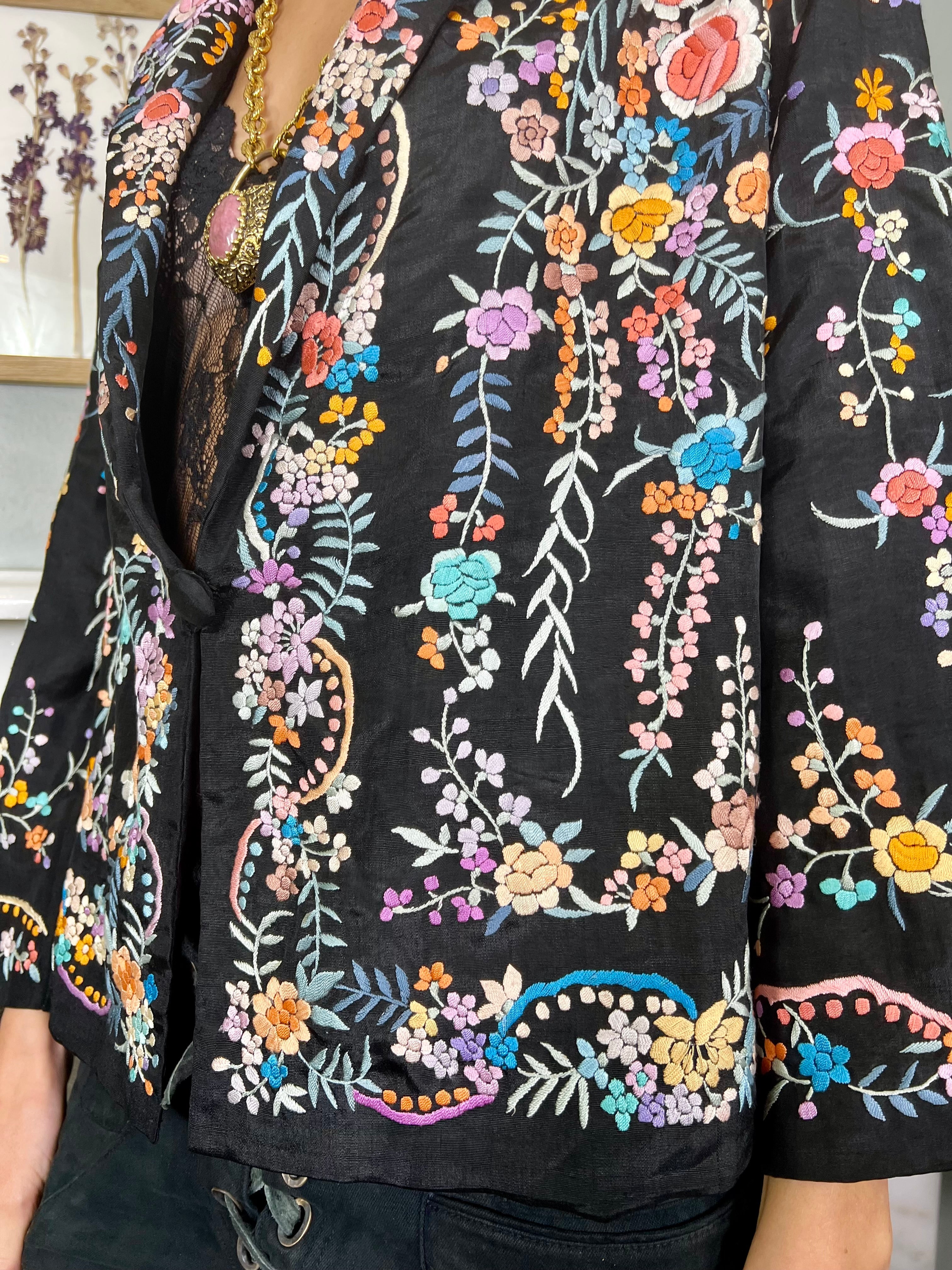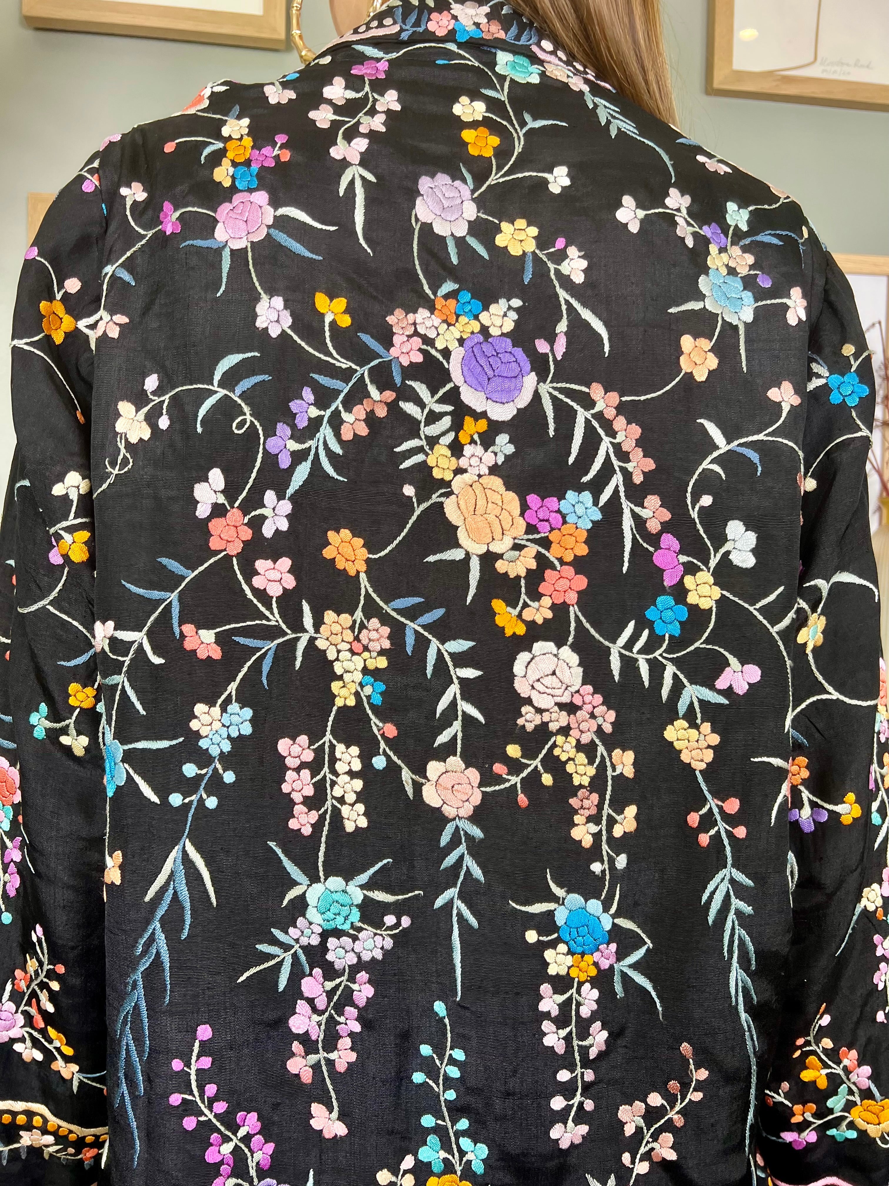 Absolutely gorgeous Chinoiserie jacket from the 40s. Has long sleeves, lapels, a straight fit and a front covered button. The hero is the lush embroidery throughout in vibrant colours. Lined in black.