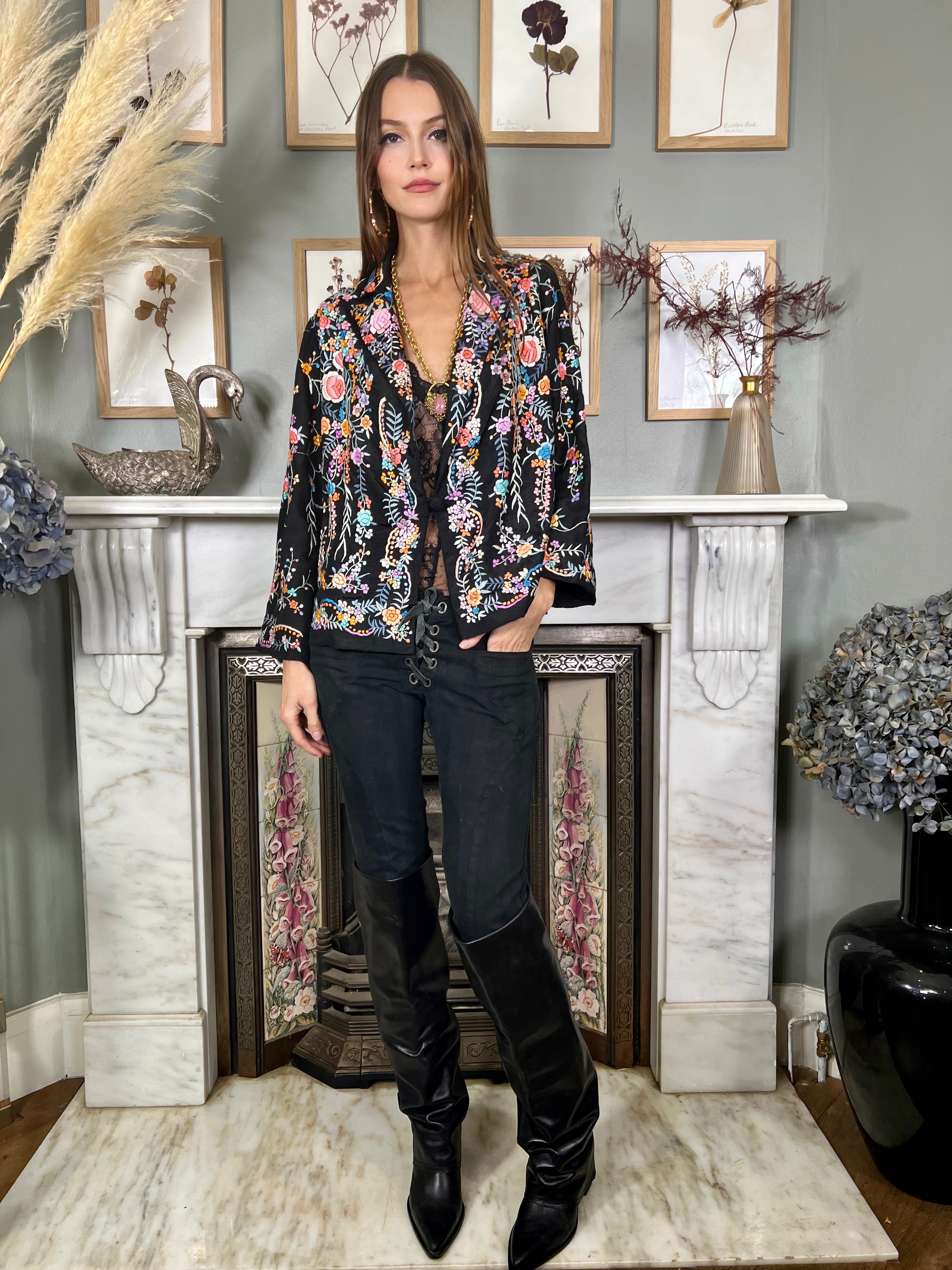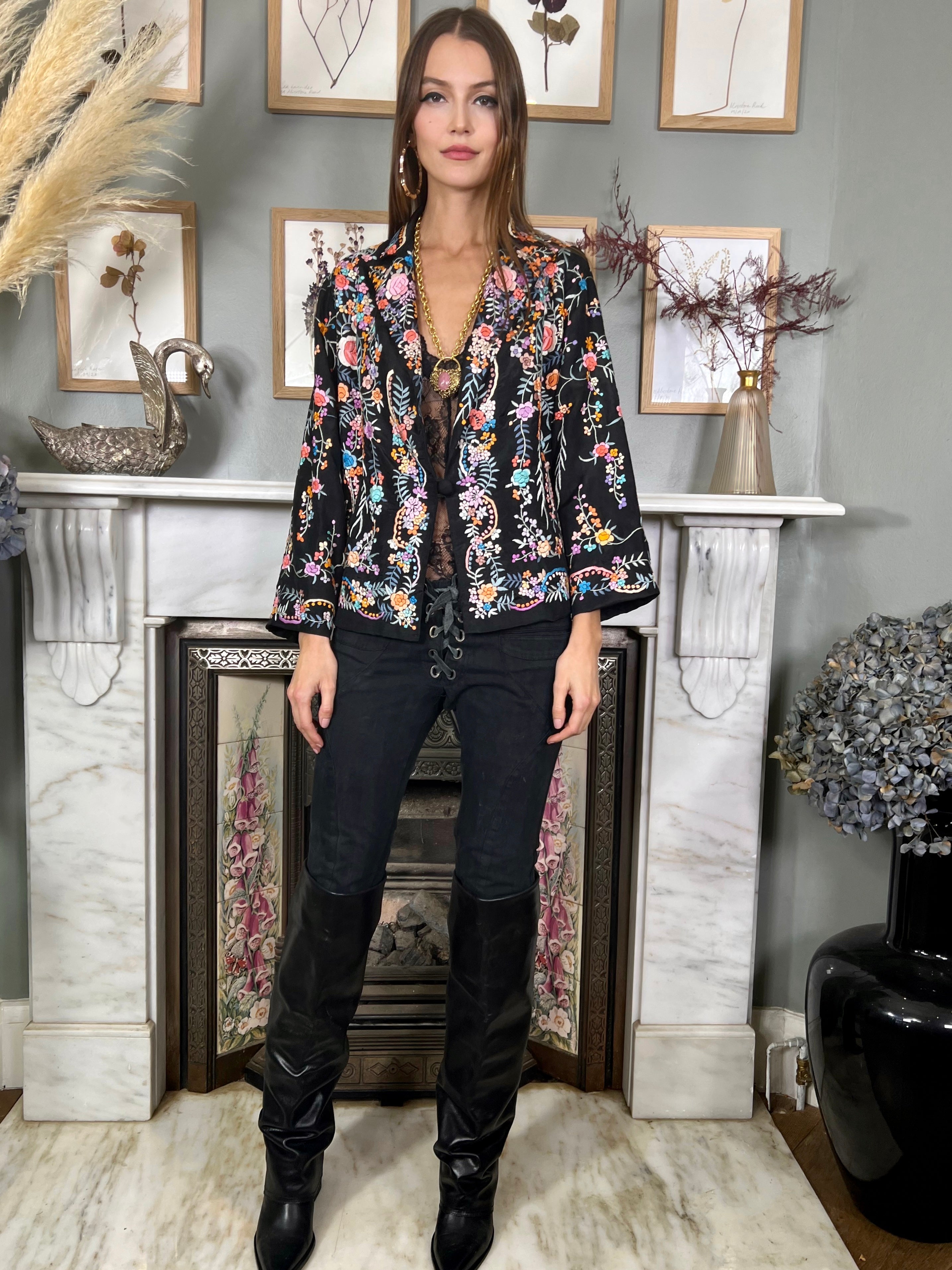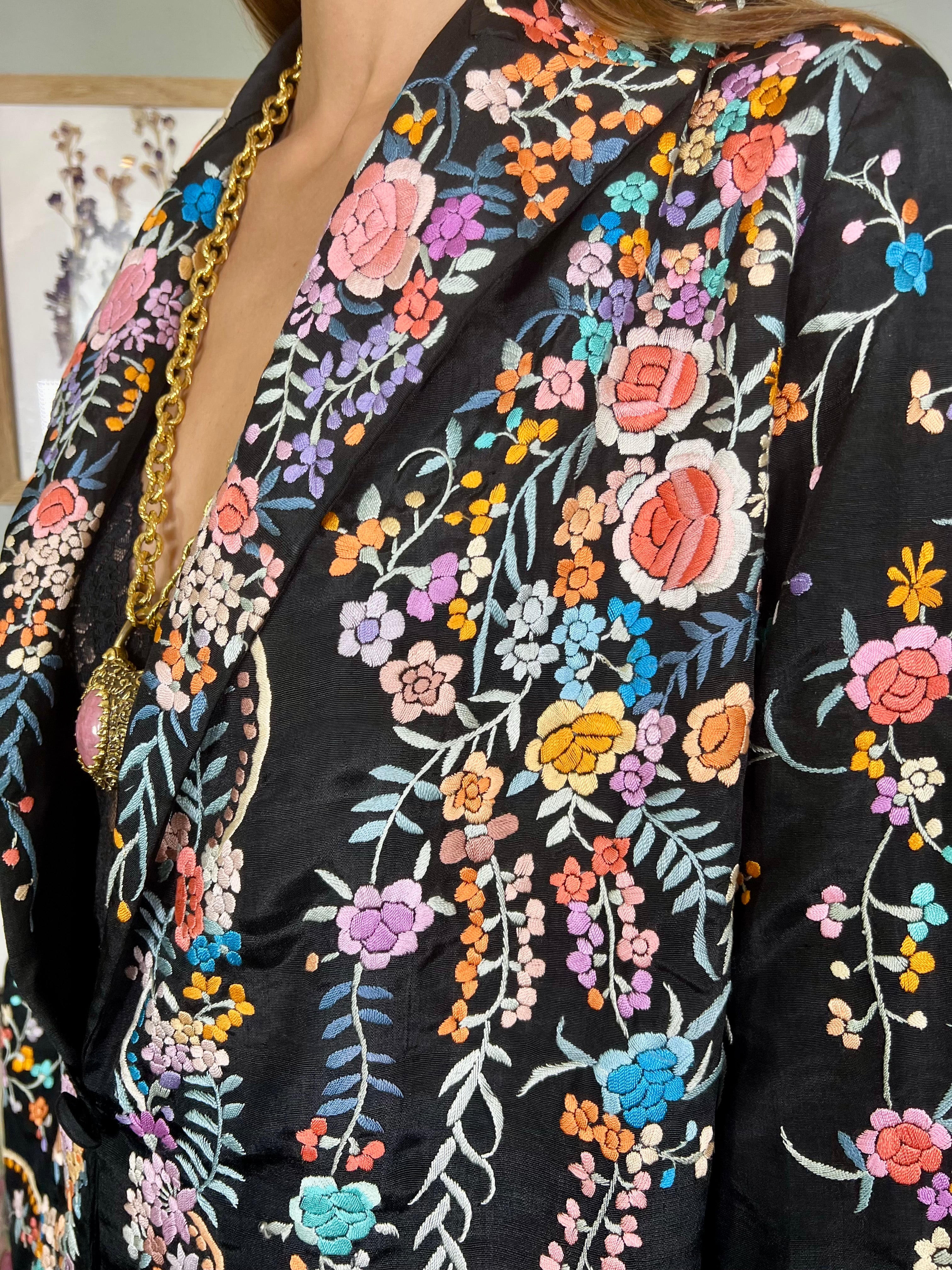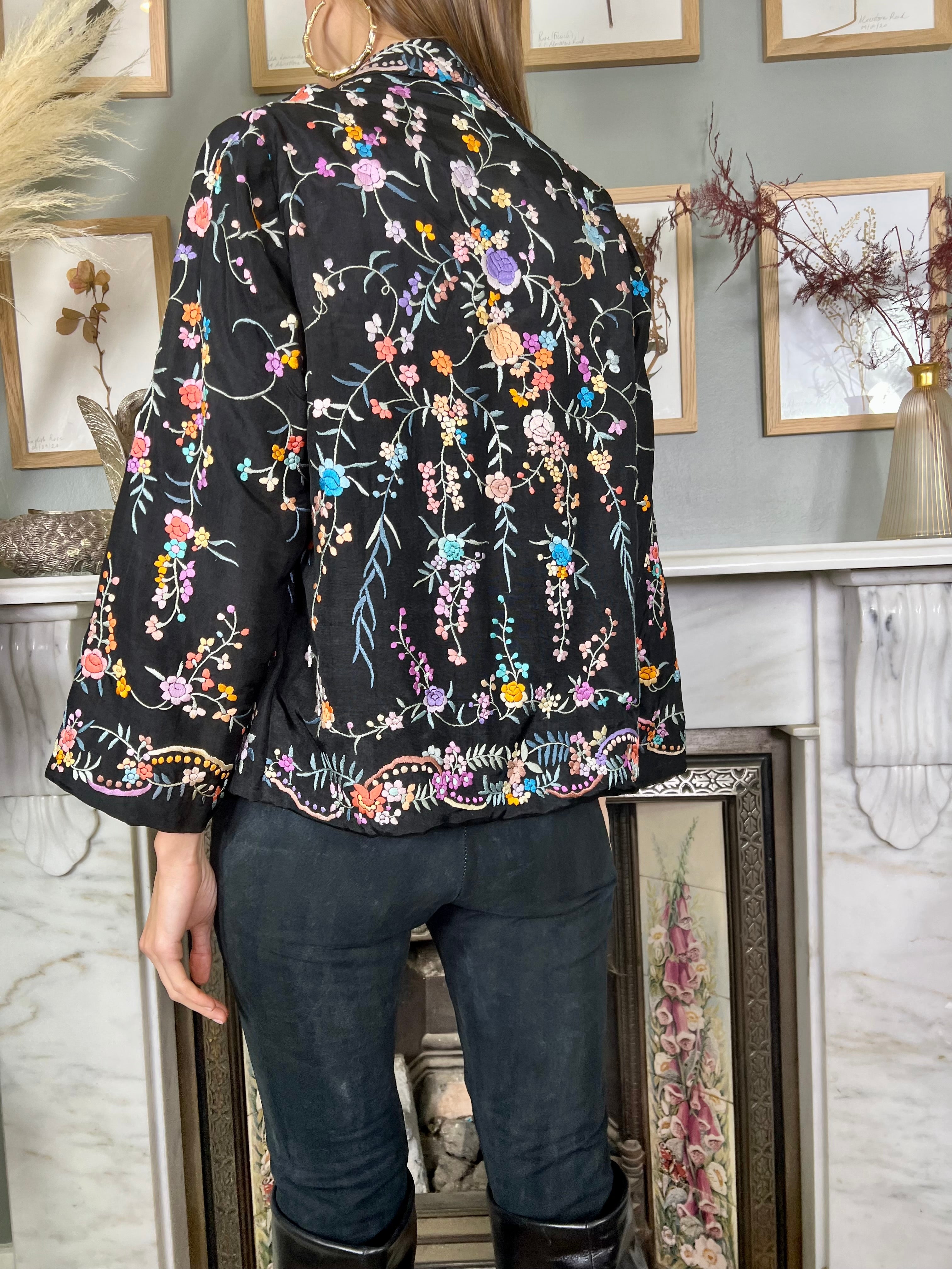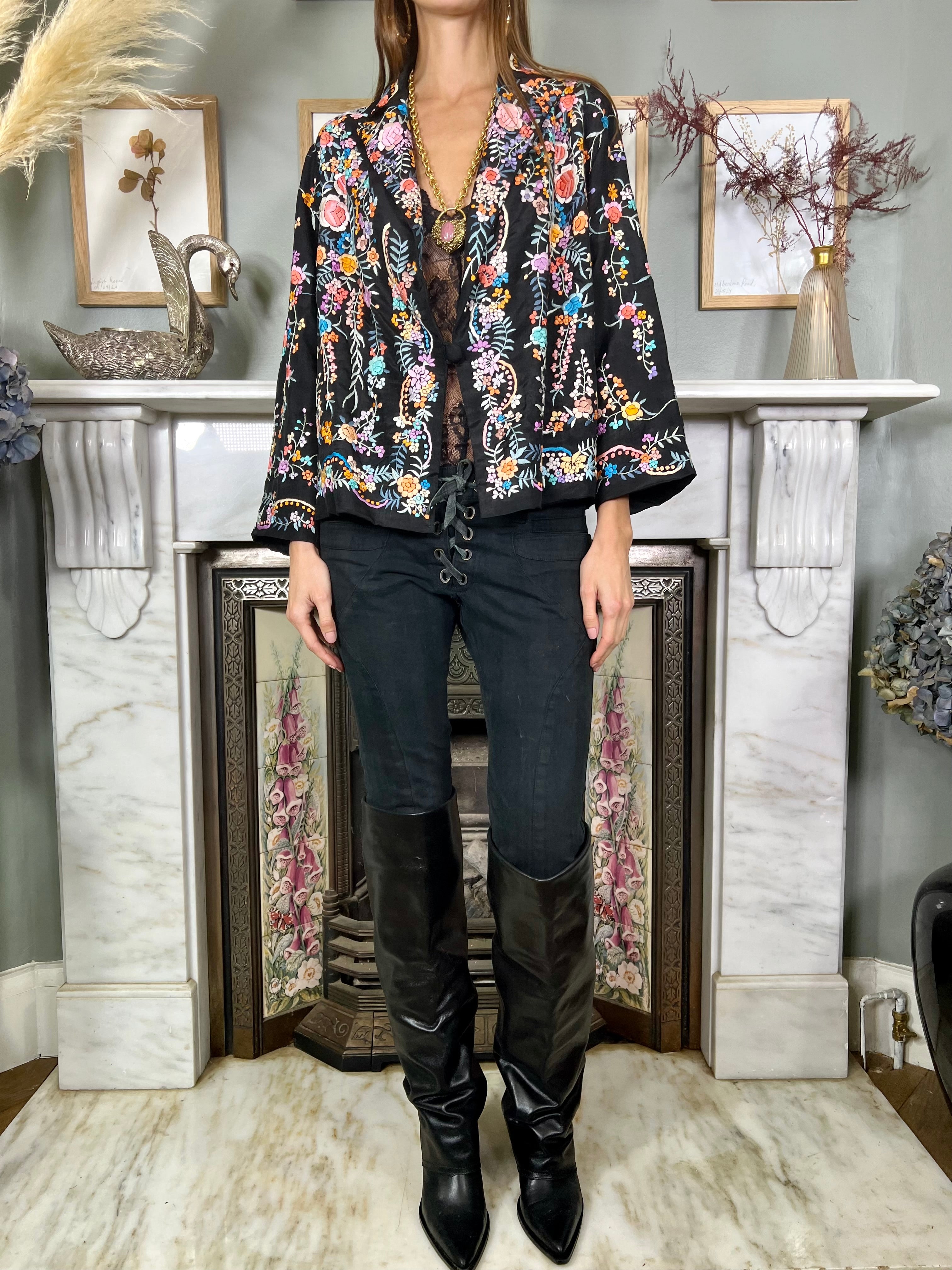 Absolutely gorgeous Chinoiserie jacket from the 40s. Has long sleeves, lapels, a straight fit and a front covered button. The hero is the lush embroidery throughout in vibrant colours. Lined in black.