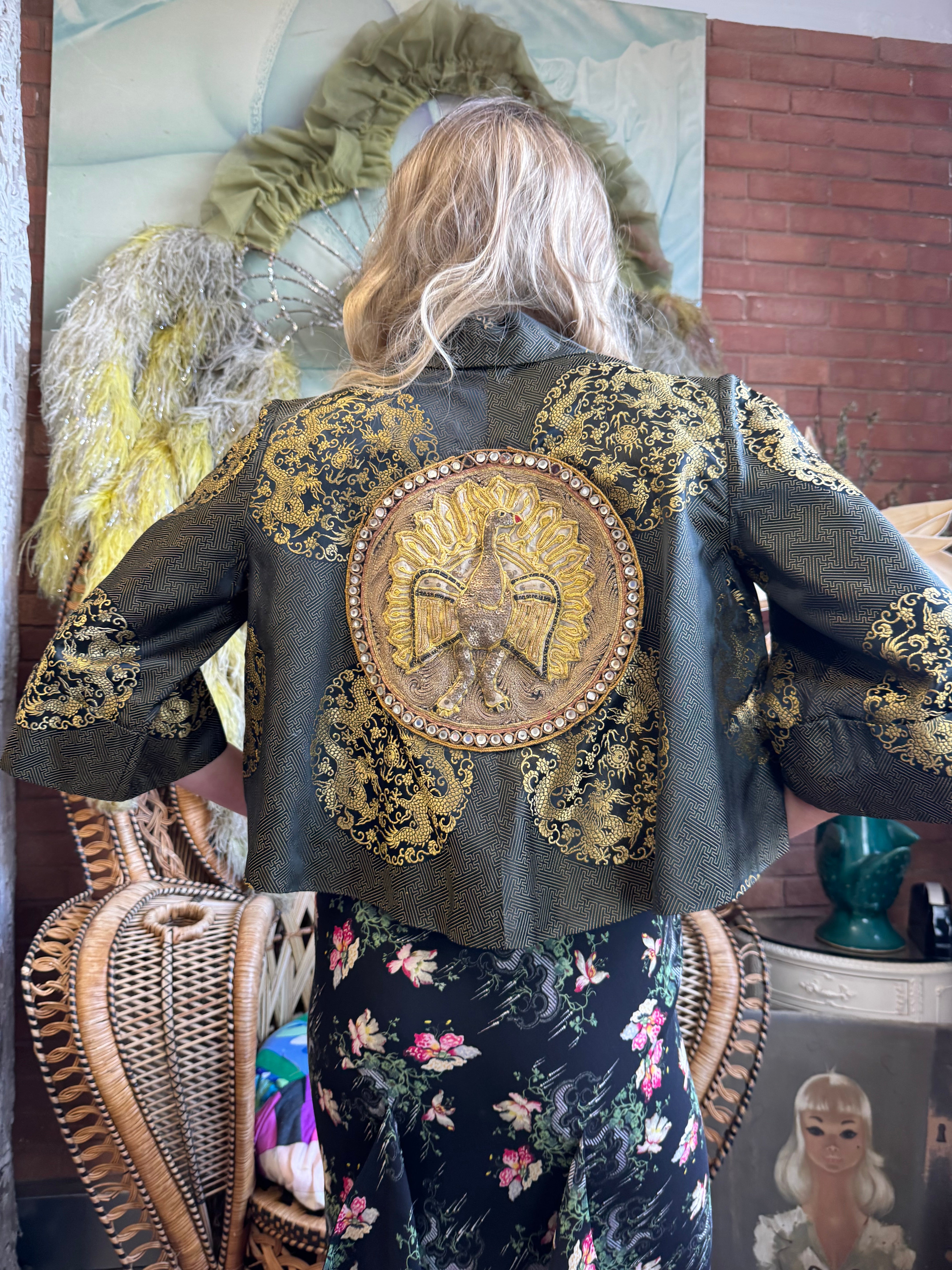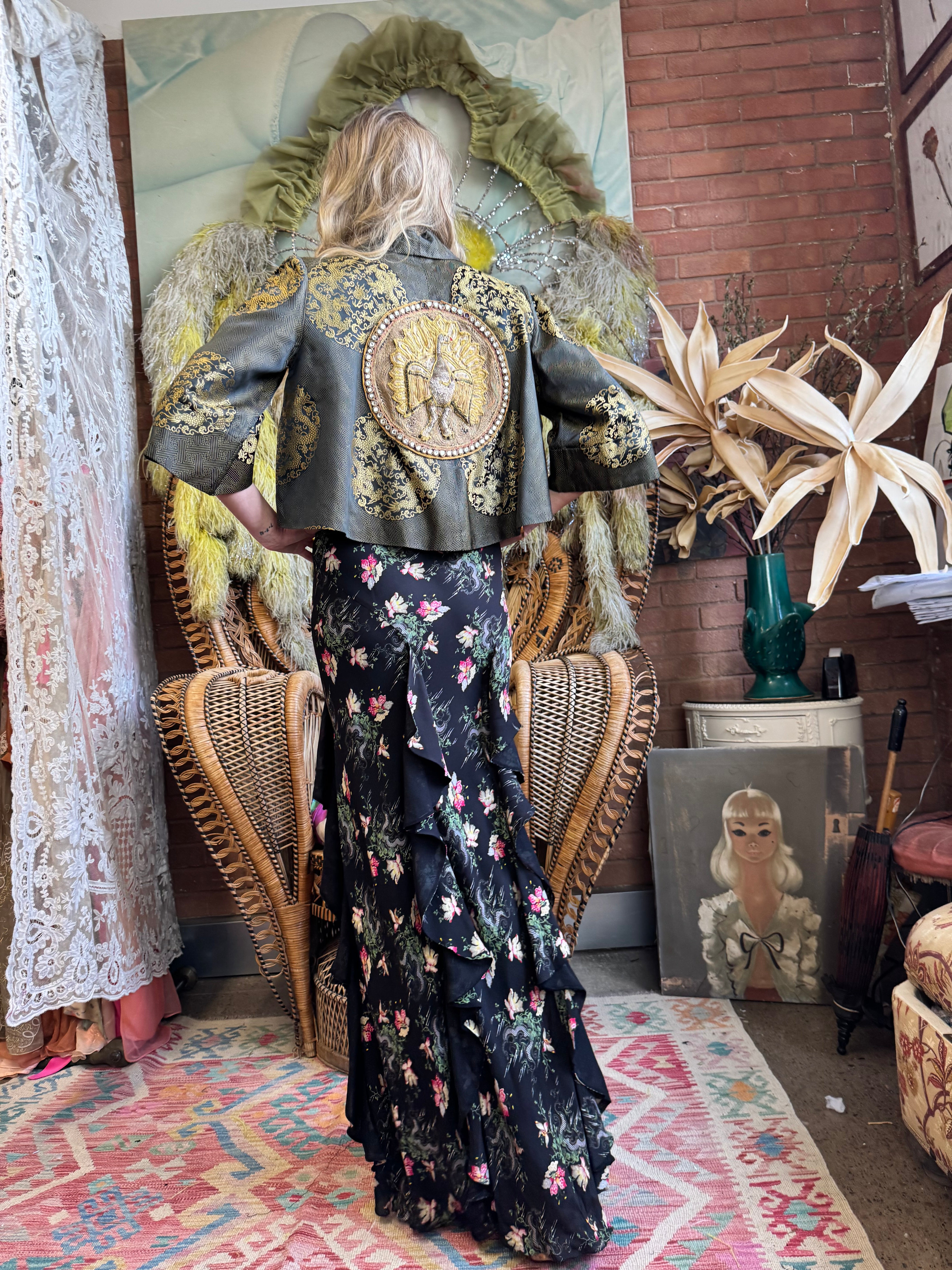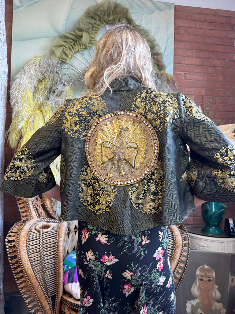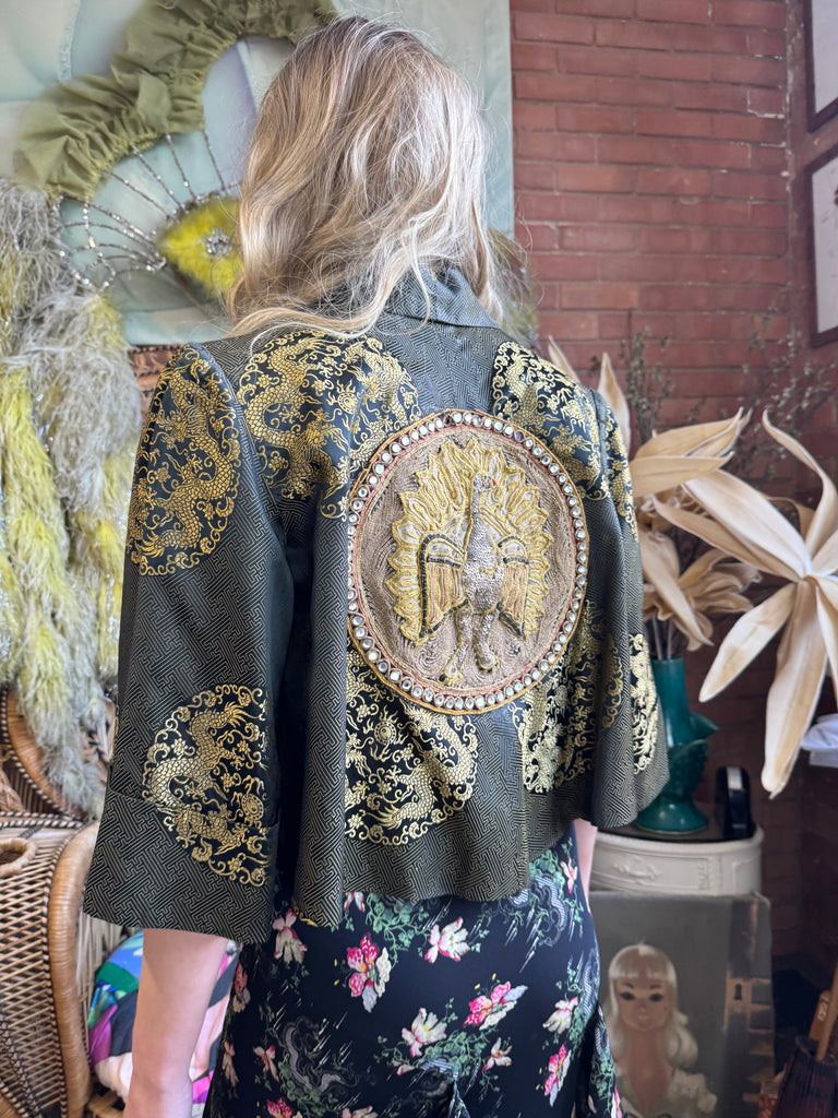 Expertly crafted in the 1940s and reworked by us. The Melda silk Oriental jacket adds a touch of elegance to any outfit. Featuring wide sleeves, a gold print, and a stunning embroidered peacock on the back, its fully lined silhouette exudes sophistication and style. Elevate any outfit with this one-off versatile jacket.
