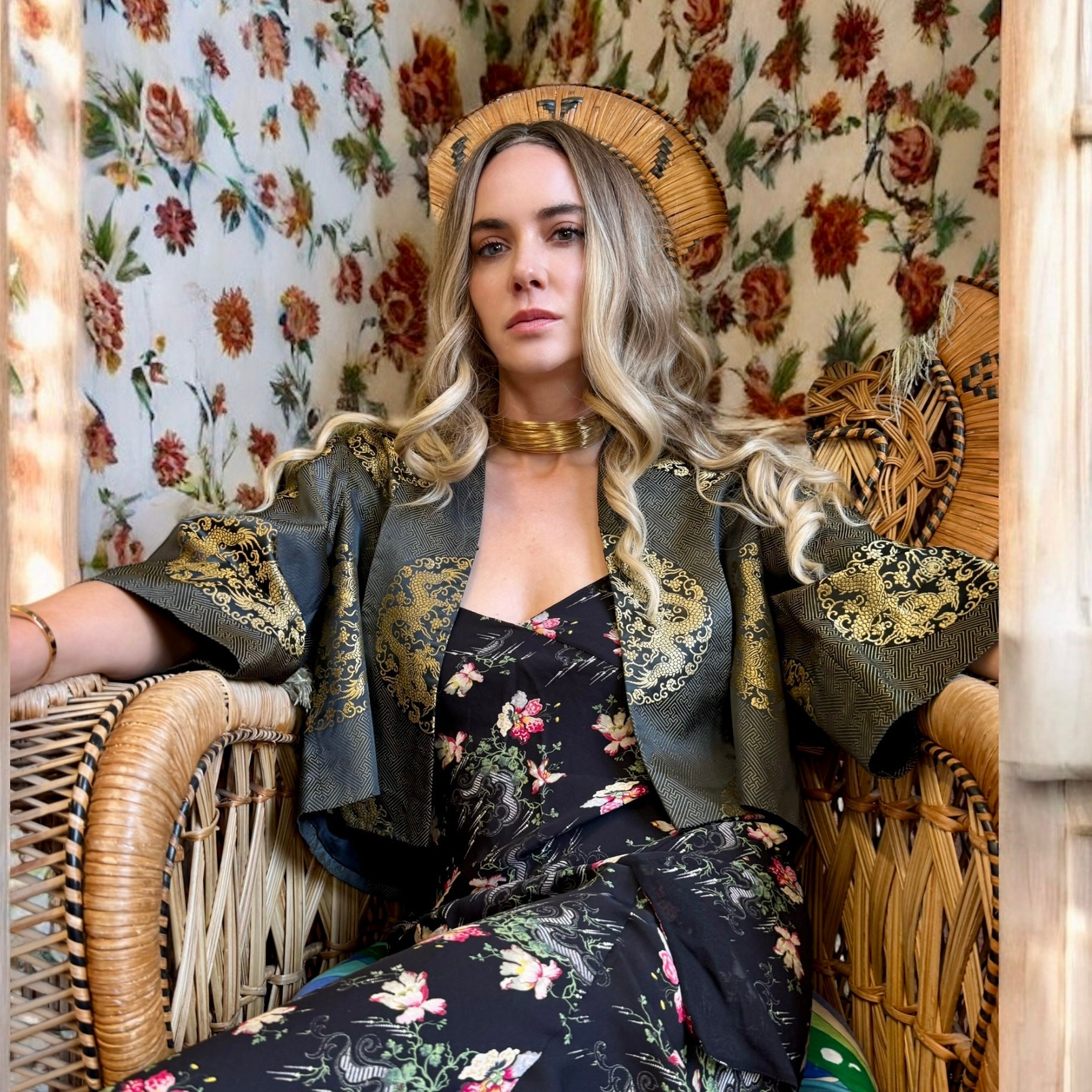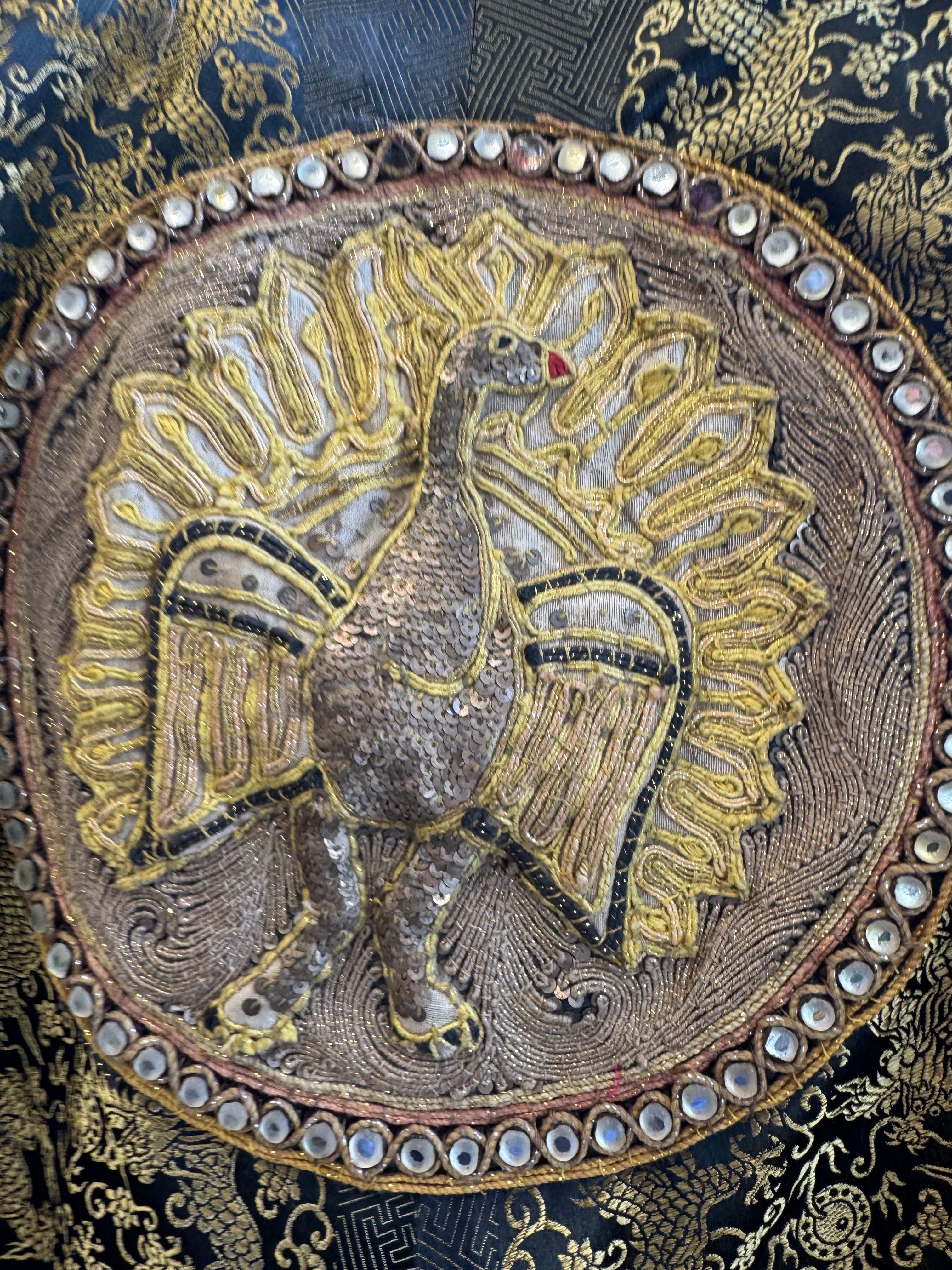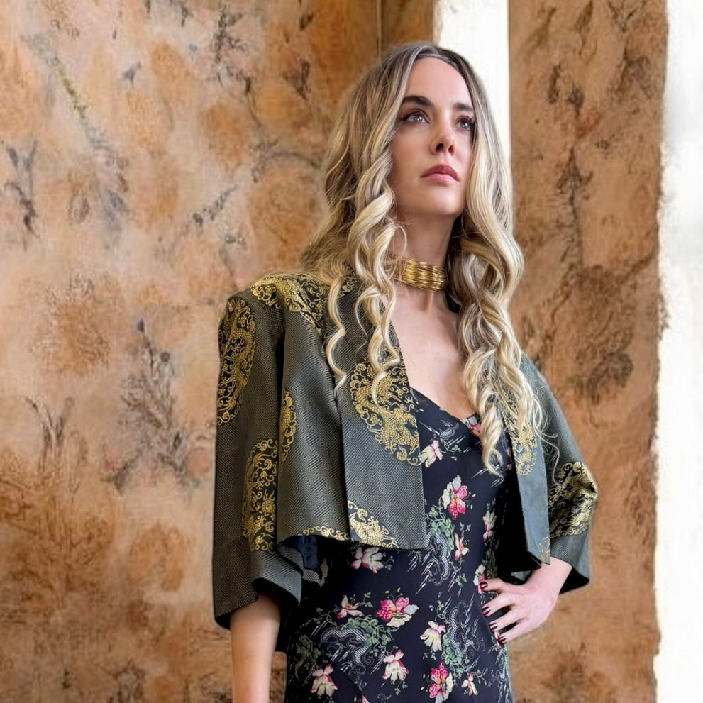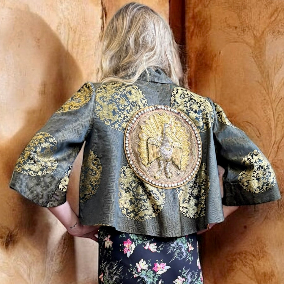 Expertly crafted in the 1940s and reworked by us. The Melda silk Oriental jacket adds a touch of elegance to any outfit. Featuring wide sleeves, a gold print, and a stunning embroidered peacock on the back, its fully lined silhouette exudes sophistication and style. Elevate any outfit with this one-off versatile jacket.