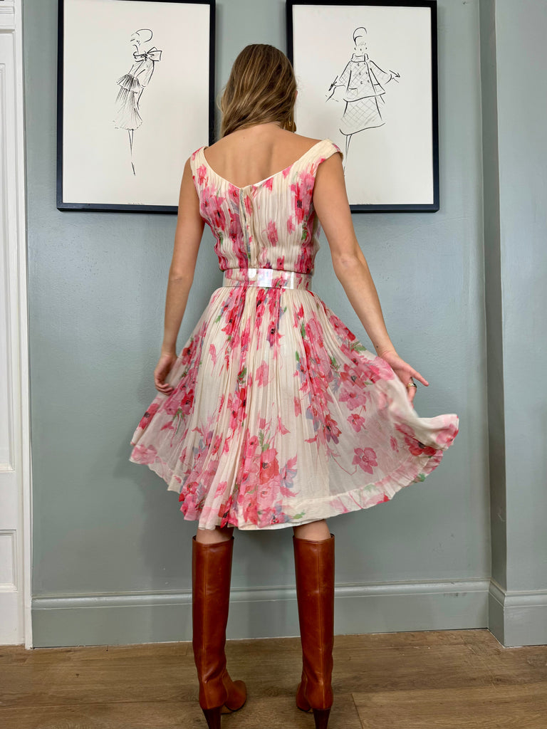 Discover the ethereal beauty and timeless elegance of this chiffon dress. Made from luxurious 40s floral poppy print chiffon, this dress features a scoop neckline, pleated design, and a tailored waist for a flattering fit. The floaty skirt falls gracefully to the knee and a back zip provides easy closure. Perfect for any special occasion. Comes lined.