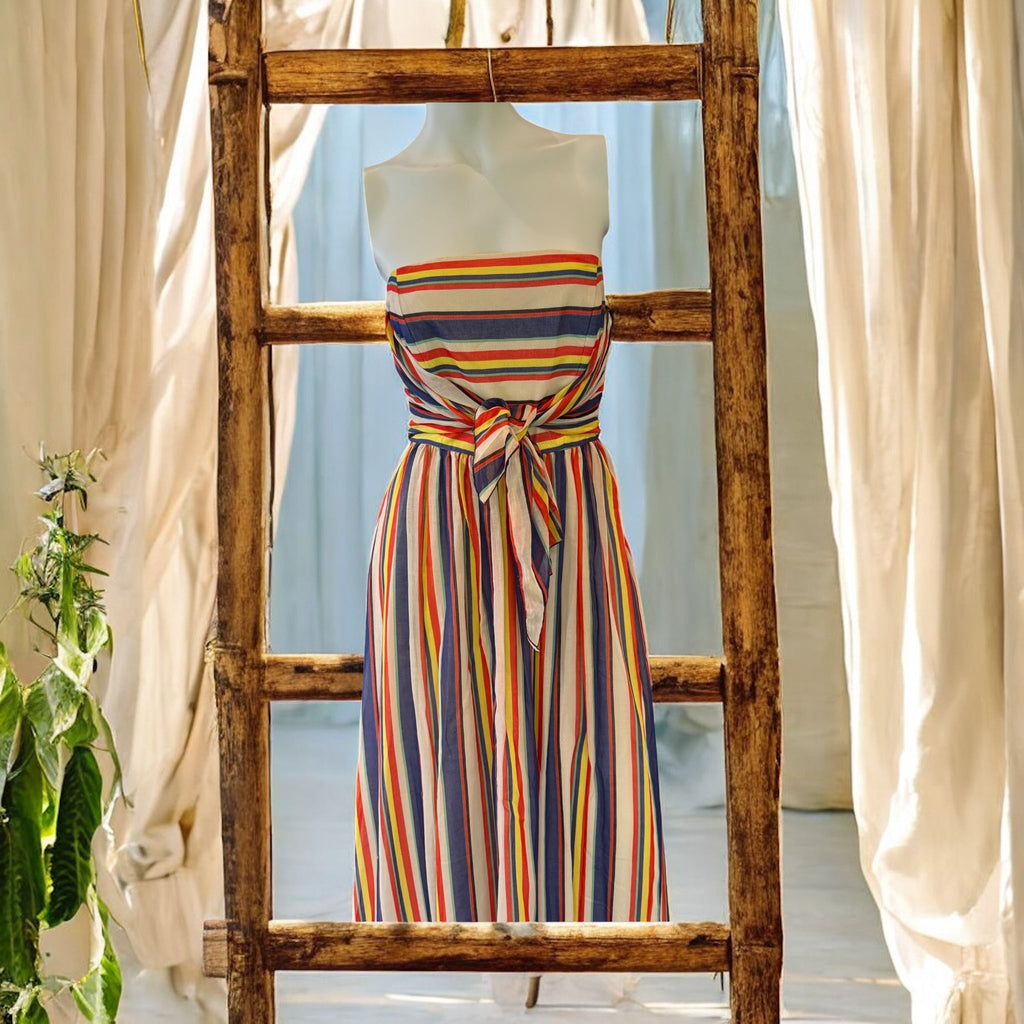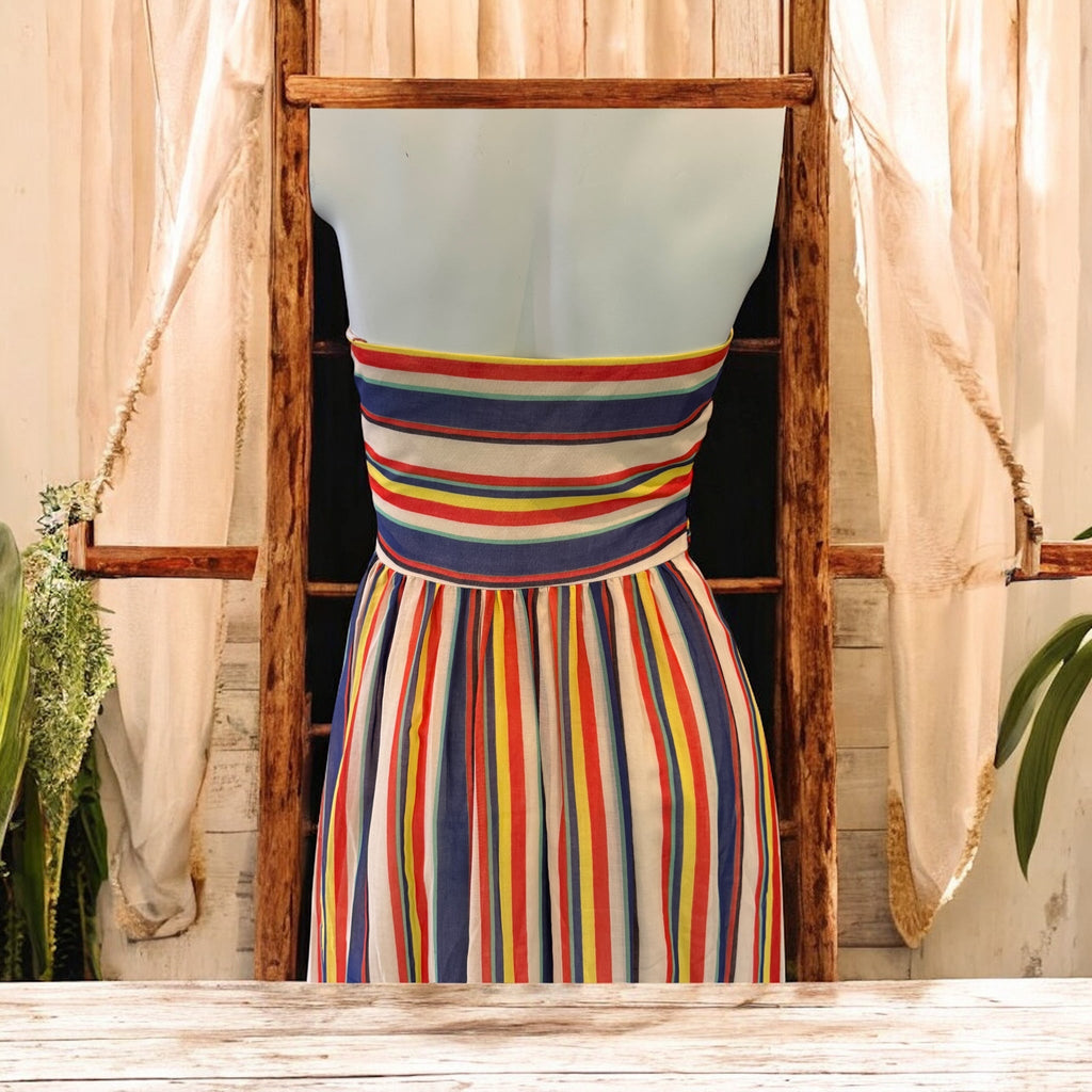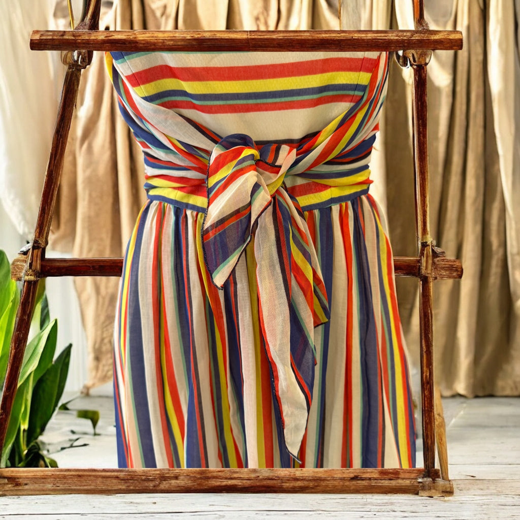 This exquisite 1940s original design showcases a bustier-style burned corset paired with a soft silk pleated skirt, finished with a delicate front tie. Featuring a back zip and full lining, this striped silk dress combines vintage elegance with comfort, making it an ideal choice for summer occasions.
