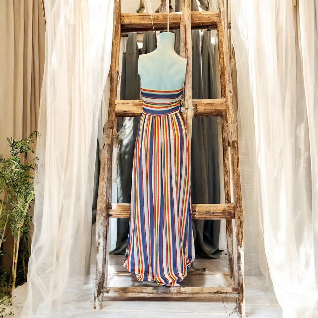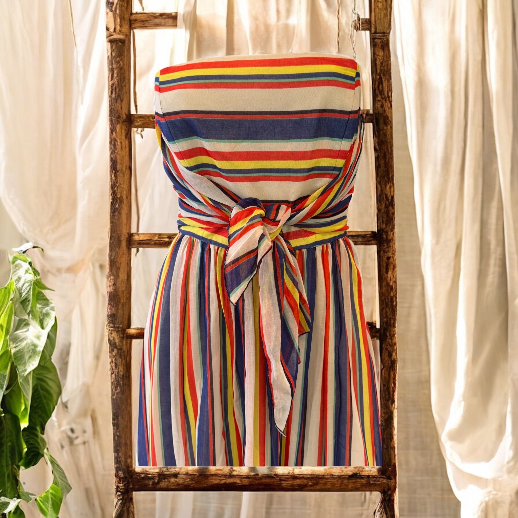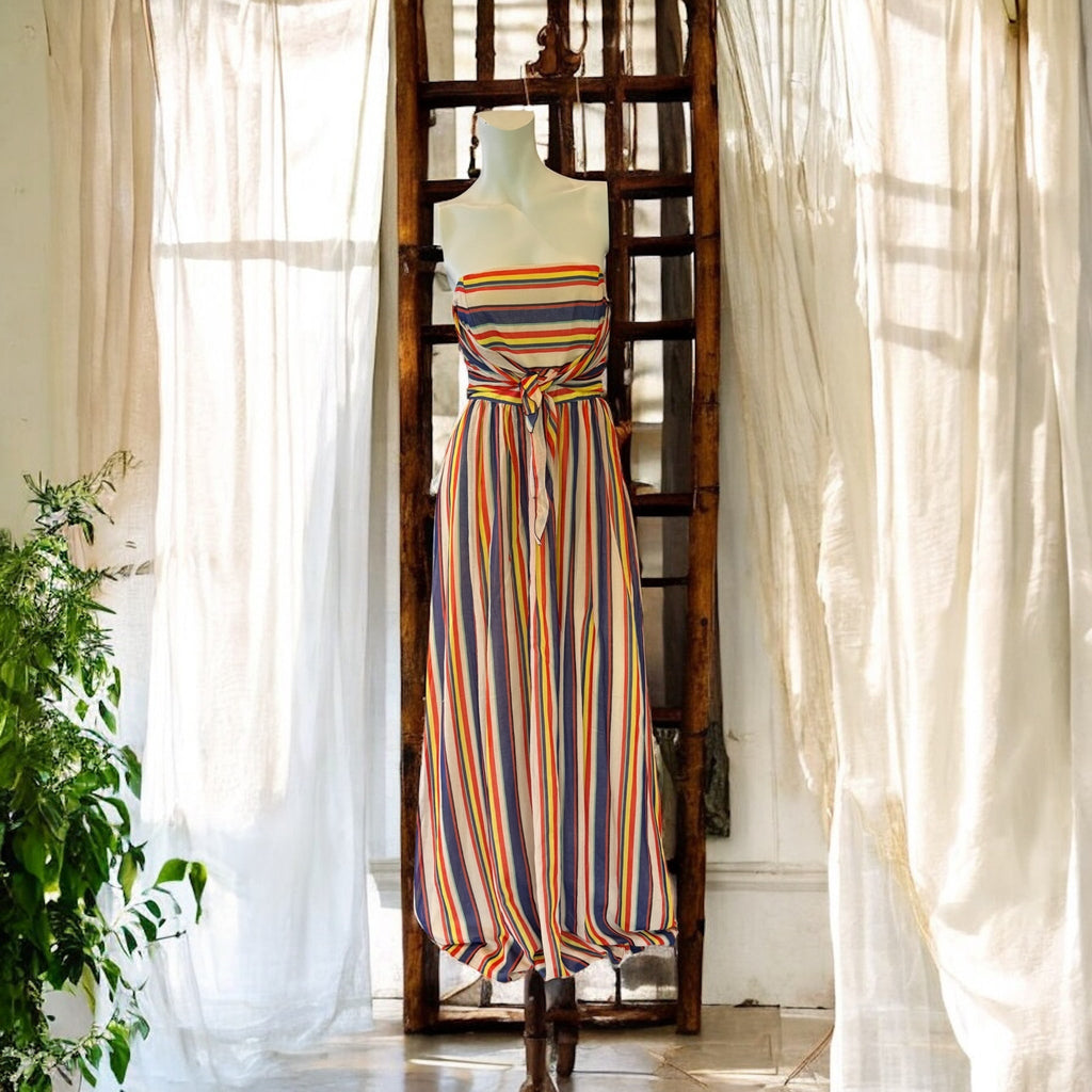 This exquisite 1940s original design showcases a bustier-style burned corset paired with a soft silk pleated skirt, finished with a delicate front tie. Featuring a back zip and full lining, this striped silk dress combines vintage elegance with comfort, making it an ideal choice for summer occasions.