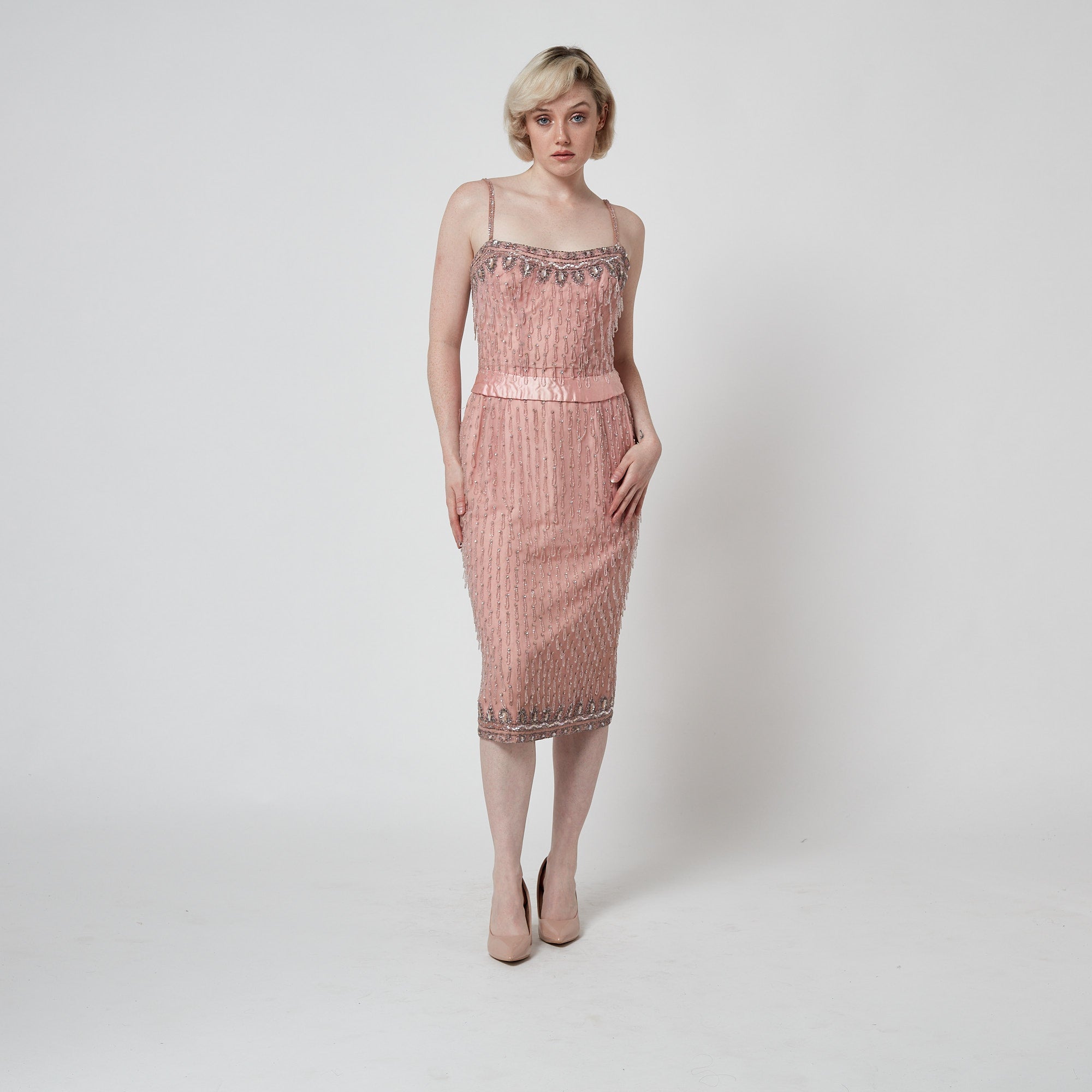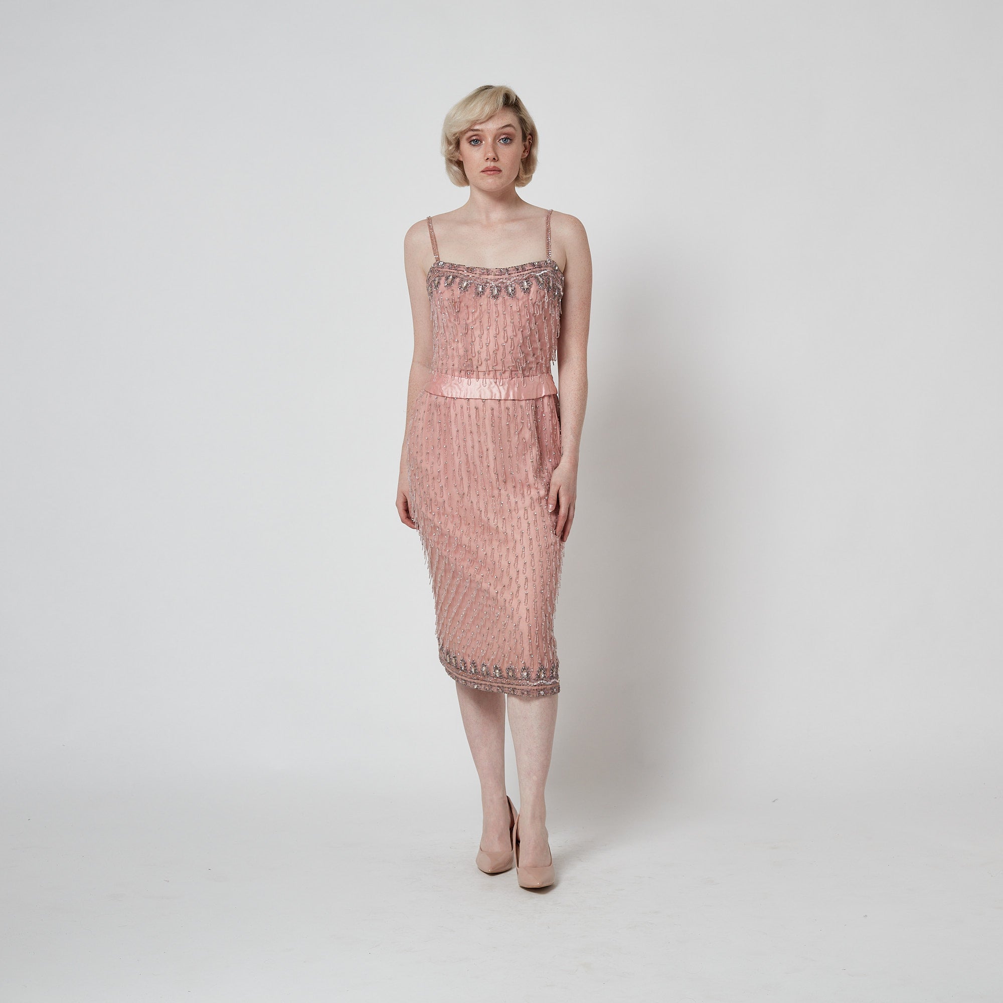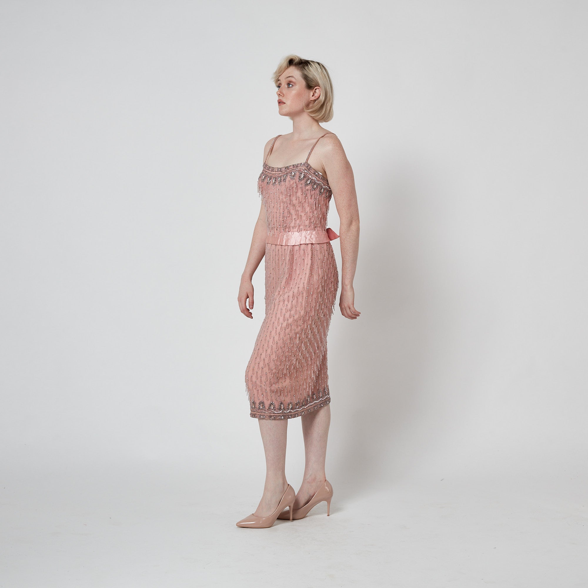 Couture made in the 1950s, this truly stunning pale pink gown has retained all of the delicate intricacy of when it was first designed. With elaborate bead work, it is cut to a fitted, body skimming silhouette with spaghetti straps. The dress is constructed from stiff silk and overlaid with chalk pink mesh. The mesh fabric is embroidered all-over with heavy intricate beading; loops of transparent beads hang from sequins the full length of the piece, whilst dark grey beads form glittering shapes along the bust and bottom hem that echo the curves of the tailoring. The gown is boned the whole way around and features an underwired bra and modesty straps inside the bodice for extra support. The bust is also lined with nude mesh. It fastens at the rear with a pink tonal zip and hook-and-eye clasp. The thin straps are adorned with two rows of pearlescent sequins. This dress is fully lined in cream silk. A final stand-out feature is the bubble-gum pink silk-satin sash that adorns the waist, christened by a lovely, typically ‘50s flat bow at the centre of the back.