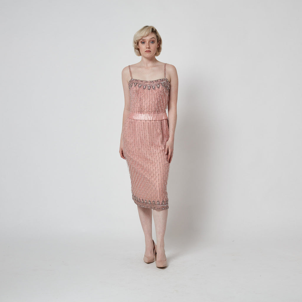 1950s Couture Pink Beaded and Sequin Dress with Mesh Overlay
