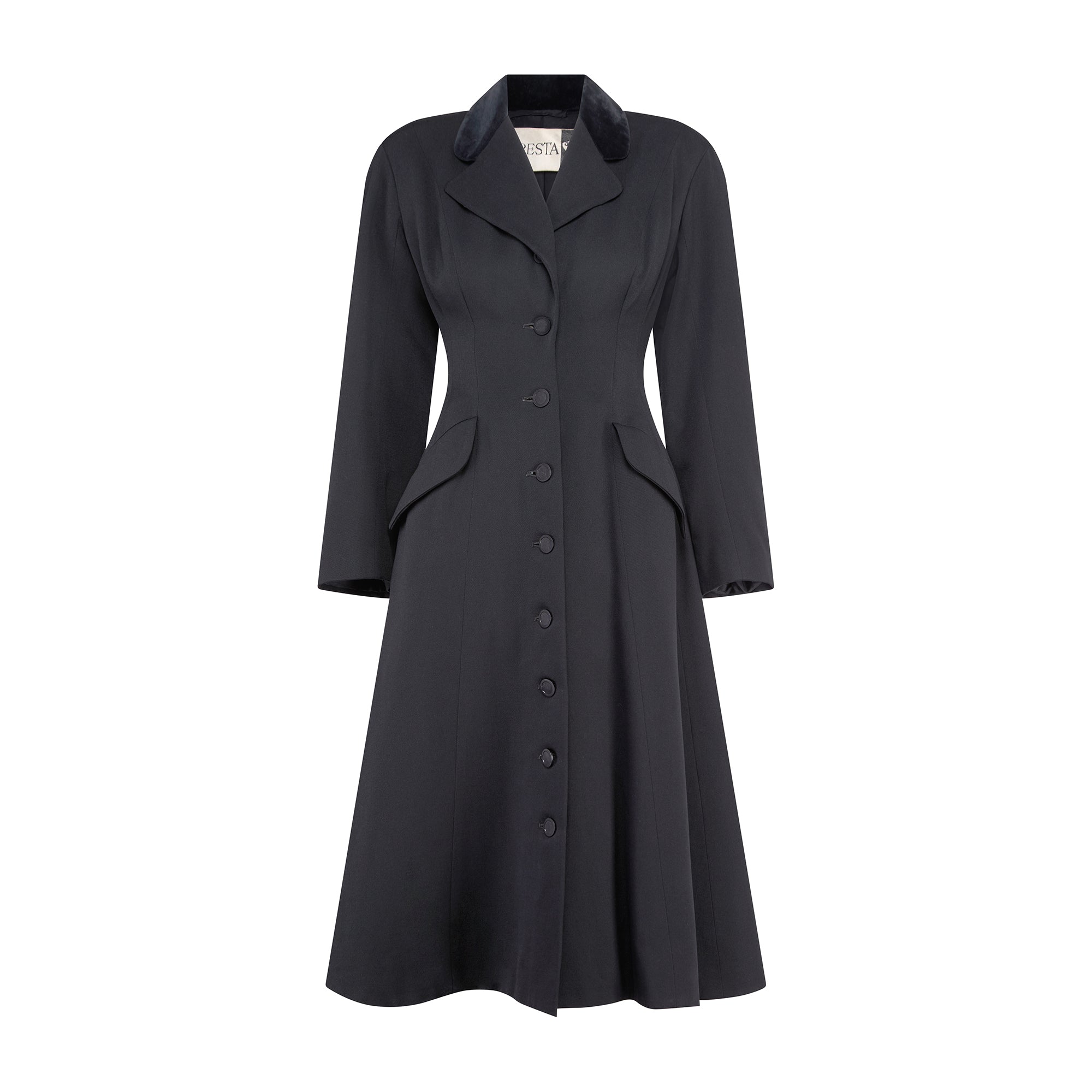 Tailored from smooth, inky black wool, it has a gentle V-neckline, finished with a black wool and black cotton velvet collar. The 3/4 length silhouette nips in at the waist and flares out dramatically at the skirt - a traditional riding coat shape that allows for the person to sit on horseback. There are eight ridged plastic black buttons running the length of the front. Two flap pockets side at an angle atop the hips. The coat is lined with black satin for a comfortable wear.