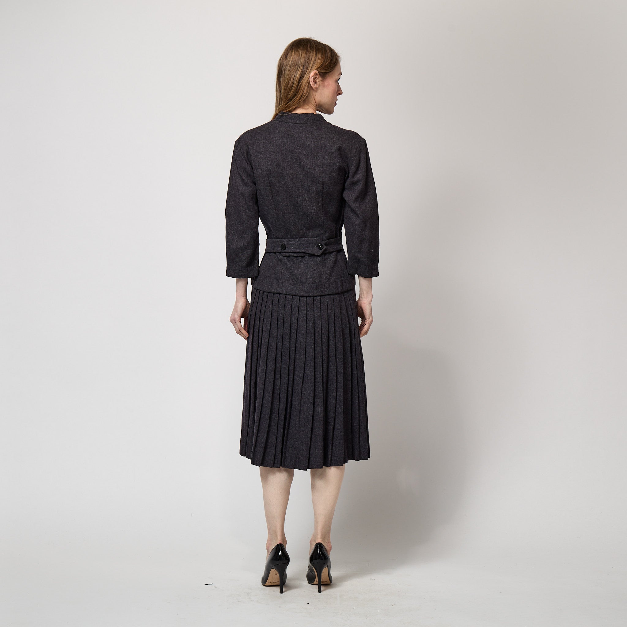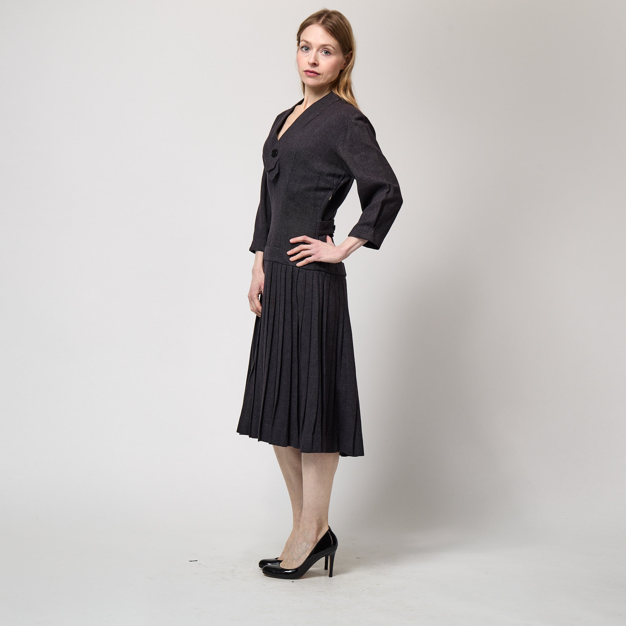 1950s Mottled Grey Wool Dress with Pleated Drop Waist Skirt