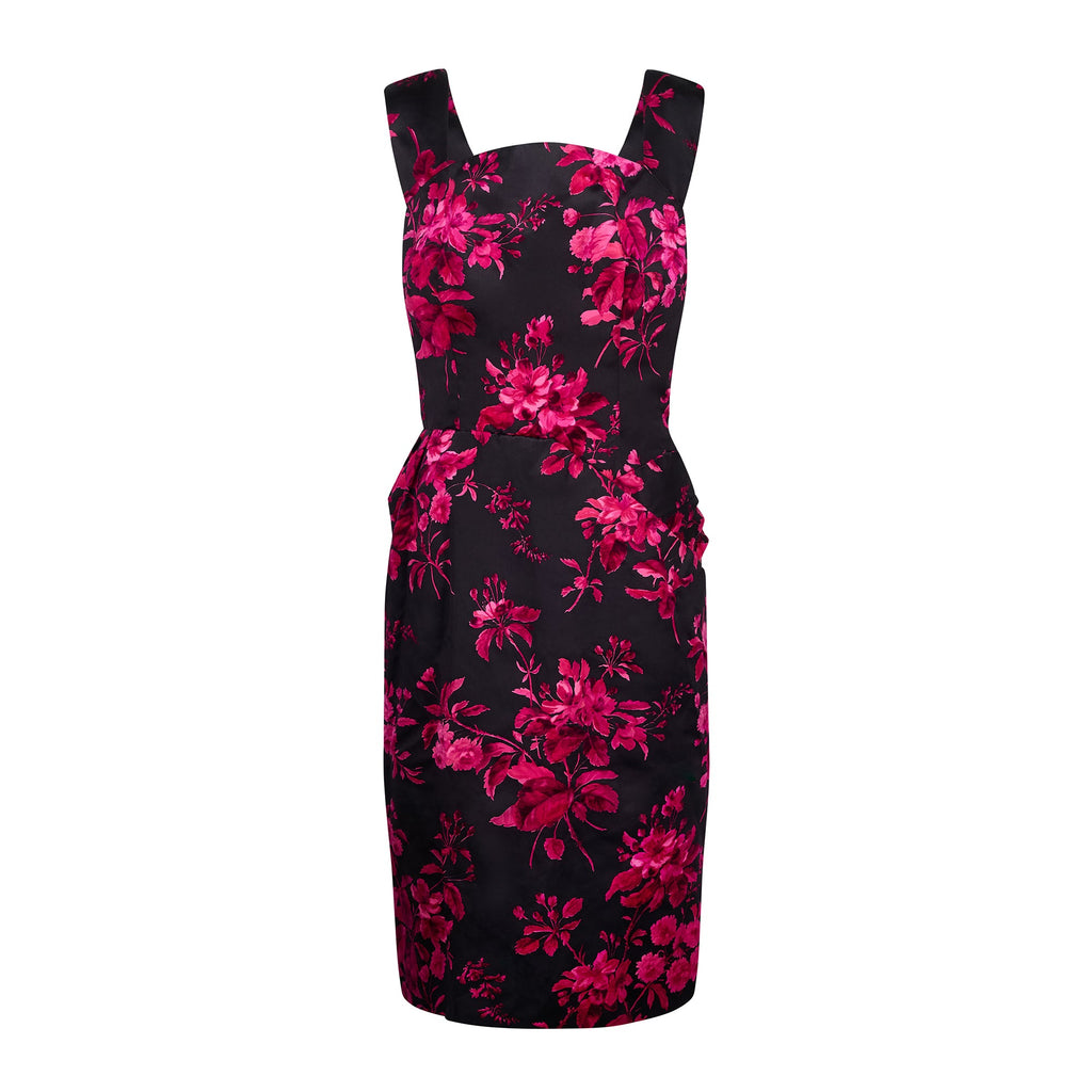 Tailored to a classic late 1950s, early 1960s shift silhouette, with a nipped in waist and pencil skirt. Hartnell’s exceptional eye-for-detail is apparent from the unusual high, curved neckline and cross-over V-shaped back. The fabric is stunning: smooth black silk detailed with vibrant roses in fuchsia and deep purple. The roses are detailed with flocking which adds soft texture to the piece. The inside of the dress has a boned lining crafted from a thick, dark khaki green silk. The waistband is curved and meets a gathered panel of fabric on the left side of the waist. The dress is lined in black silk throughout. It fastens under the right arm with a hidden tonal zip and hook-and-eye clasp.