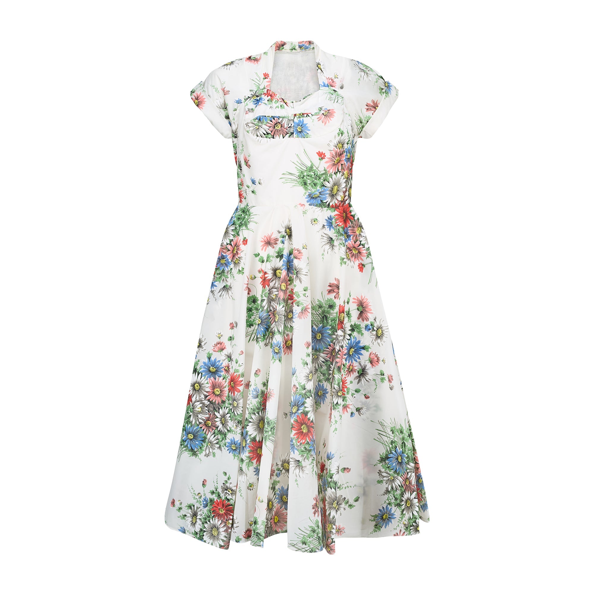 This true vintage 1950s dress is tailored from an unusually textured nylon which is crisp, structured and holds it shape well. It is printed with vibrant daisies in red, white, blue and coral with bright yellow centres, set against a white background. It has a classic 1950s silhouette with a fitted bust, nipped-in waist and a full, swirling skirt. The bust is gathered and there are short cap-sleeves with turned-up cuffs. It is lined with white satin throughout for a luxurious, comfortable wear and fastens with a hidden tonal zip under the left arm.