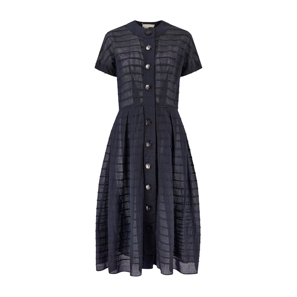 1950s L'Aignon Navy Cotton Short-Sleeve Dress with Pleat Detail