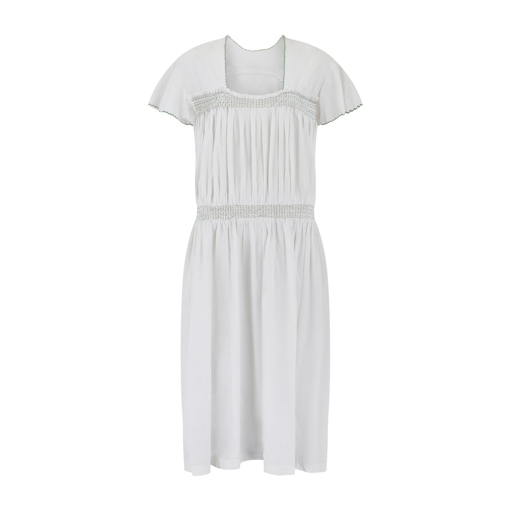 1950s White Cotton Smocked Dress with Tie Back