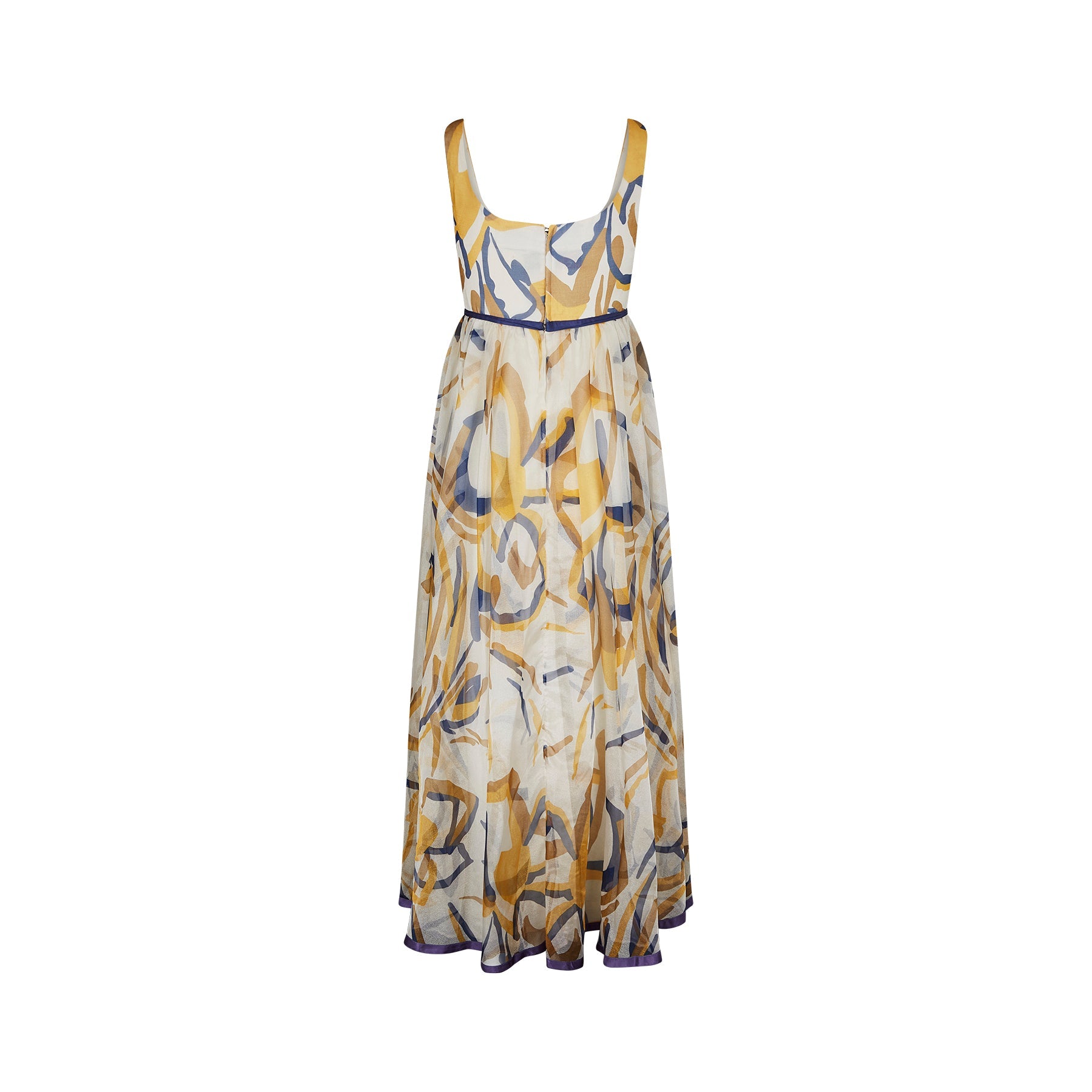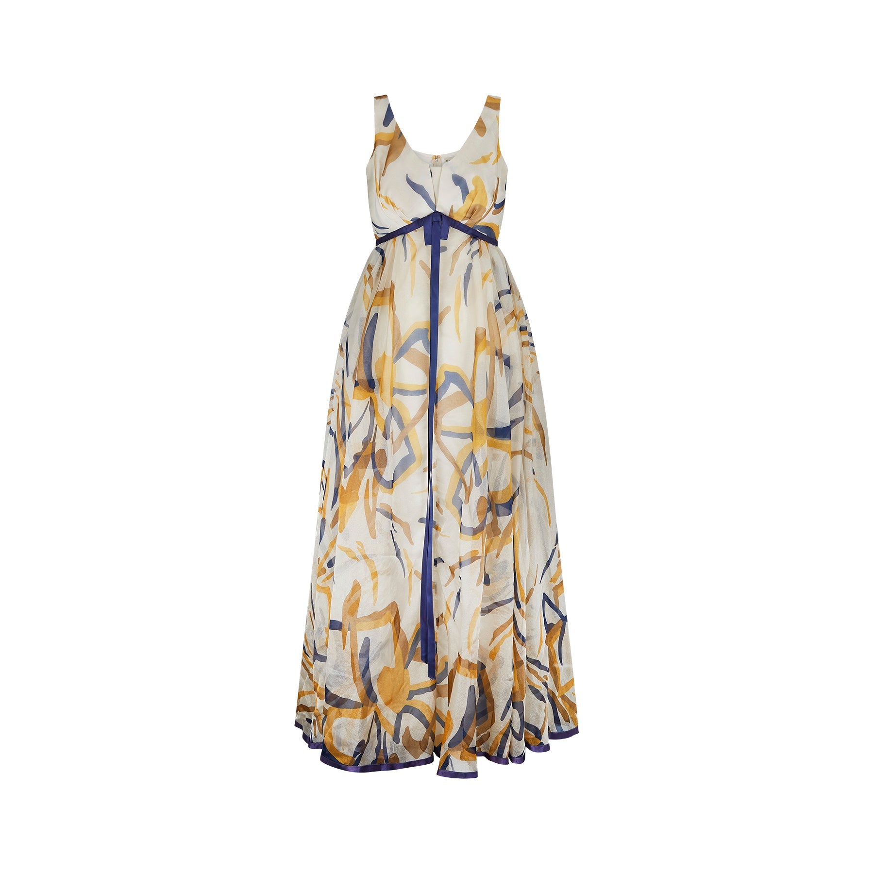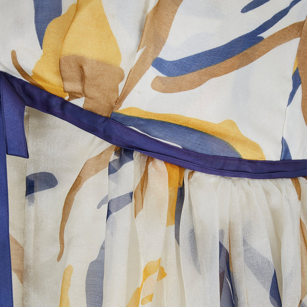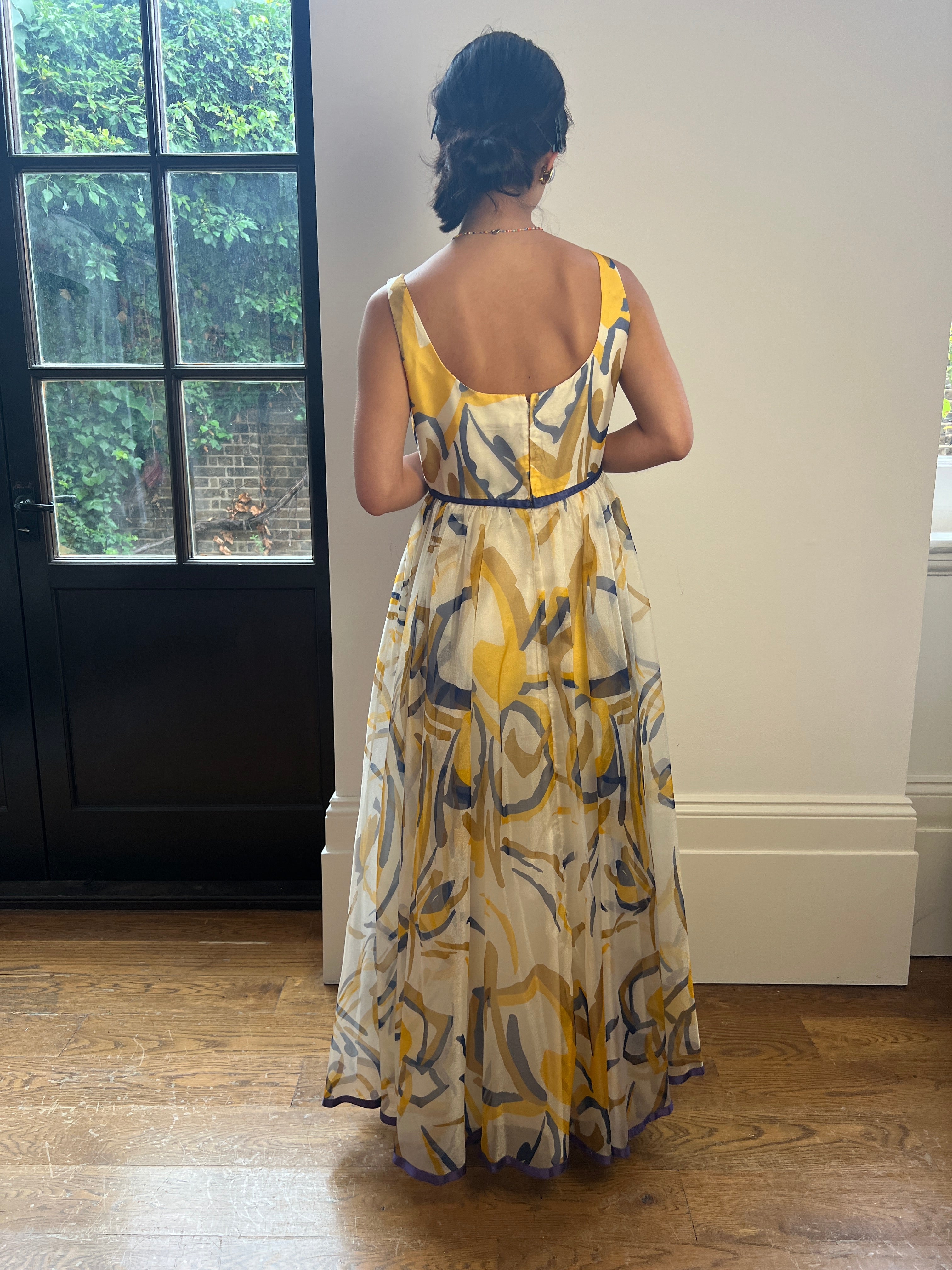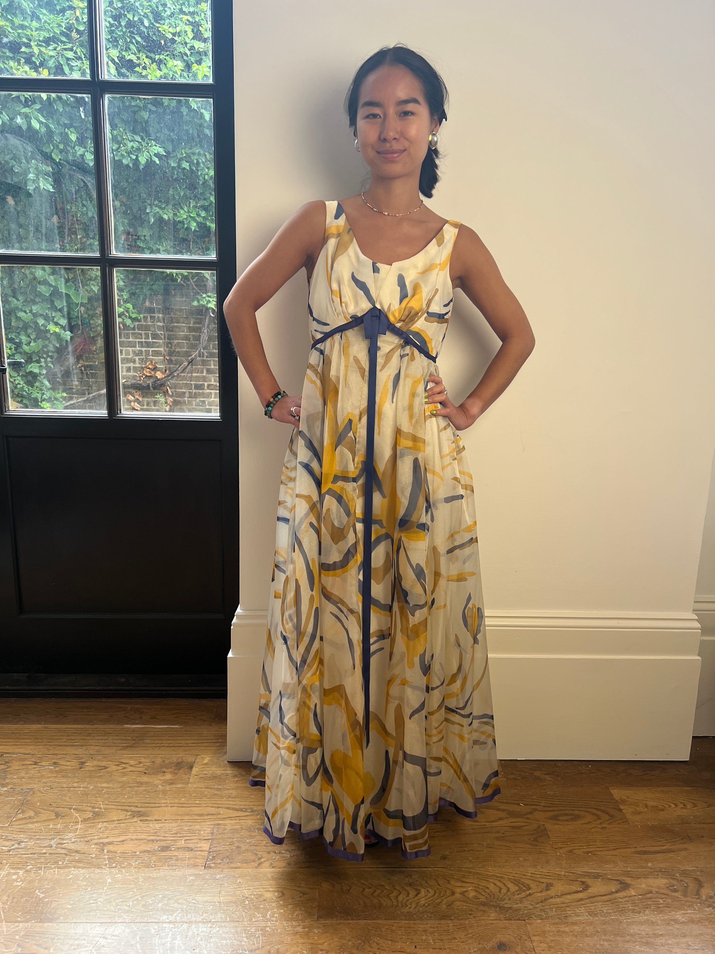 We love the colour combination on this 1960s Jean Allen maxi dress. The print mixes warm golden highlights together with navy blue accents on cream in a painterly, abstract pattern. The dress has an inverted empire line and scoop neck from which flows a fantastic manmade organza overlay which falls to around ankle length. The dress is lined in a very fine quality acetate and fastens to the rear with the original metal zip. There is a slight sheen to the organza. The bust line and bottom hem of the dress is trimmed in blue satin to coordinate with the blue accents and a long bow to the centre completes the look.