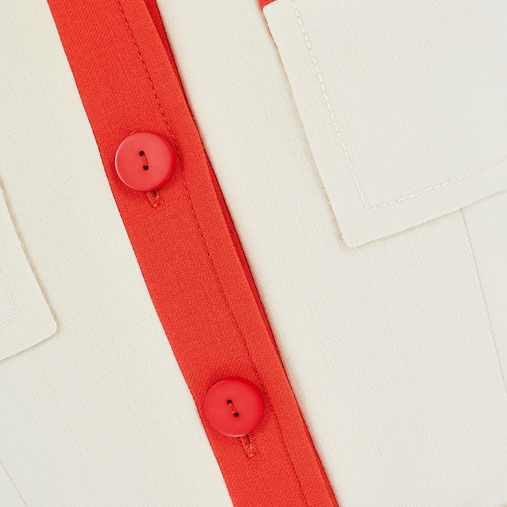 The ensemble is Lagerfeld's homage to the space age fashions which prevailed in the mid-to-late 1960s and early 1970s. The ensemble is composed of a mod-style culottes dress and coordinating jacket. Beautifully crafted, the sleeveless dress is made from a thick cream wool with a nipped-in waist and A-line "split skirt" or "divided skirt" that falls to knee length. The waistband is shaped in a basque style at the front. The dress is unlined. The jacket is tailored from the same cream wool and trimmed with vibrant coral-red hued panels around the collar, along the front placket and across the welt pockets at the chest. The large plastic buttons are also in a tonal red hue. The jacket has a coordinating waist belt that plays to the 1960s feel with its oval shaped buckle. Lined in cream satin, it has in-seam pockets at the hips. The original label reads Chloé in black font on off-white satin. No other labels are present in the ensemble and the fabric has no stretch.