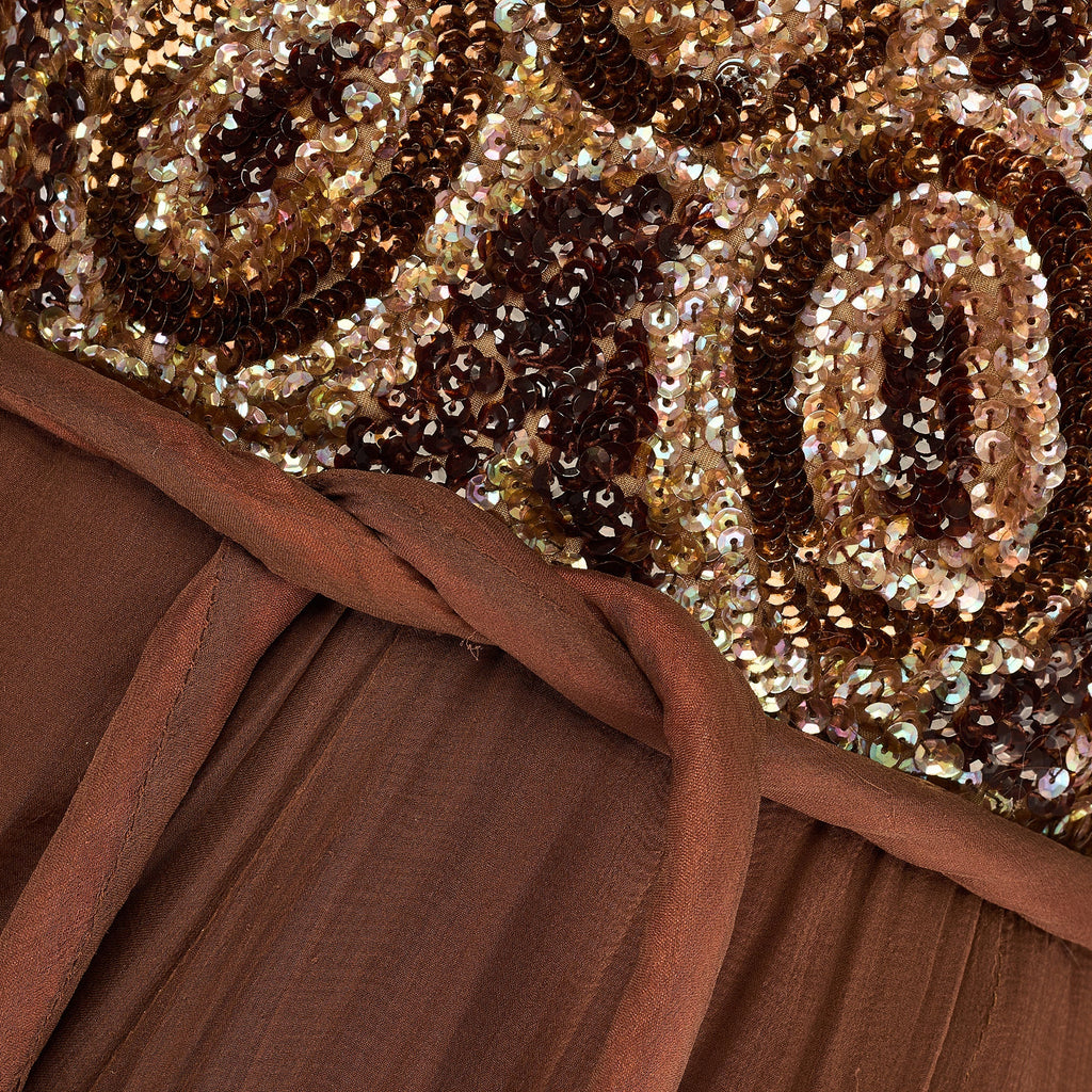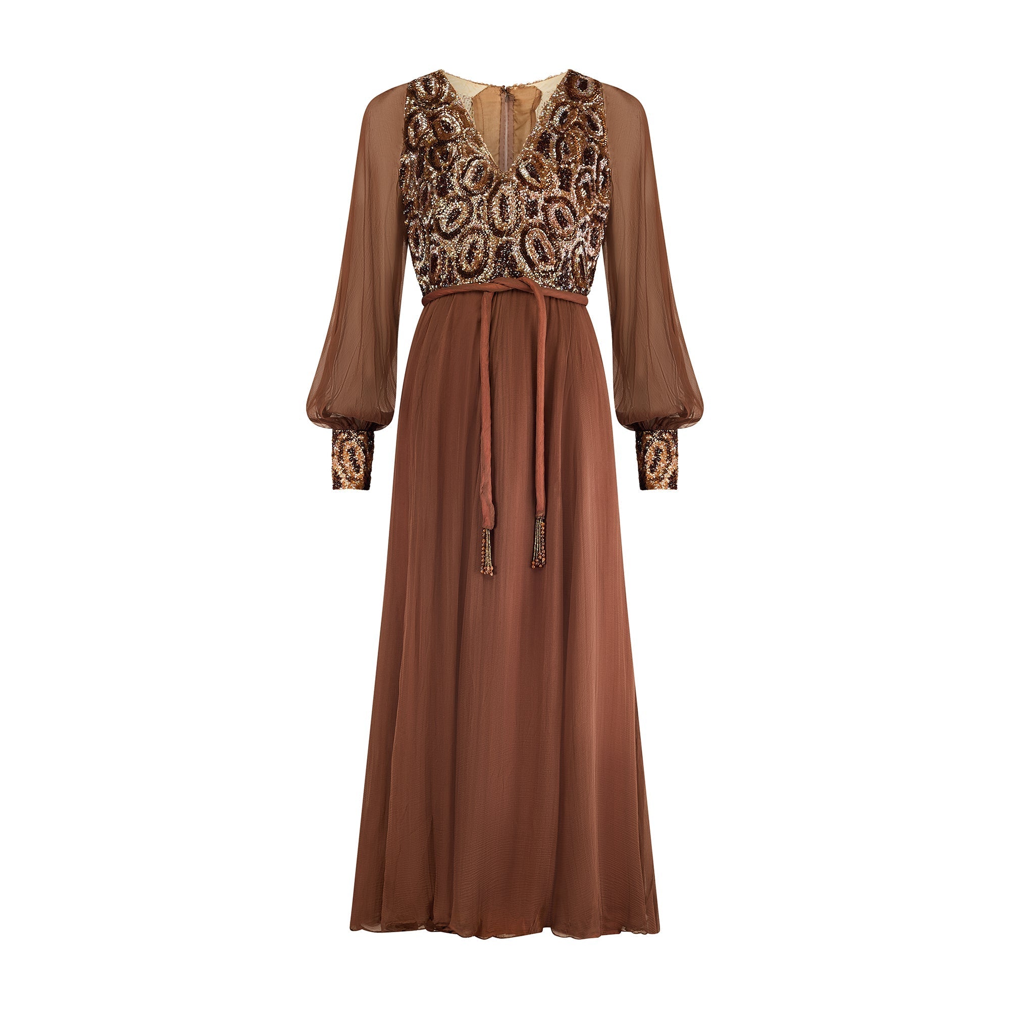 This late 1960s couture brown silk maxi dress is beautifully made; we love the frothy sheer bell-sleeves and full, swirling skirt. The neckline is cut to a V-shape and the bodice is heavily embellished with hand-sewn detailing. Sequins smother the front and back of the top section, iridescent pinkish-brown, bronze and umber hues forming a psychedelic circle print. The cuffs are detailed with the same sequin embellishment and fasten with three hidden snap closures. The skirt is full and tailored from the same sheer silk-chiffon as the sleeves. It is lined with a bronze satin. There is a removeable chiffon belt that is tube-shaped. Formed from sheer brown silk and lined with bronze satin, it is finished with tassels threaded with tiny bronze beads and larger faux-amber beads. The dress fastens at the back of the neck with a hidden tonal zip and hook-and-eye clasp.