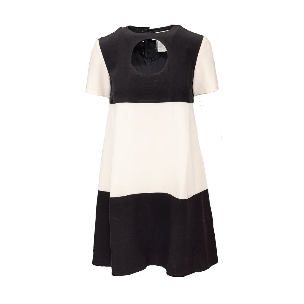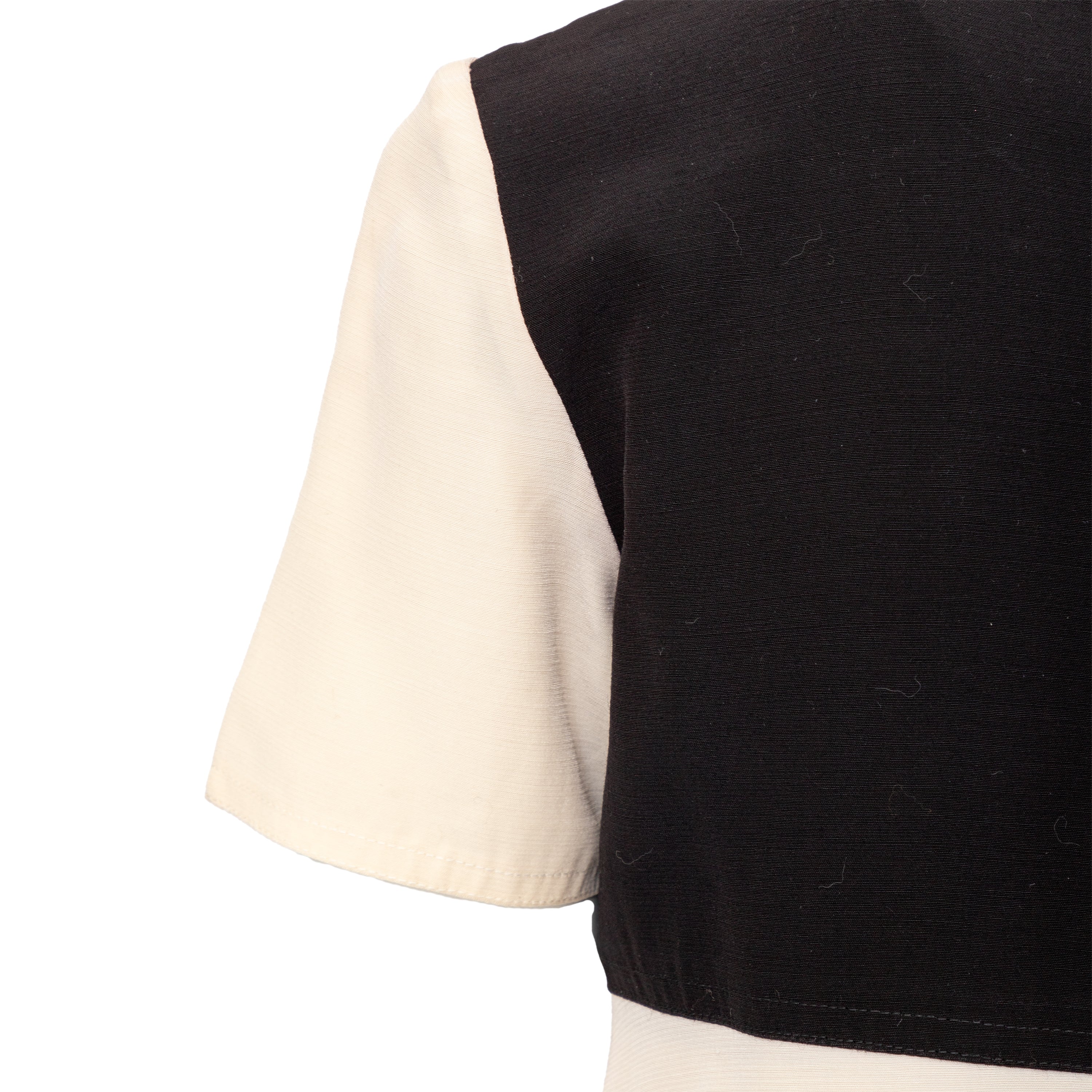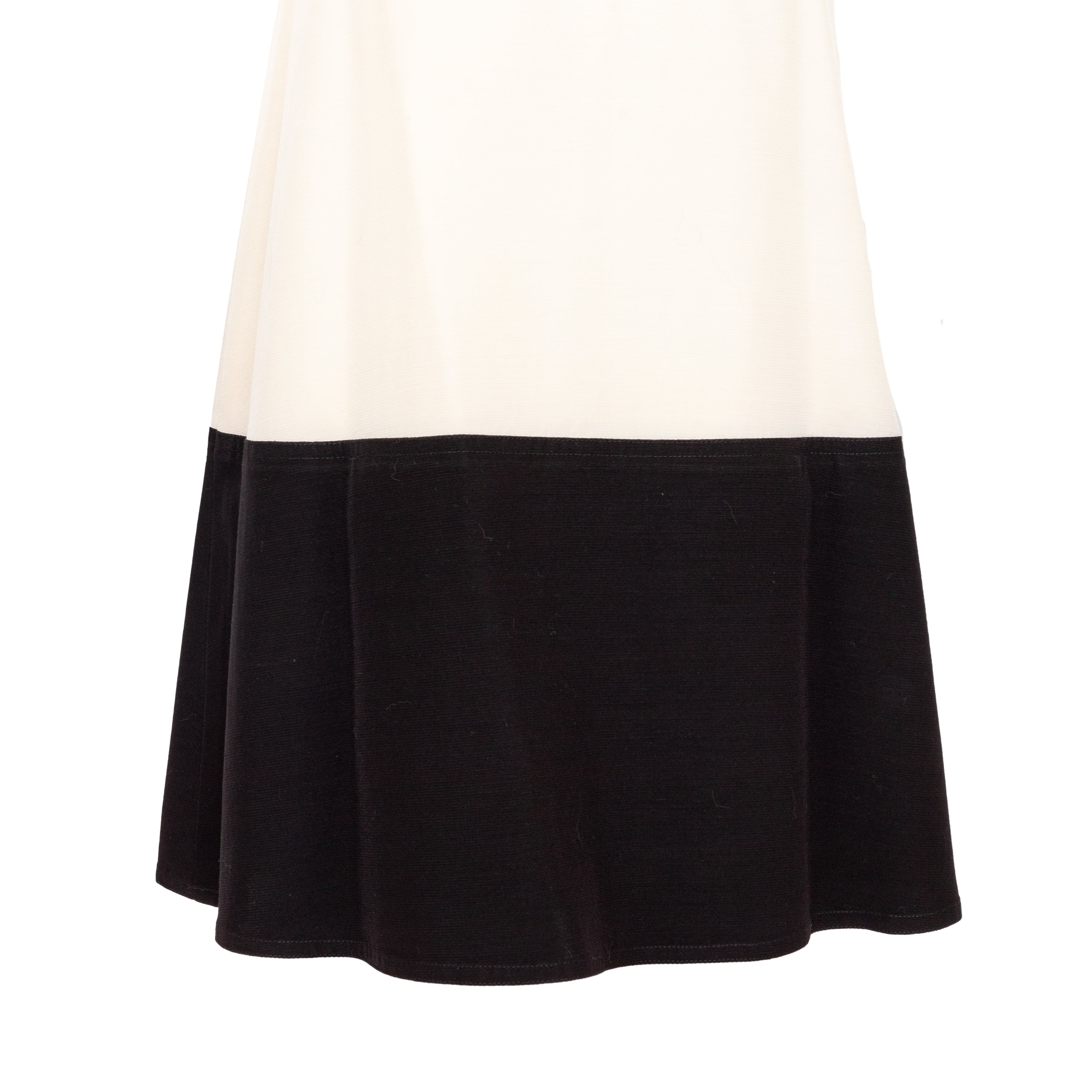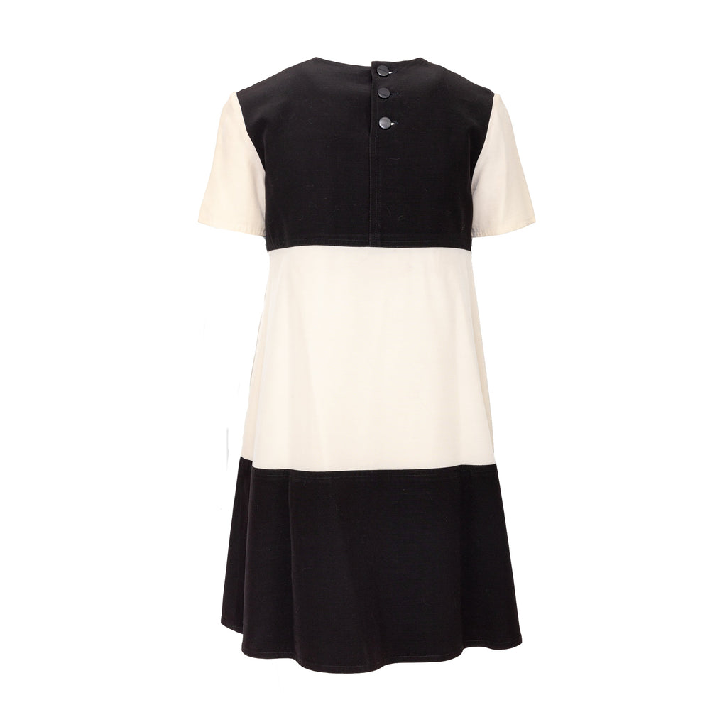 This vintage midi dress by Courrèges features a playful and bold colorblock design with wide, contrasting stripes. The standout feature is the round cutout on the front, adding a unique and eye-catching detail. With short sleeves and a classic round neckline, this dress combines the sleek, minimalist aesthetic of the 60s.