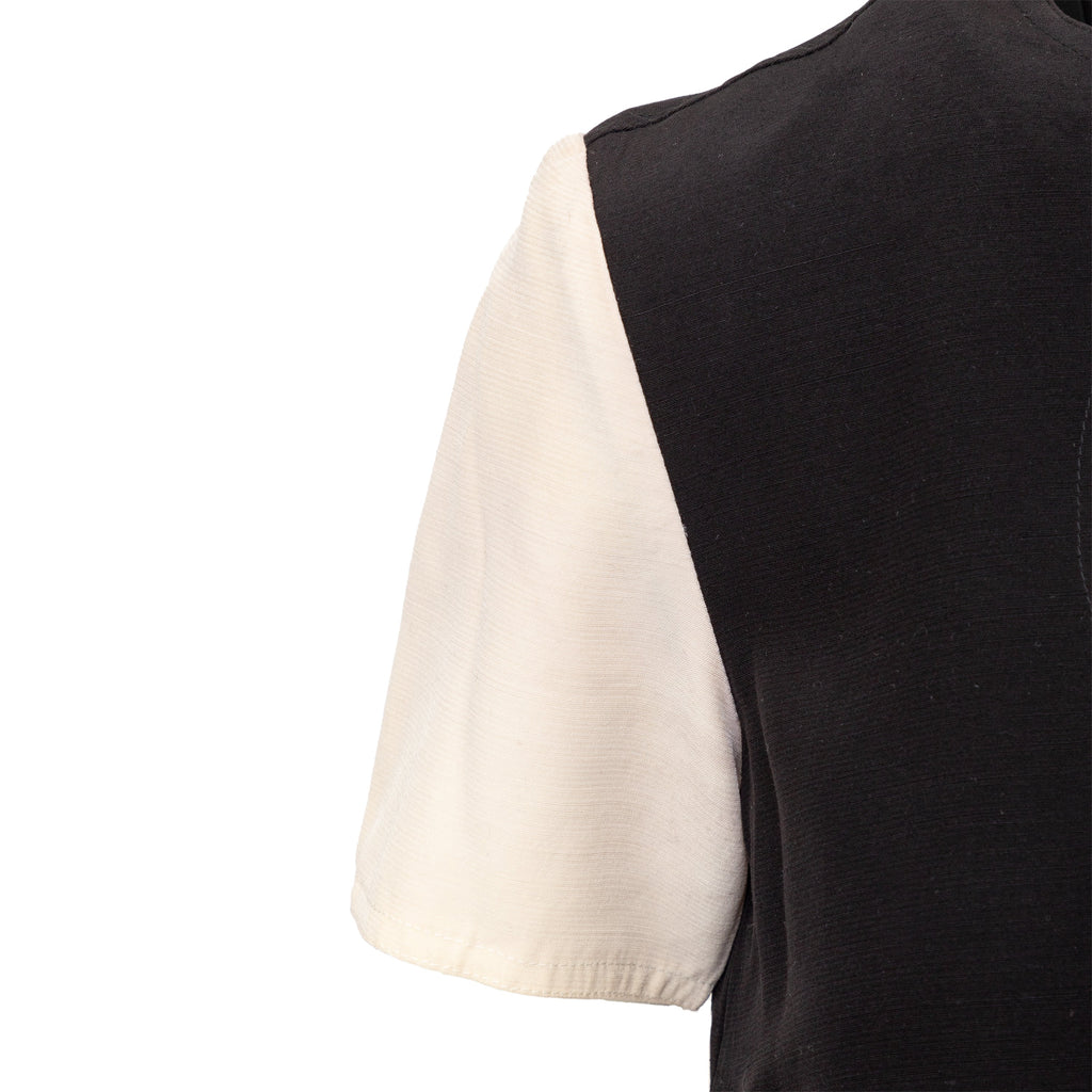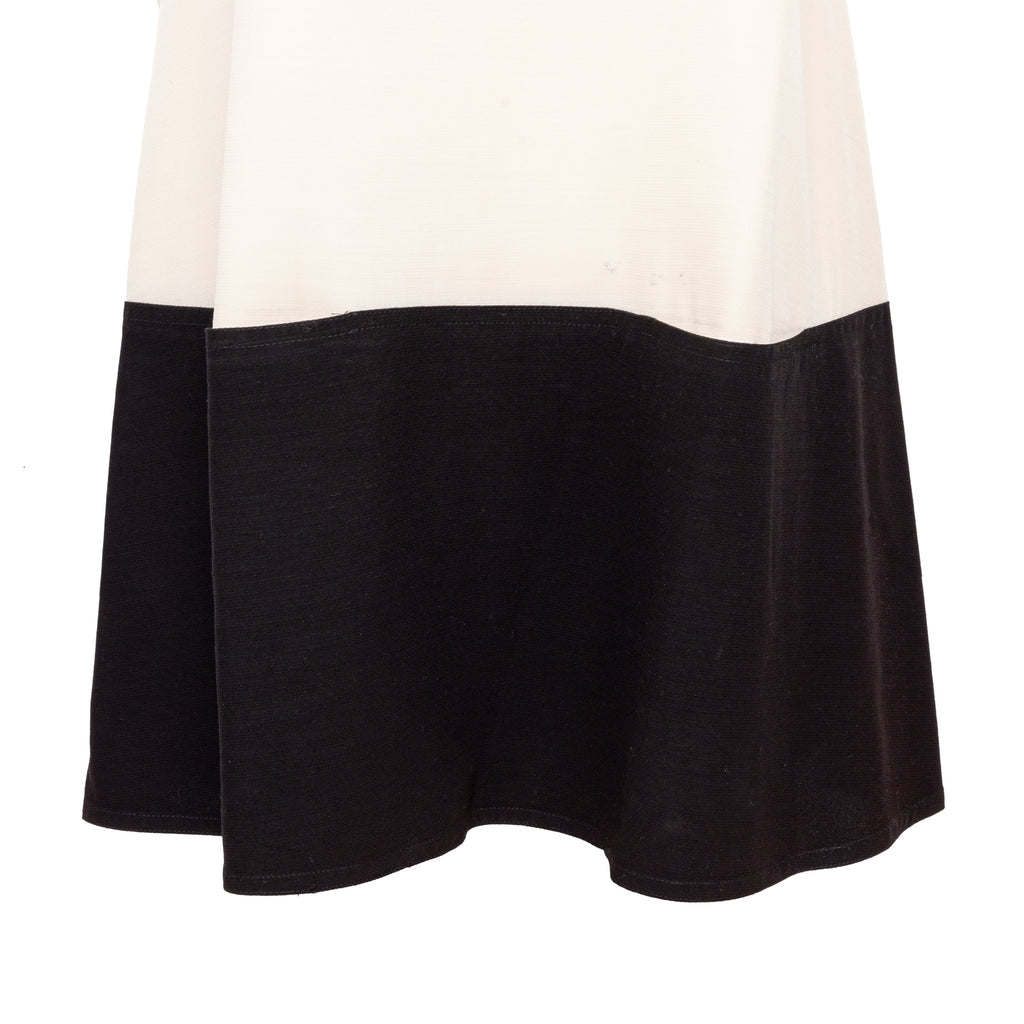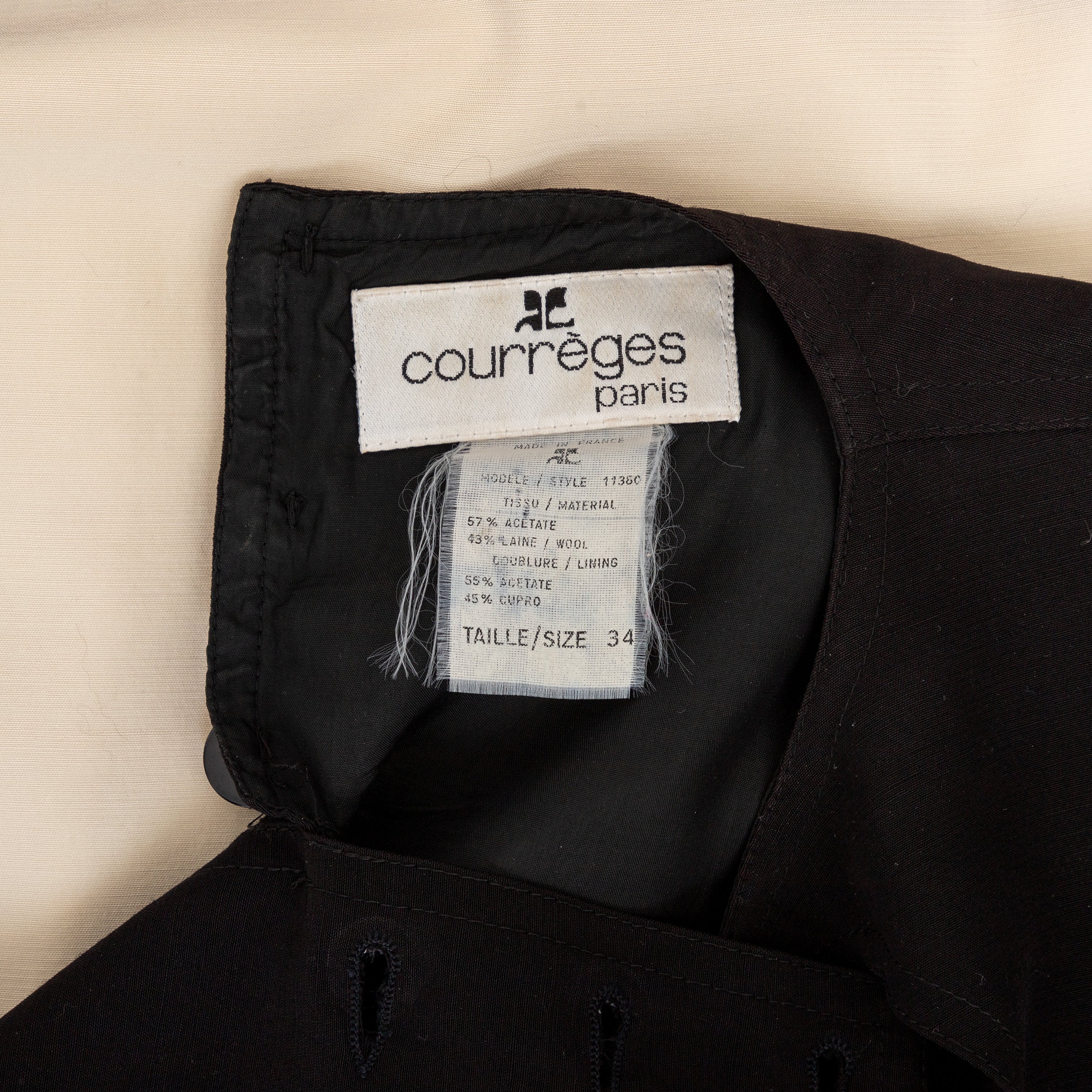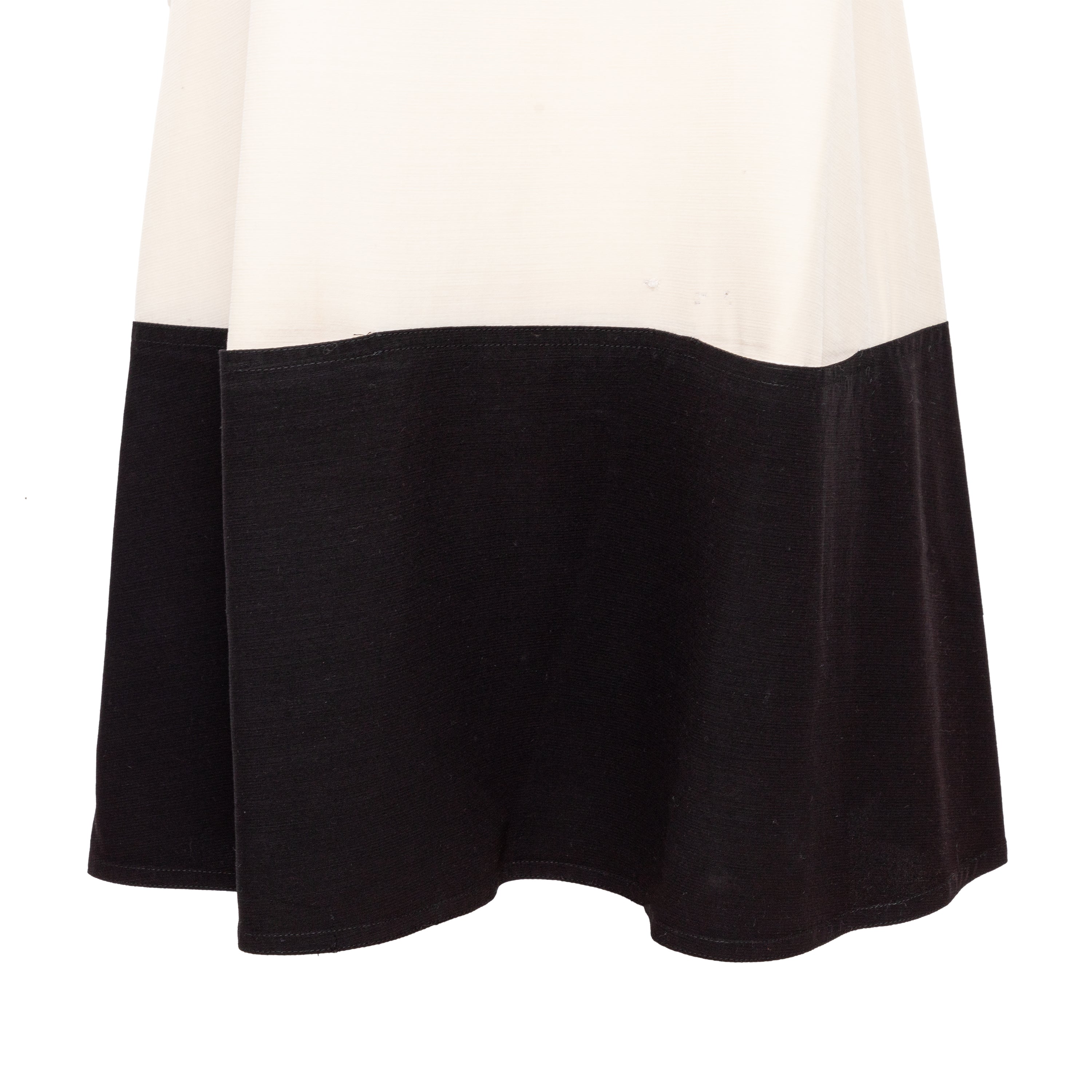 This vintage midi dress by Courrèges features a playful and bold colorblock design with wide, contrasting stripes. The standout feature is the round cutout on the front, adding a unique and eye-catching detail. With short sleeves and a classic round neckline, this dress combines the sleek, minimalist aesthetic of the 60s.