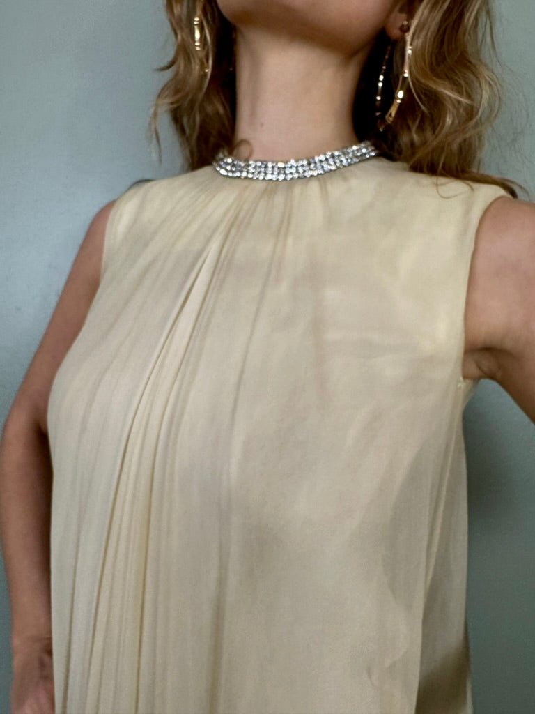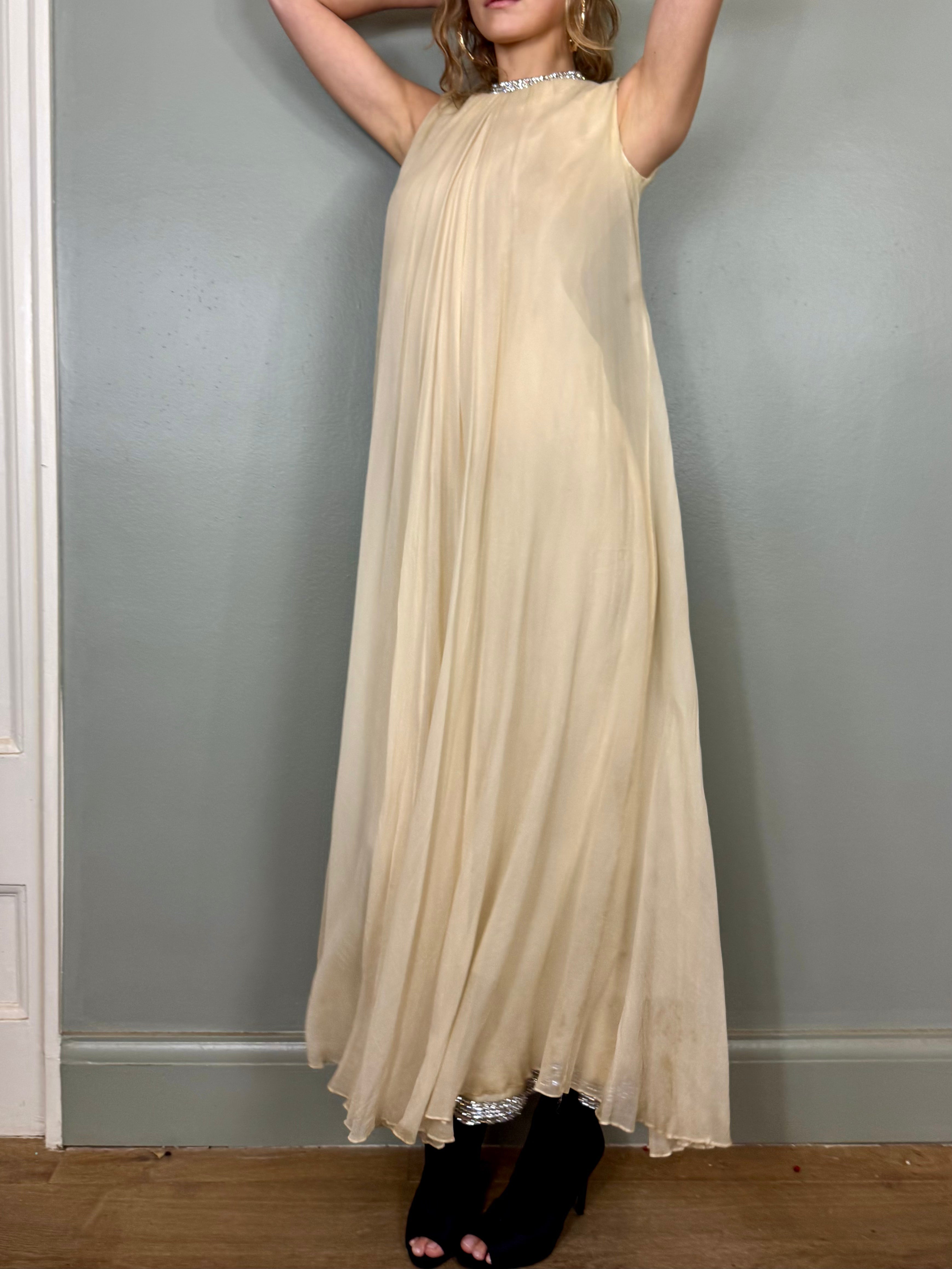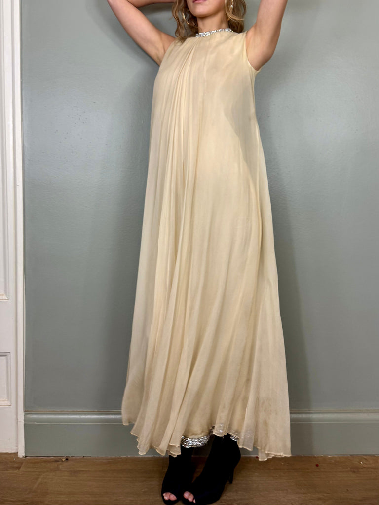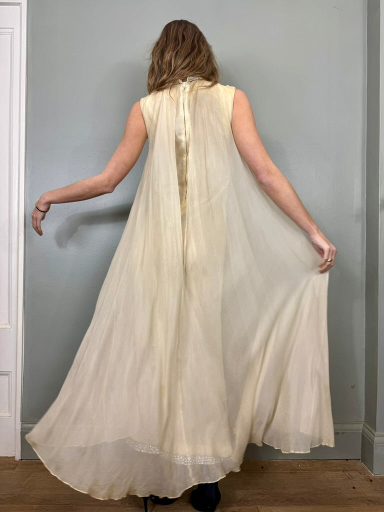 Exude timeless elegance with this 60s cream chiffon dress of dreams. Adorned with a delicate diamanté trim around the neckline and hemline, the sleeveless dress is both glamorous and comfortable. A back zip closure and floaty layers of pleated chiffon add to the overall sophistication of this stunning piece.