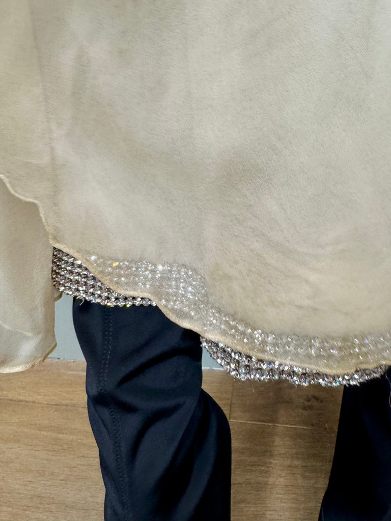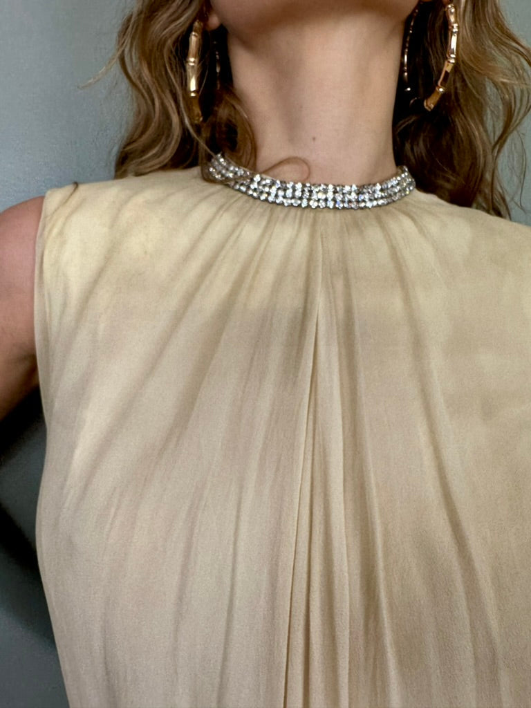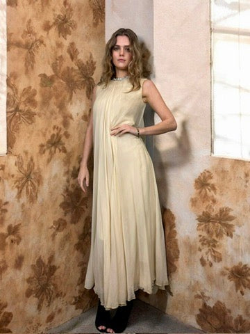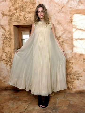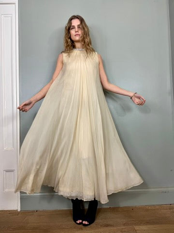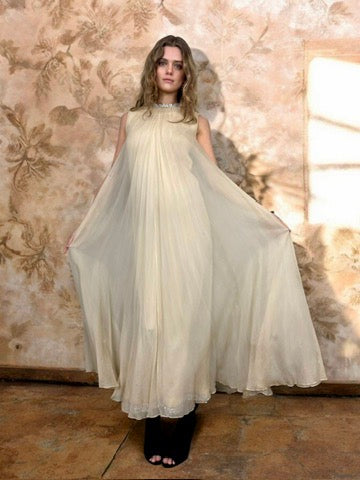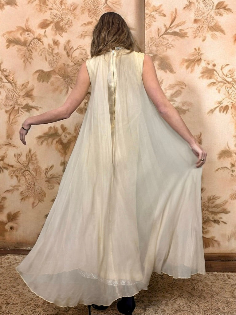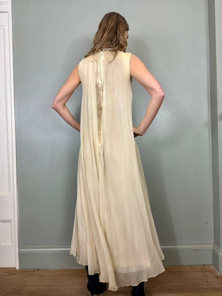 Exude timeless elegance with this 60s cream chiffon dress of dreams. Adorned with a delicate diamanté trim around the neckline and hemline, the sleeveless dress is both glamorous and comfortable. A back zip closure and floaty layers of pleated chiffon add to the overall sophistication of this stunning piece.