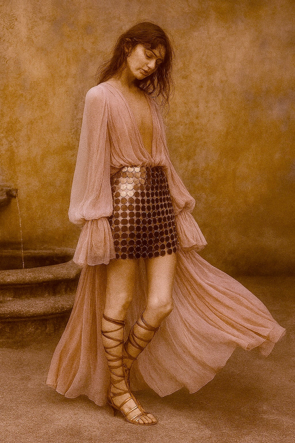 This rare and original 1970s bronze mirror disc Chainmaile miniskirt features a unique design with two chain clasps that fall on the sides. Perfect for layering, this piece adds a touch of timeless modern style to any outfit. A must-have for any fashion-forward individual.