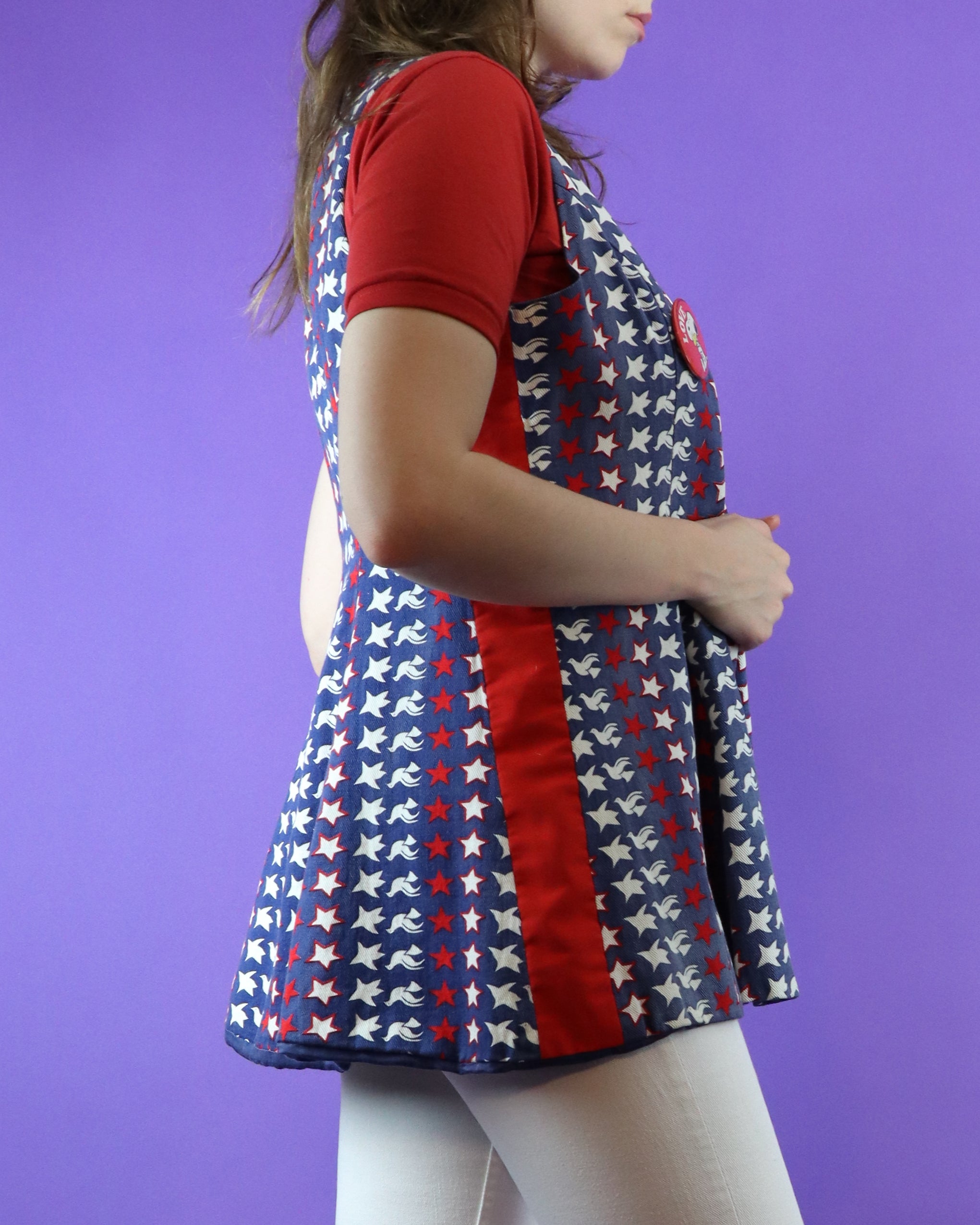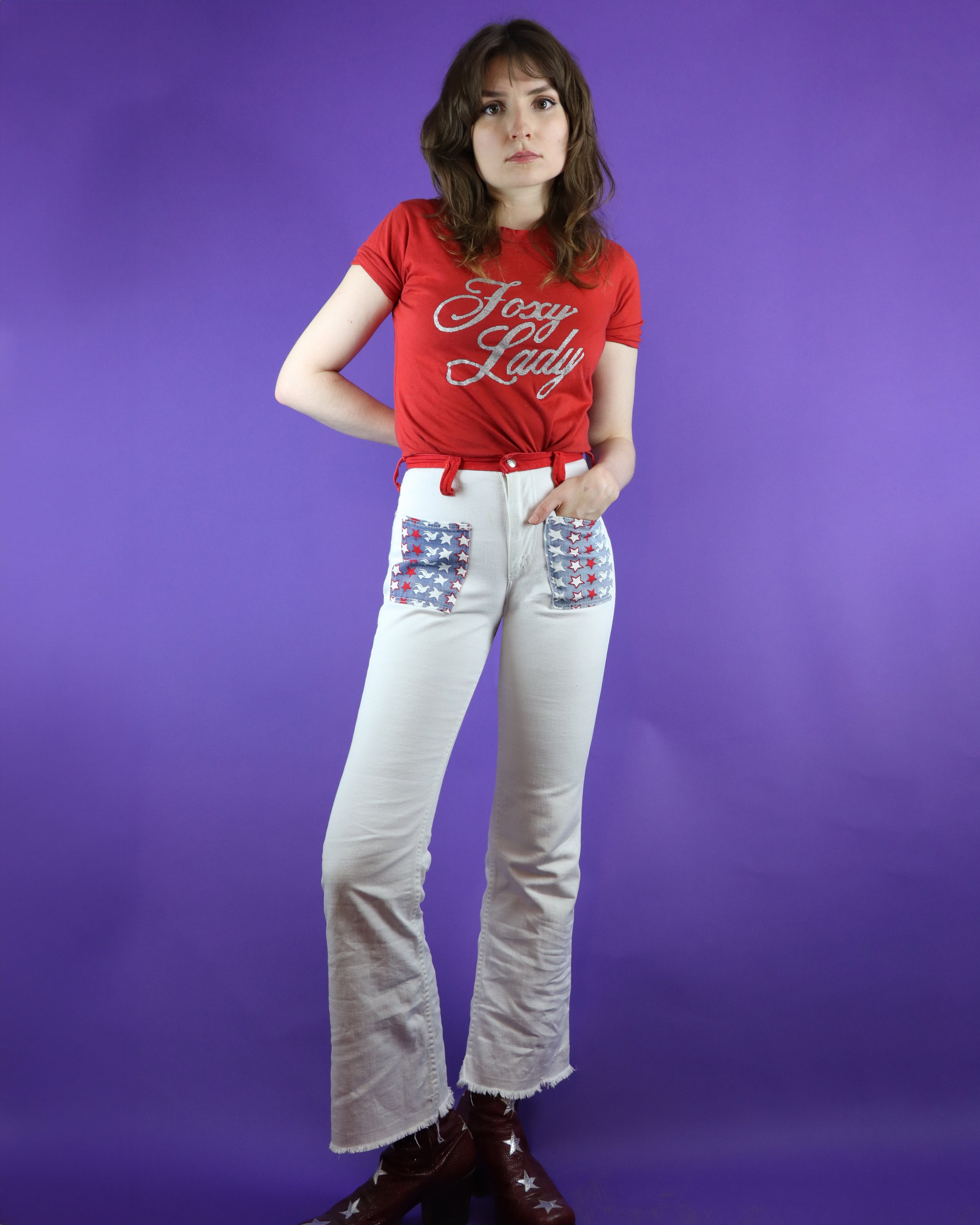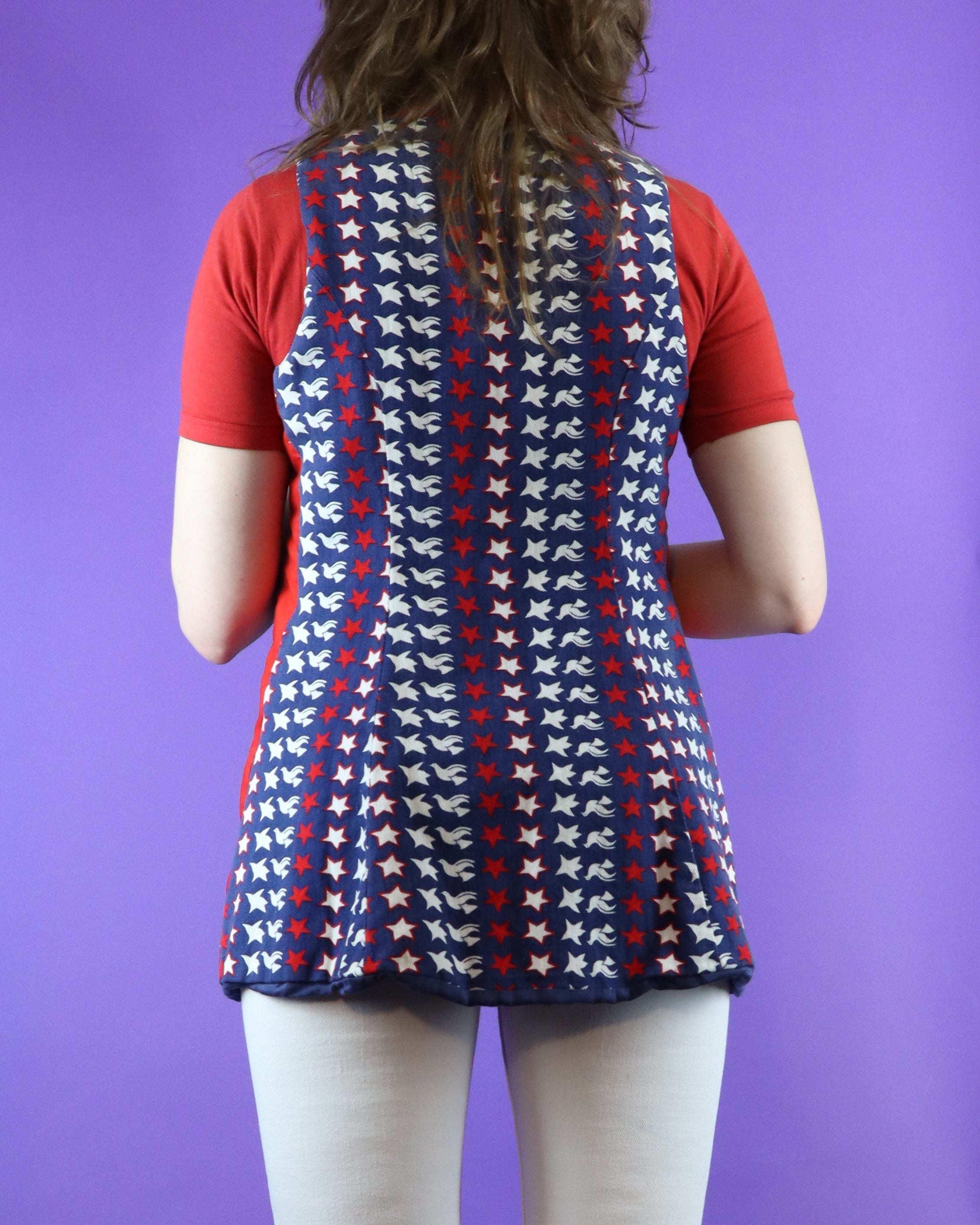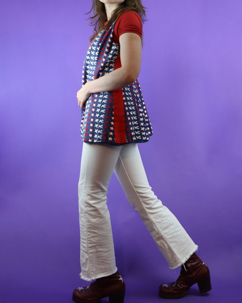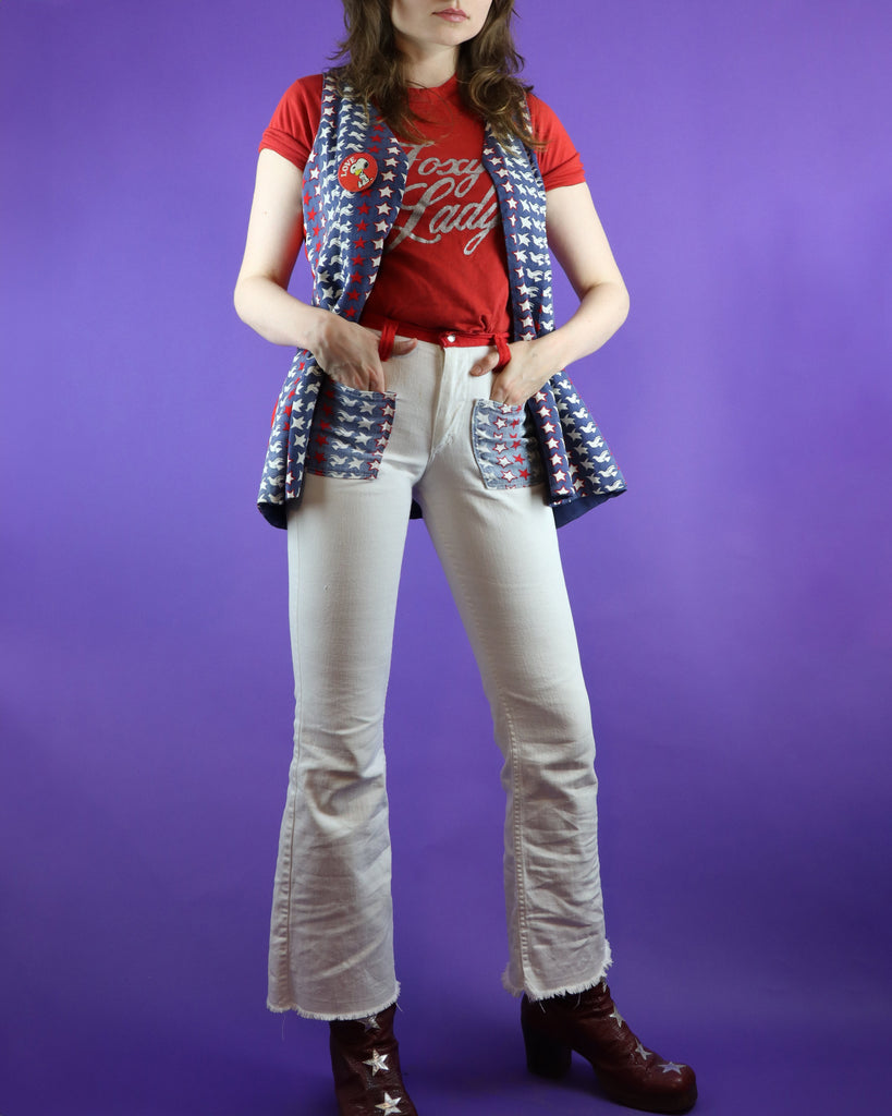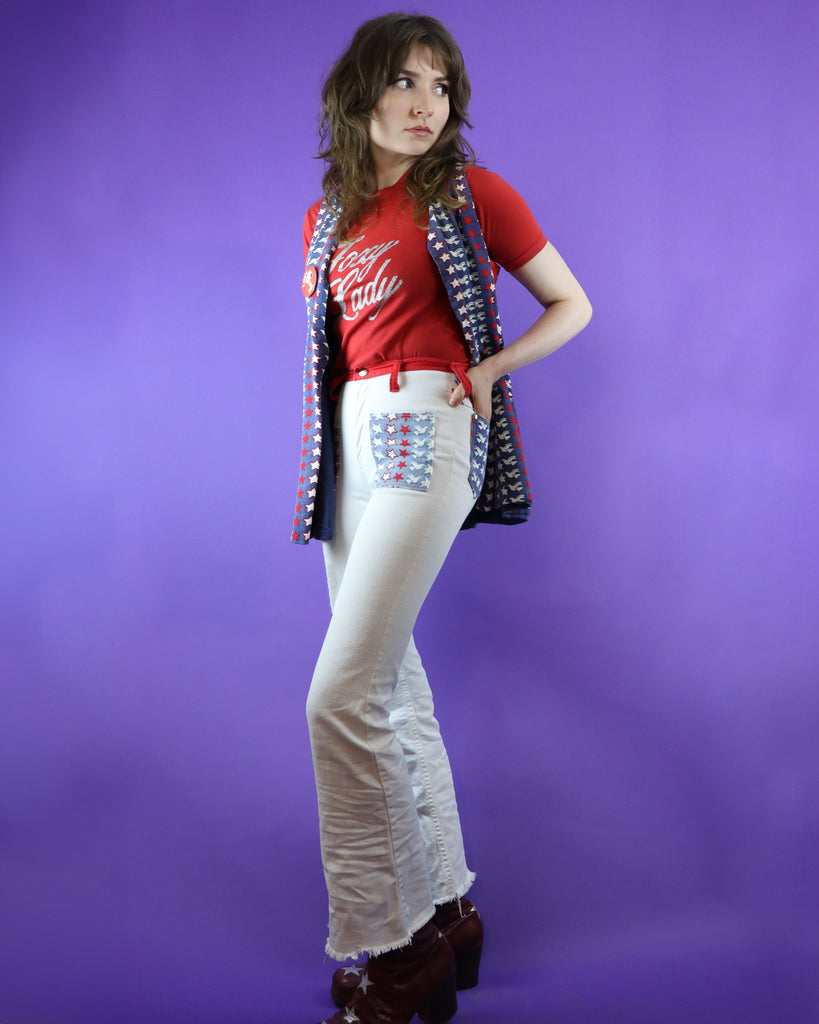 Vintage 1960s 1970s pop art two piece set by Maverick. Reminiscent of Peter Max designs- colour blocked flares with a white base, contrast red waistband and Americana stars with peace doves on the patch pockets, matched with the open vest. A fab hippie summer piece.