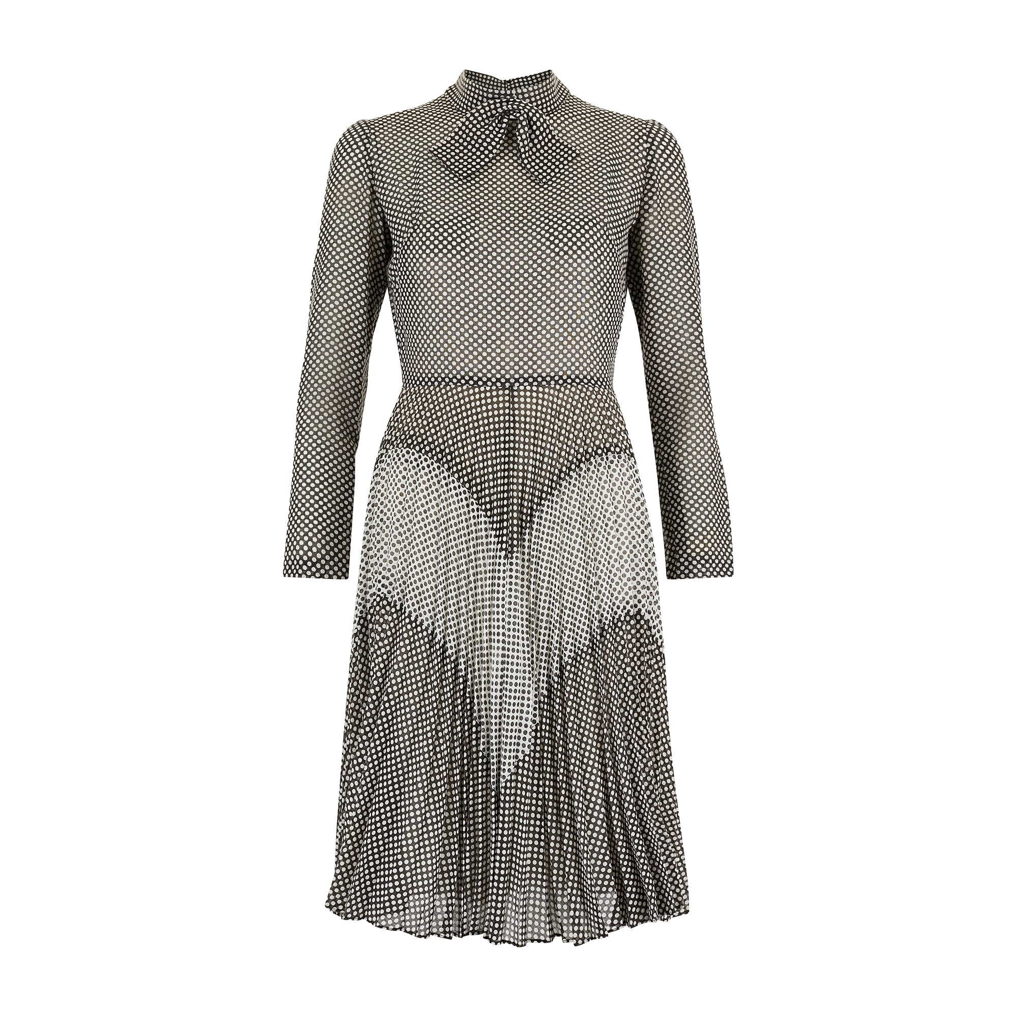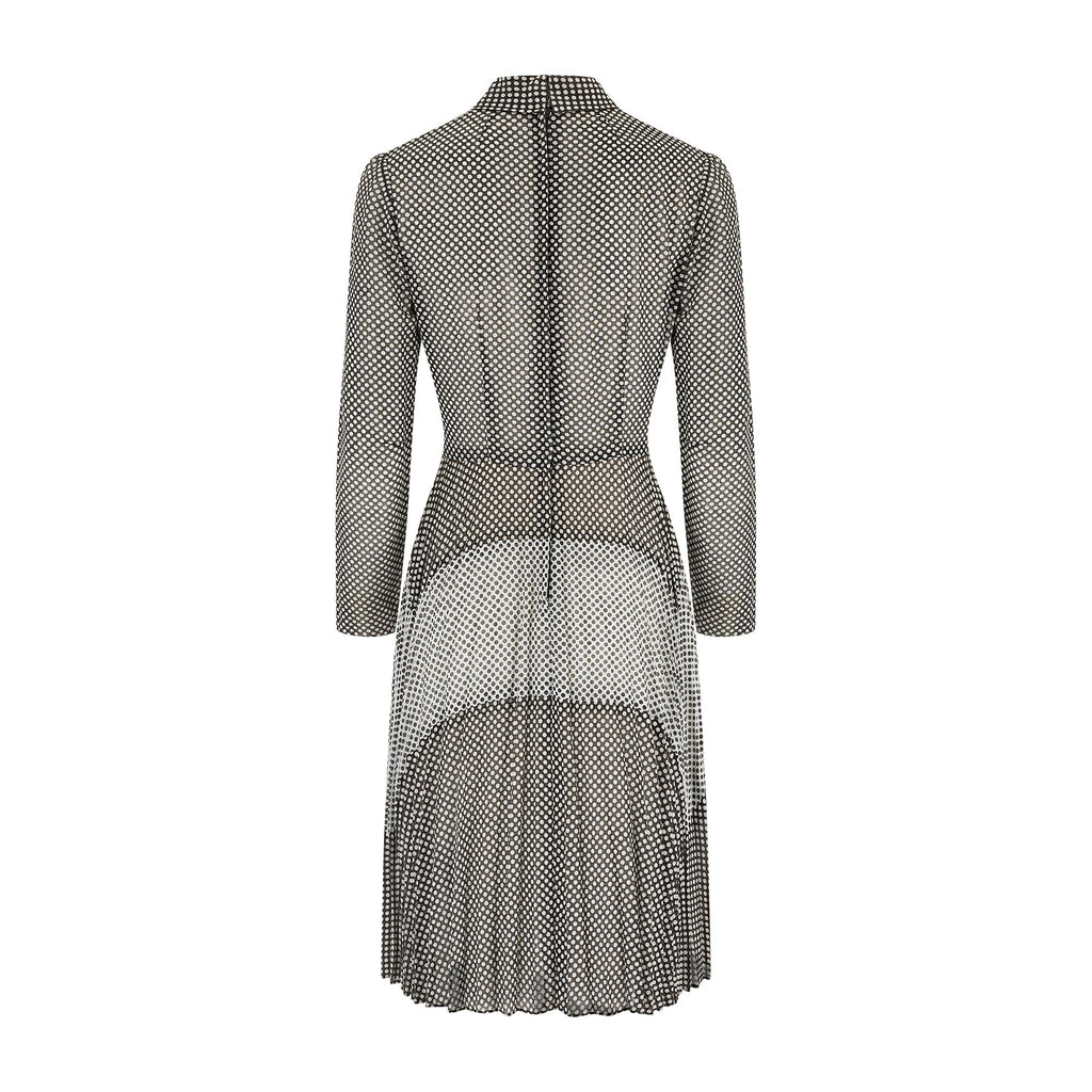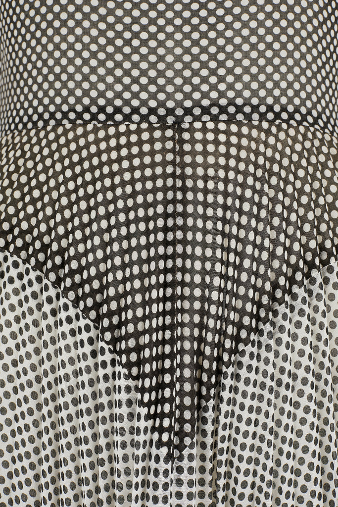 Made in England, this 1970s Berkertex dress is crafted from a lightweight black and white polka-dot cotton gauze. Cut to a long-sleeve, high-neck silhouette, the flippy, pleated skirt falls to calf-length. The skirt features three inverted bands formed of contrasting monochrome polka-dot patterns. The collar is christened by a bow which gives the appearance of a pussy-bow neckline. The fabric is very floaty and ever so slightly sheer with the skirt having a separate white cotton lining. The dress fastens at the rear of the neck with a hidden zip and hook-and-eye clasp.