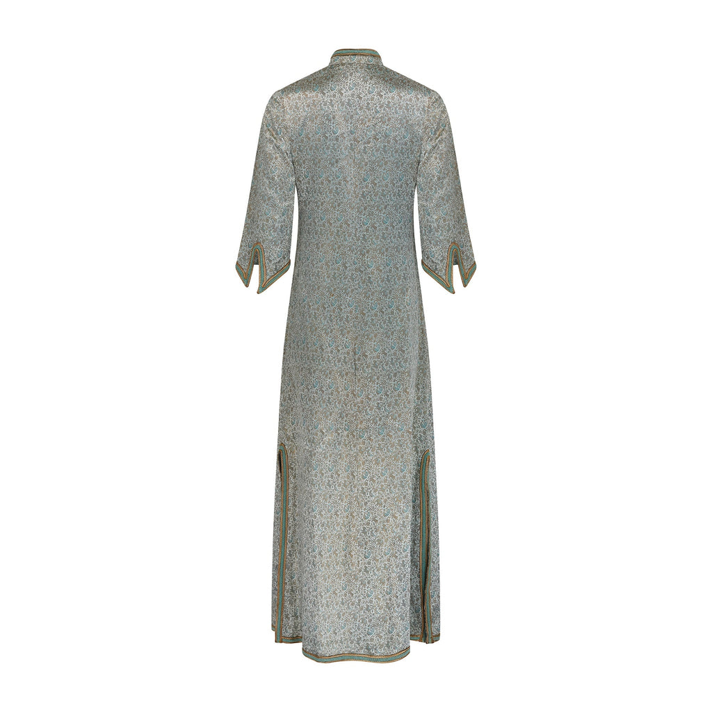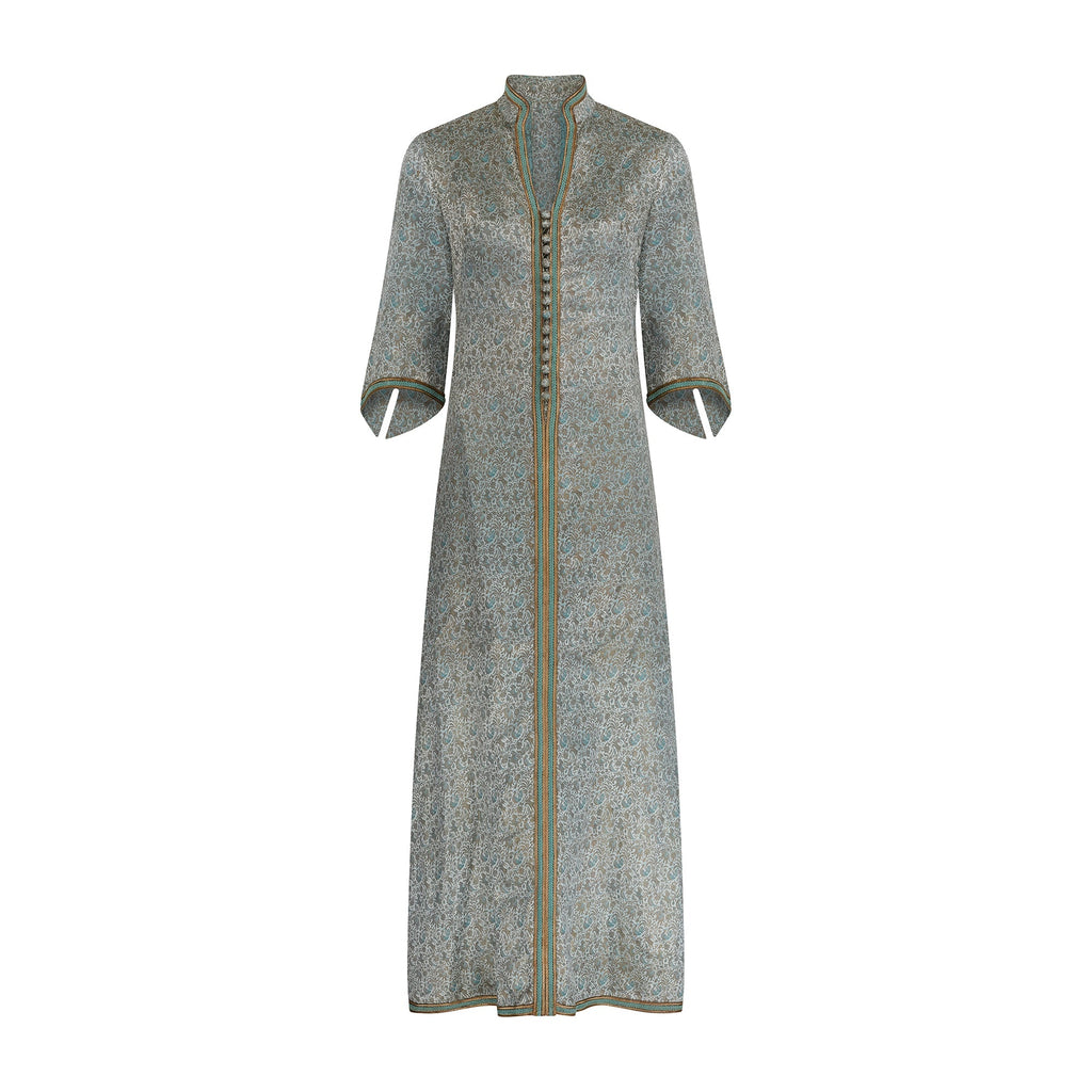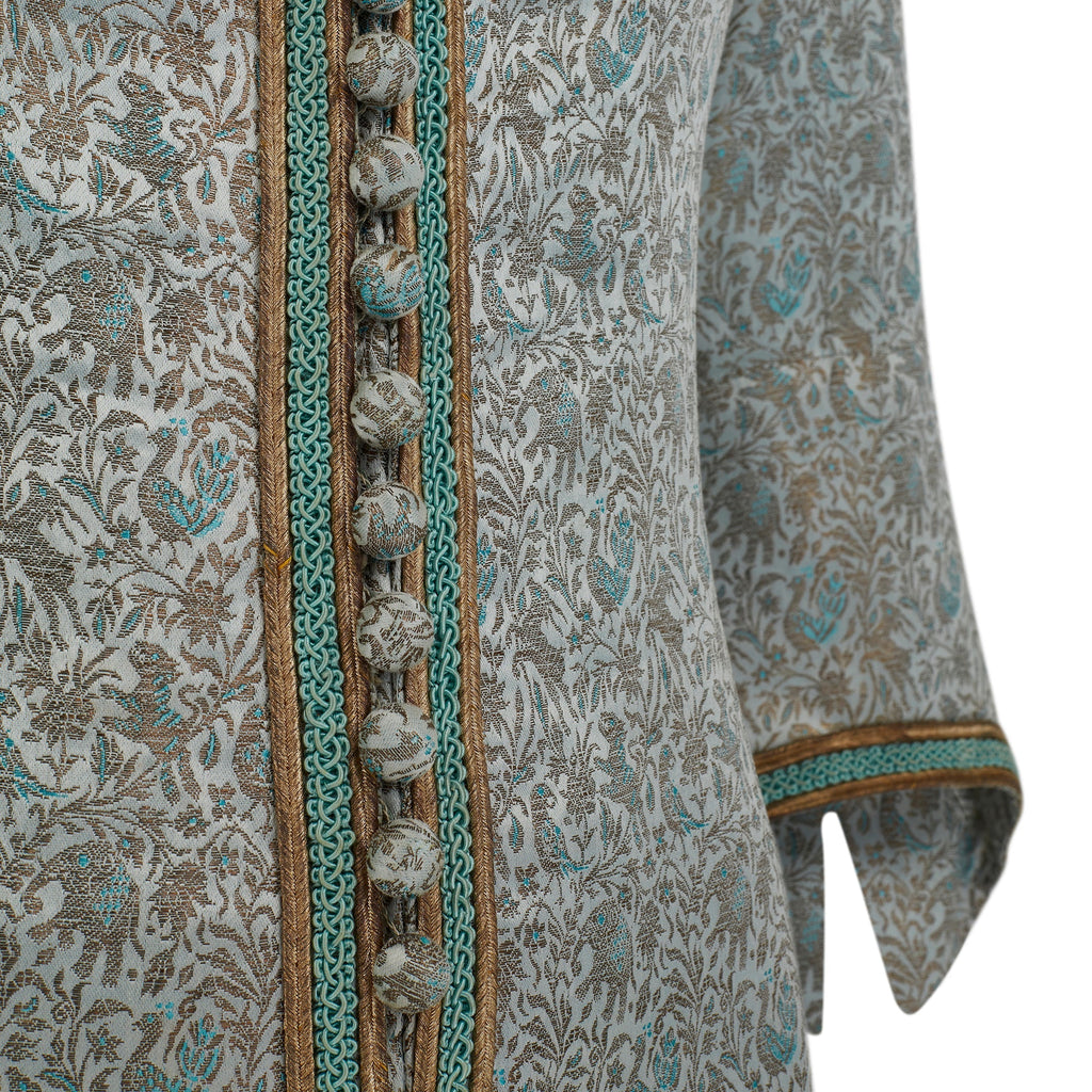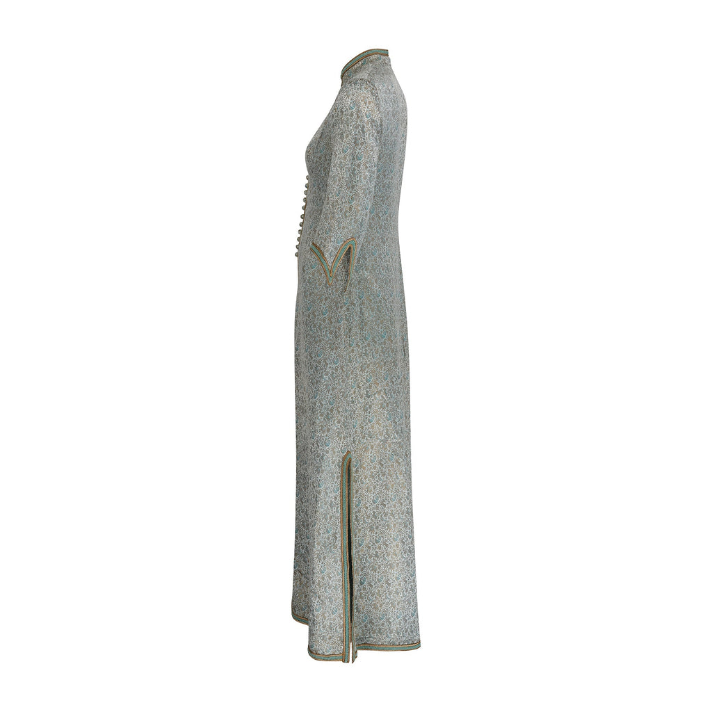 This magnificent 1970s coat dress was likely bespoke made and came from the wardrobe of a titled socialite along with some other fabulous couture garments. It is crafted from the finest Indian woven silk brocade, patterned with elephants, peacocks, tigers and antelope. It is cut to an A-line silhouette to skim the body and falls to around ankle length. The dress is trimmed with a stunning gold and turquoise braid around the neckline and down the front. It has a high Nehru collar that gives way to a V-neckline and, below this, is secured stunning fabric-covered buttons which fasten through fabric loops. The sleeves are cut to a three-quarter length and finished with the gold and turquoise braid and detailed with a decorative slit at the elbow. The dress is unlined and likely would have been worn over a pair of trousers or a silk slip dress.