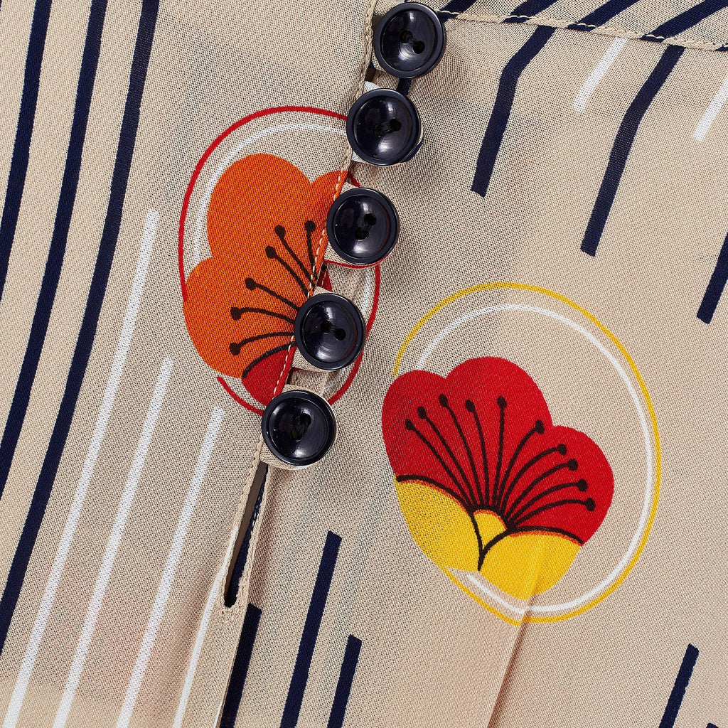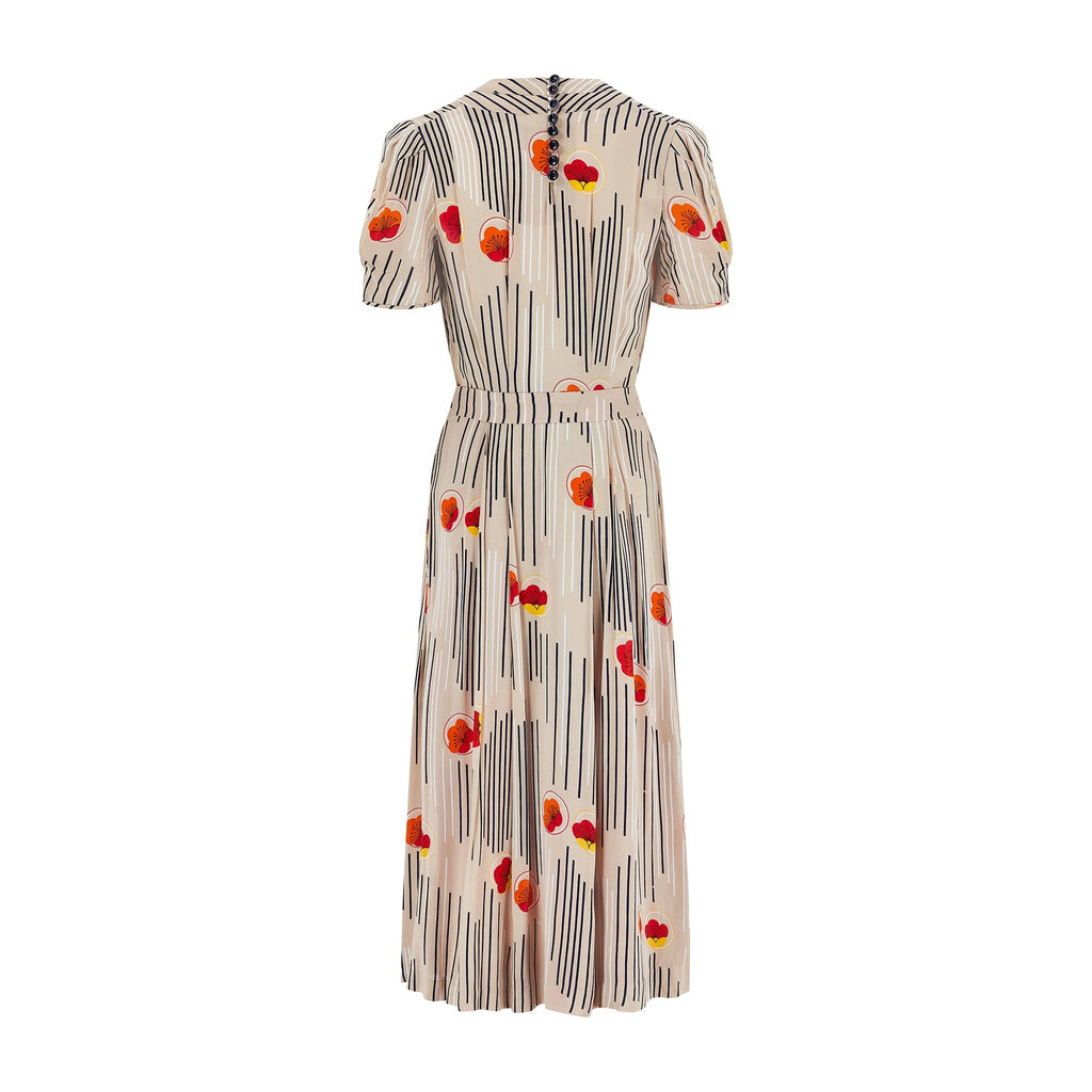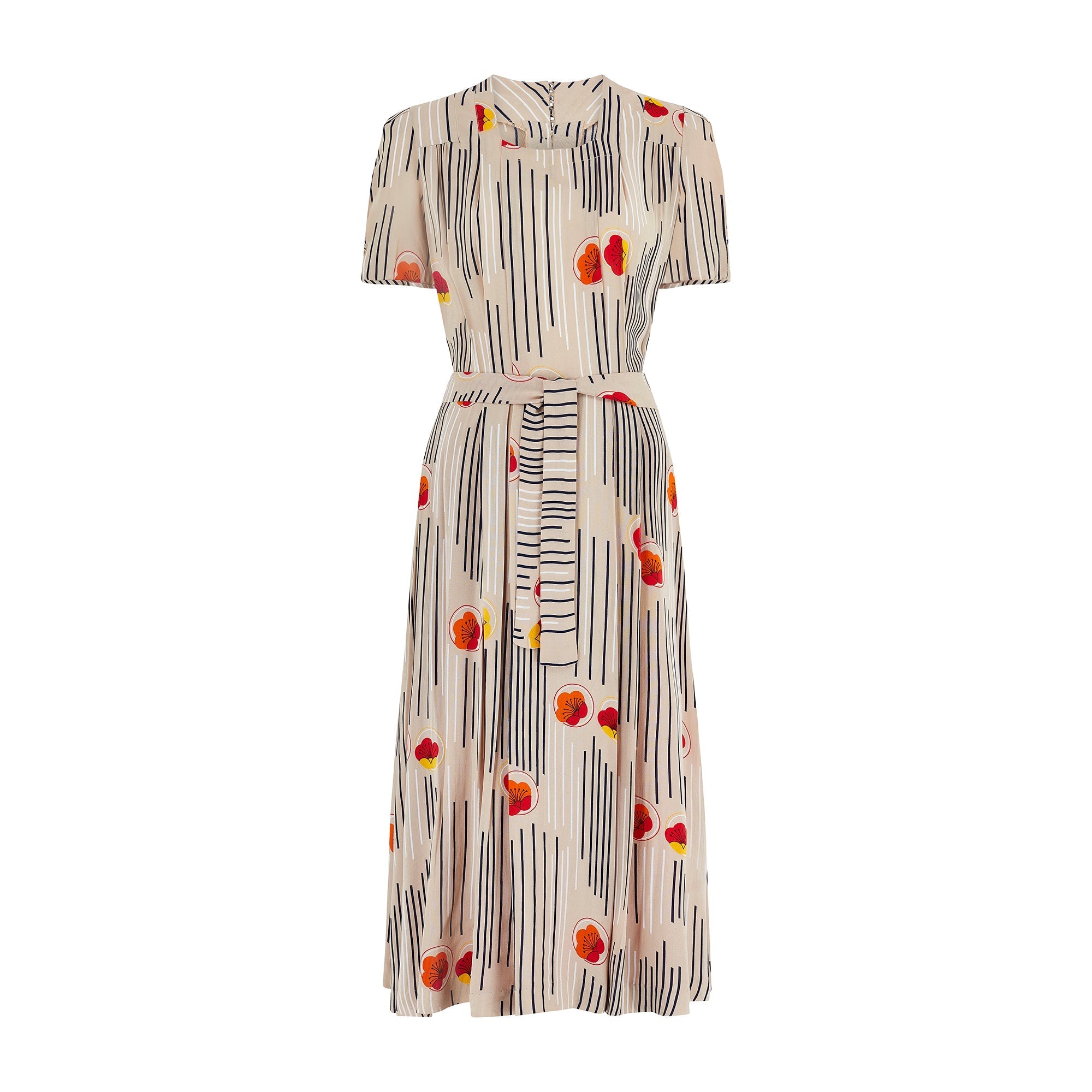 Tailored from a good quality man-made viscose in latte-biege with navy and white horizontal lines and bold, florals in orange, red and yellow. Cut to a short-sleeve style, it recalls the tea-dress silhouettes popularised in the 1930s and 1940s. The neckline is squared and the back fastens with polished navy buttons through fabric loops. The weighty skirt is lined with satin in salmon pink. It is box-pleated at the waistband and falls to the bottom of the calf. There is a detachable, coordinating fabric belt at the waist. The top of the dress is unlined.