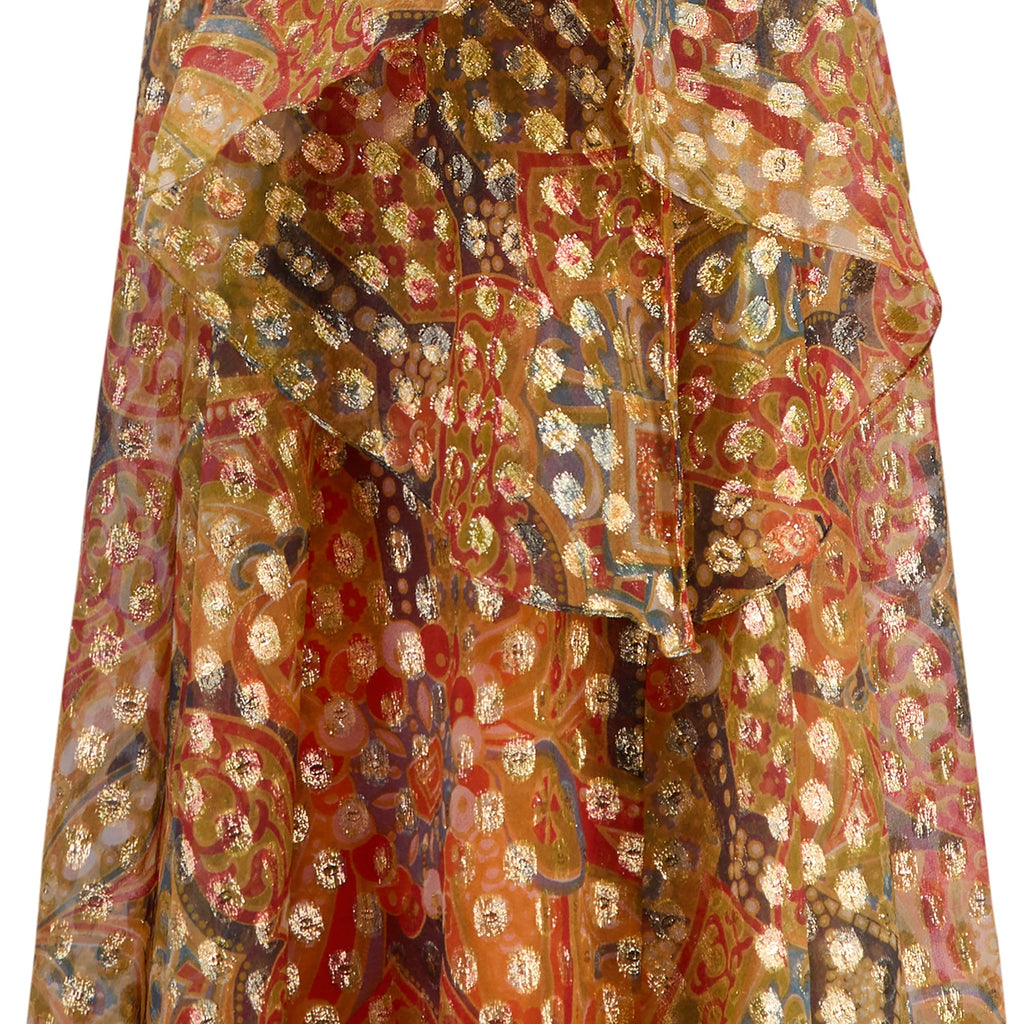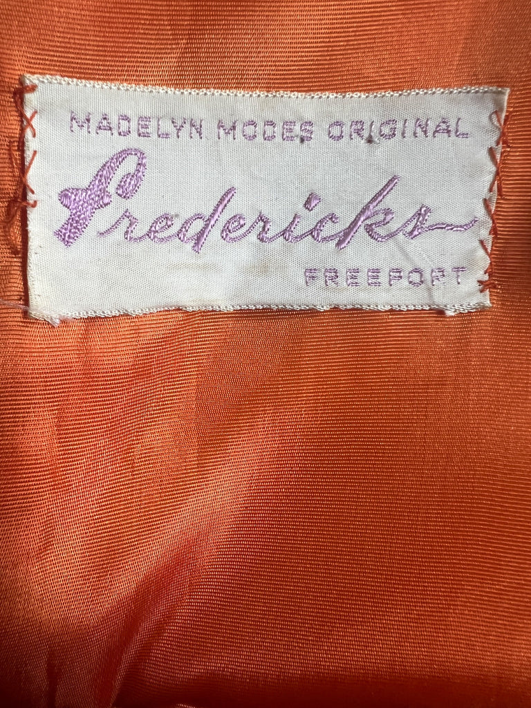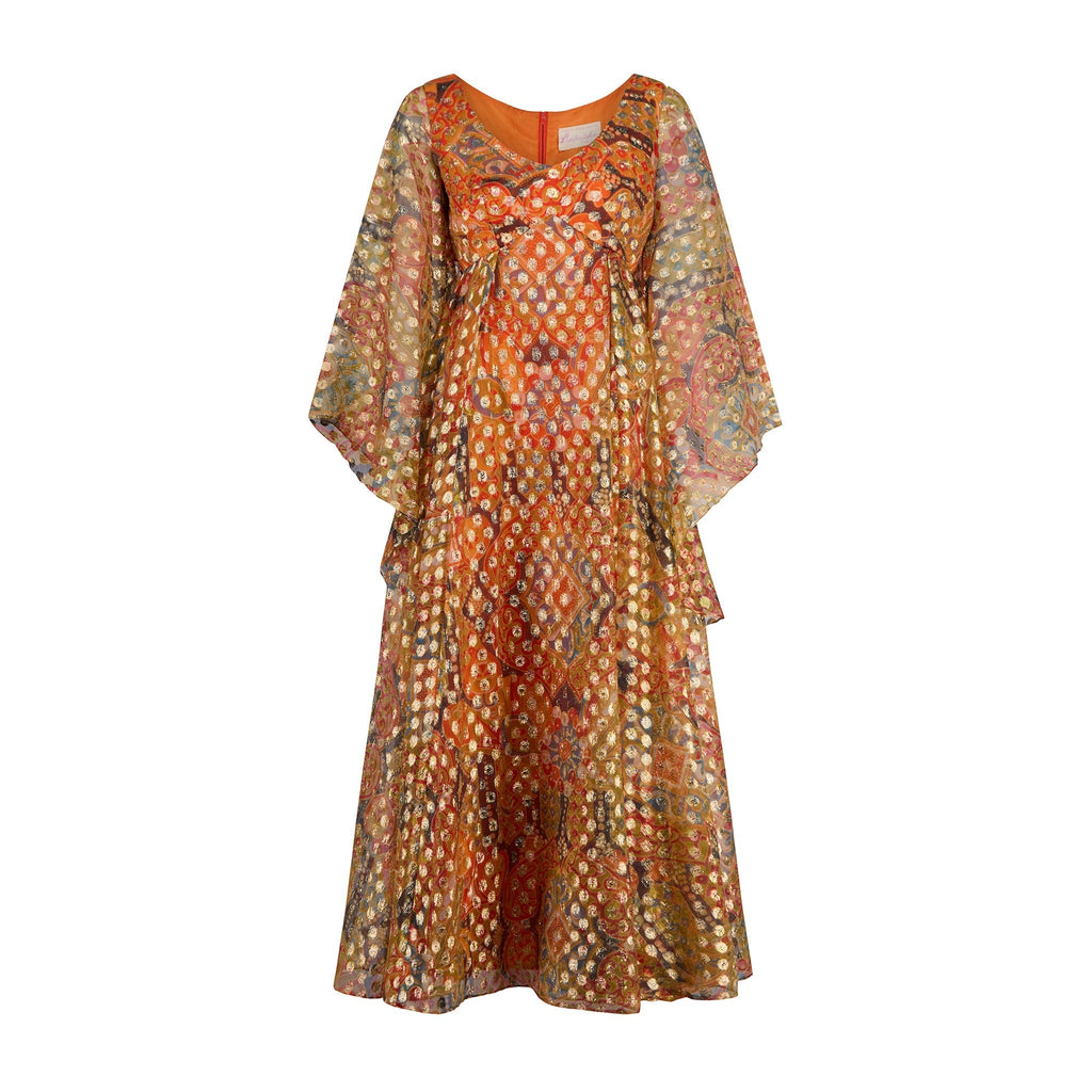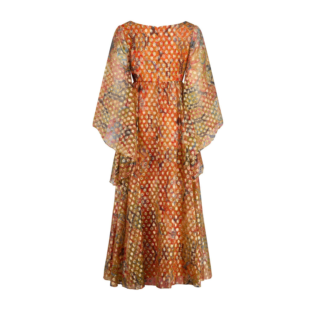 This striking, a-line maxi gown was designed by Madelyn Modes for Fredericks Freeport during the late 1960s to early 1970s. The fabric is mesmerising; a stiffened tangerine manmade chiffon printed with a blown-up paisley design in burnt orange, pale green and navy. It is detailed all-over with gold lurex metallic polka-dots that glisten as they catch the light. The dress has long, sheer sleeves cut to a dramatic angel silhouette which cascade down to the top of the thigh. The neckline is rounded and the maxi-length skirt falls in soft pleats from an empire-line bust. The dress is lined with an orange satin for a comfortable wear. It fastens at the back of the neck with a hidden tonal zip and hook-and-eye clasp.