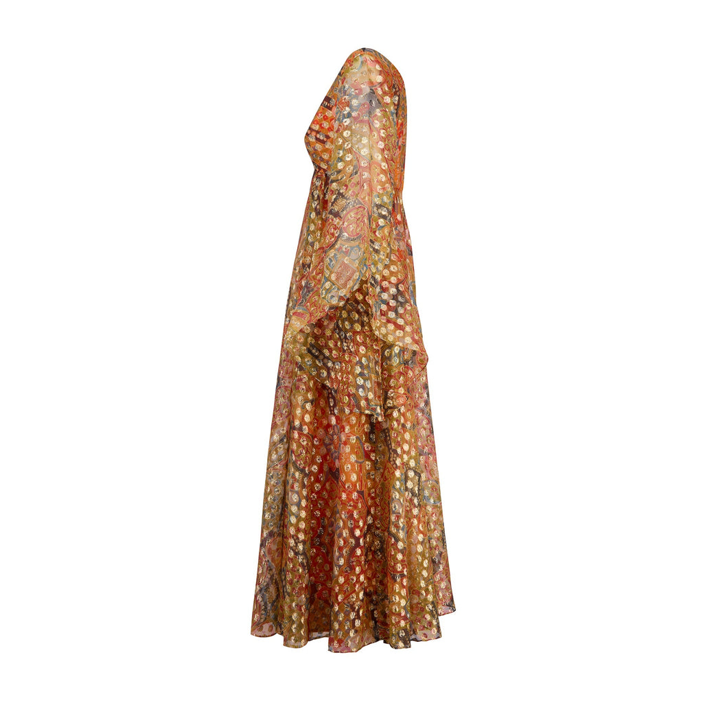 1970s Madelyn Modes Orange Metallic Paisley Angel Sleeve Maxi Dress
