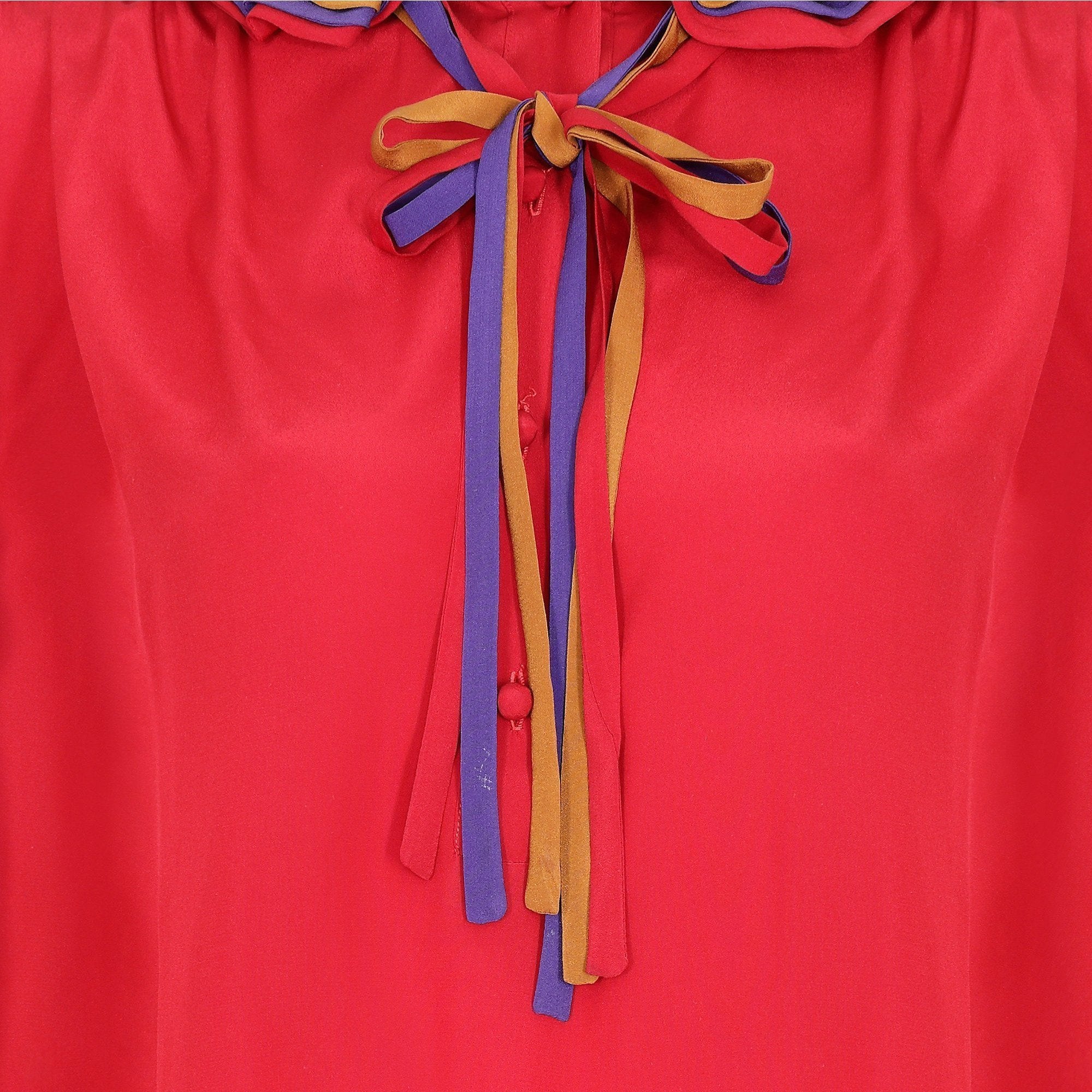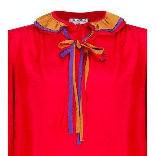This vintage ruffle collar red silk blouse is from revered French designer Ted Lapidus. Lapidus popularised sports utility wear and the safari suit look along with Yves Saint Laurent in the 1960s and '70s. A great example of 1970s daywear from this renowned but under-the-radar French designer. The blouse has a poet look about it with generous amounts of fabric in the bodice and sleeves. This gives the piece great versatility and could be styled a number of ways; either tucked in, loose and flowing or accessorised with a belt. The striking and solid block of bold red silk fabric is contrasted with a triple layered ruffle neckline and corresponding ribbon neckties in additional colours of purple and ochre. This blouse slips on over the head and fastens at the bust with silk covered buttons - also present on the cuffs - which stop halfway down the front. It is unlined.