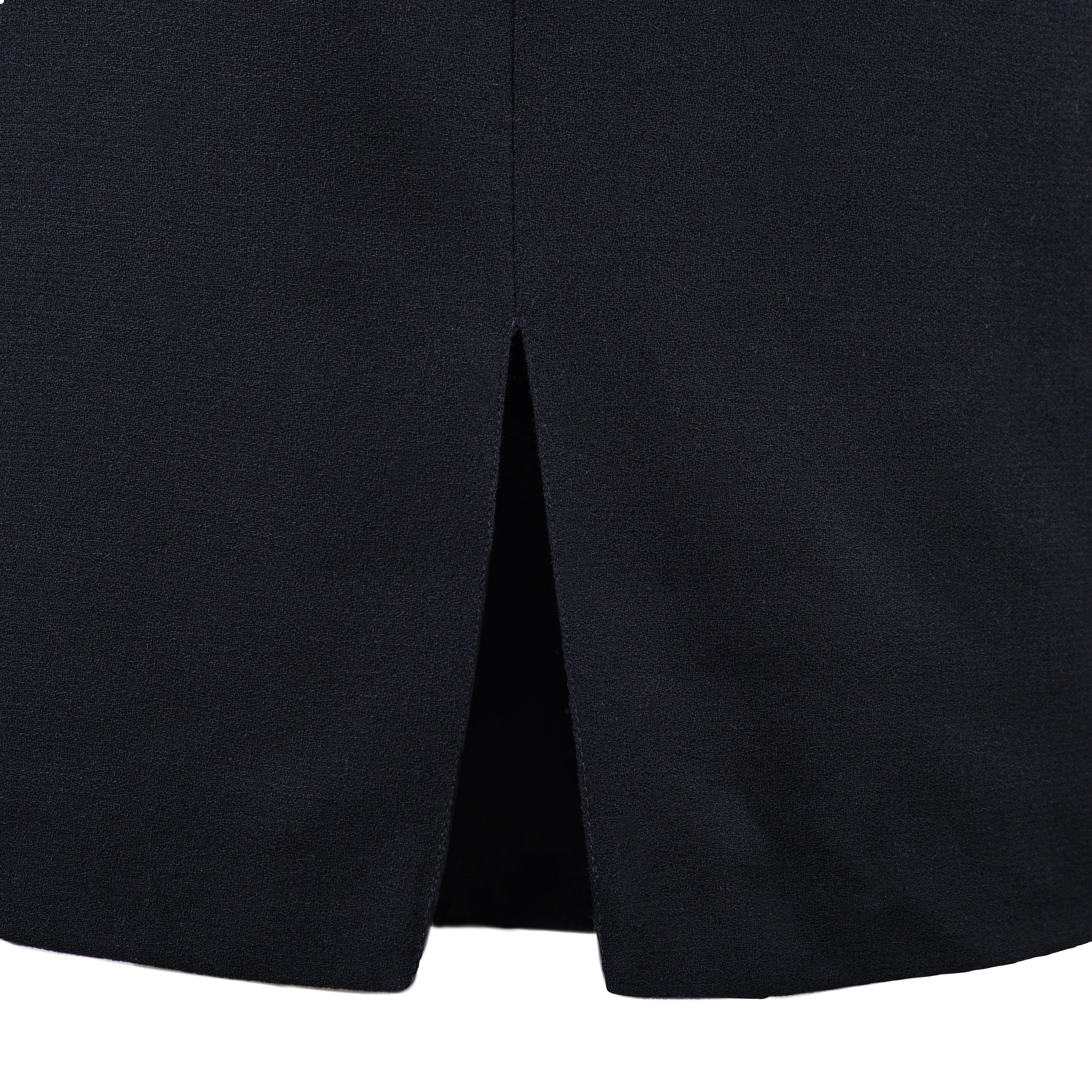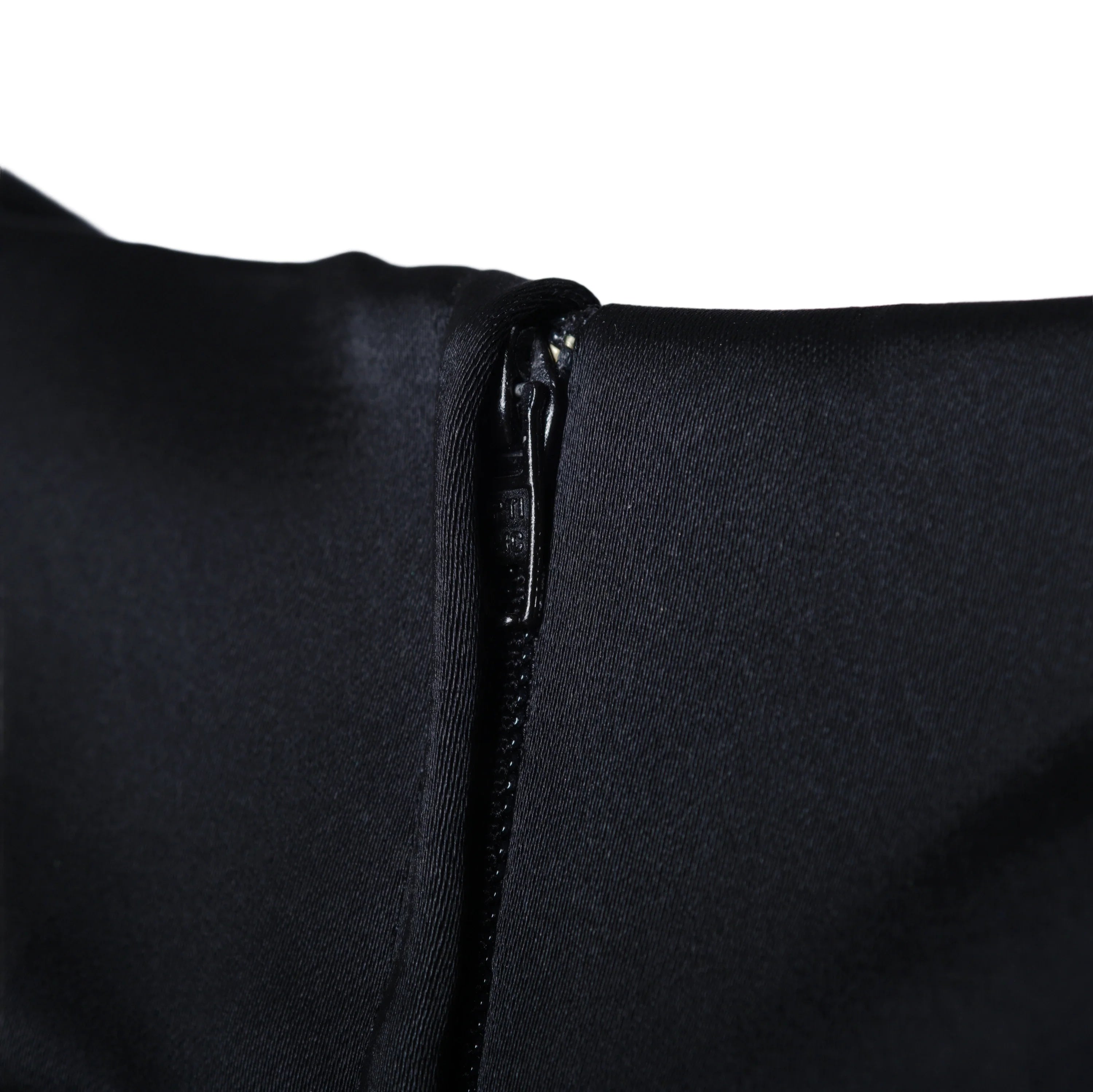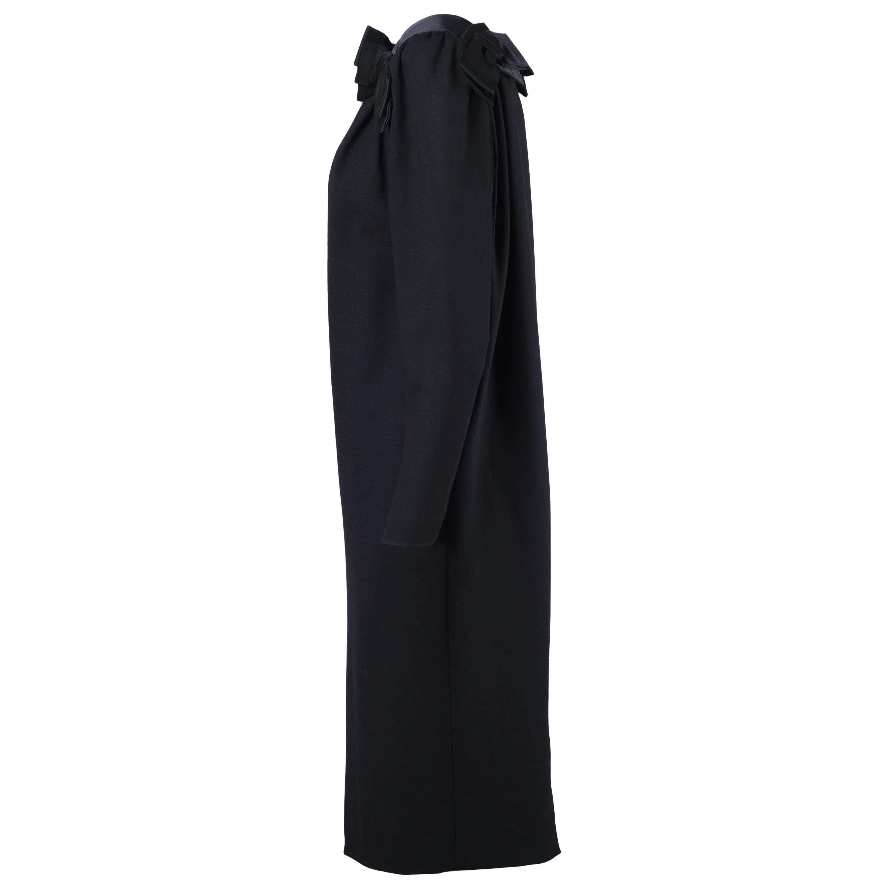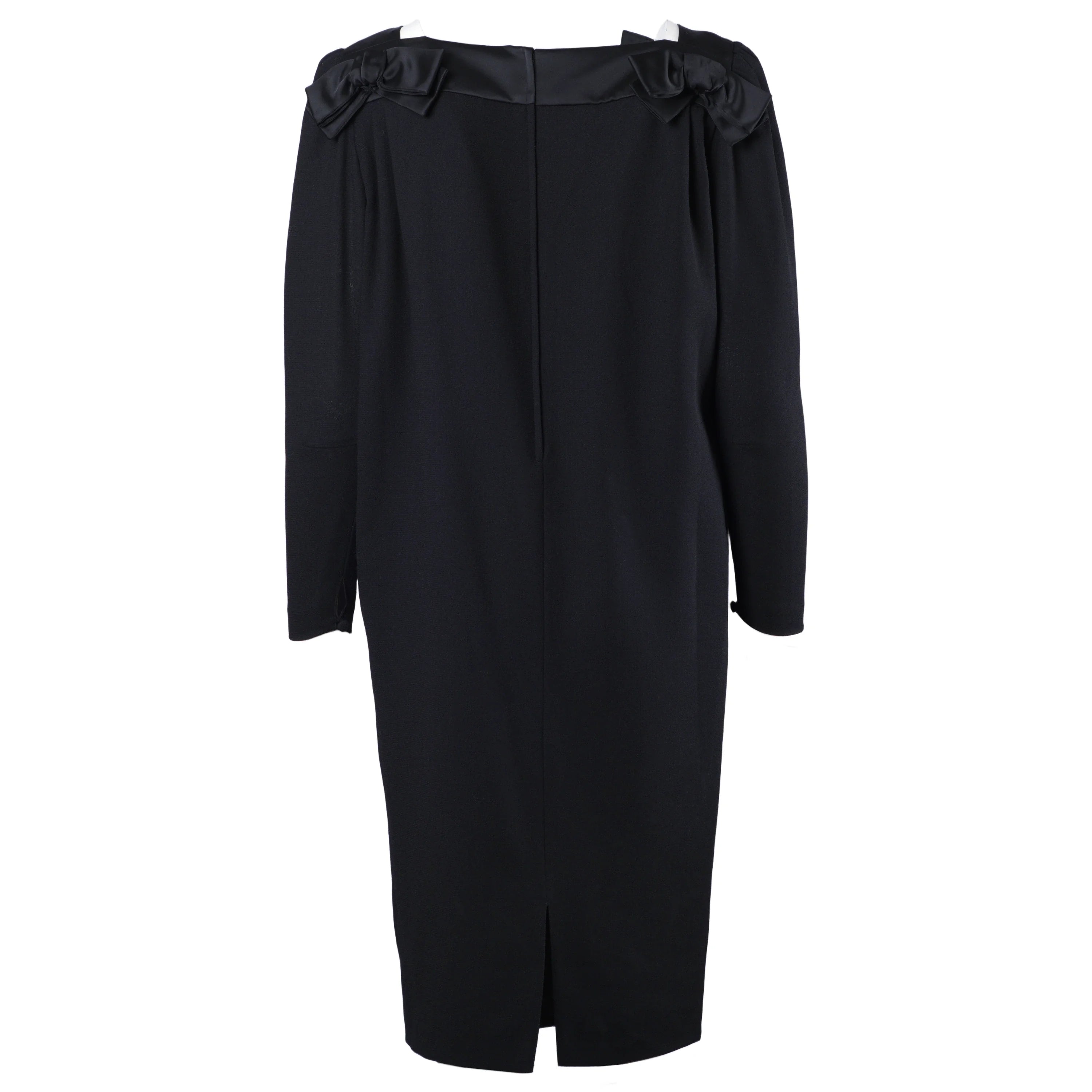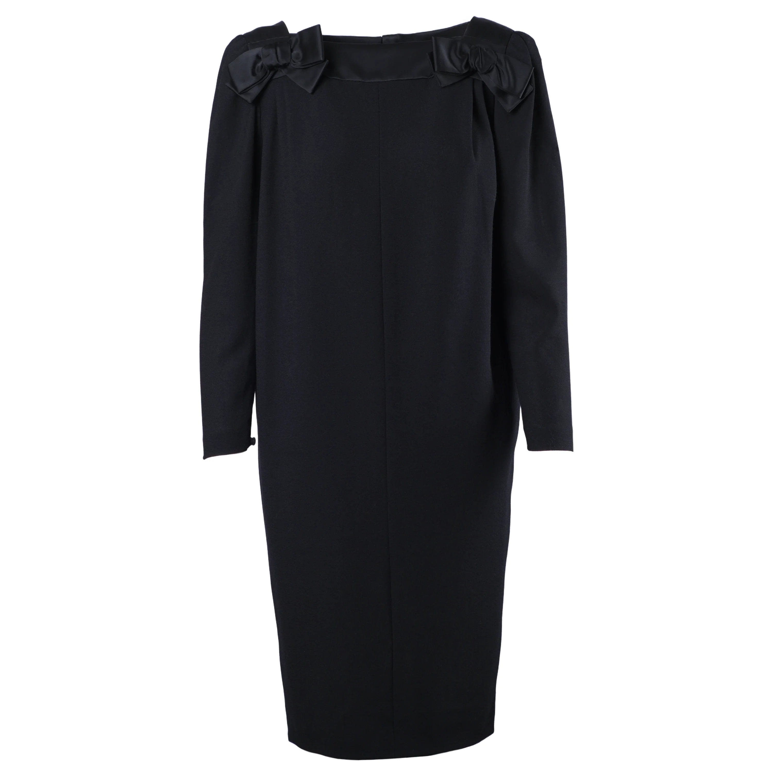 Black Flakes Dress by Guy Laroche, featuring a touch of playfulness with black satin bows framing the shoulders. The dress is made of pure wool. Its midi cut highlights the artisanal craftsmanship and the iconic style of the 1970s, making this piece a unique item for collectors and lovers of luxury vintage fashion.