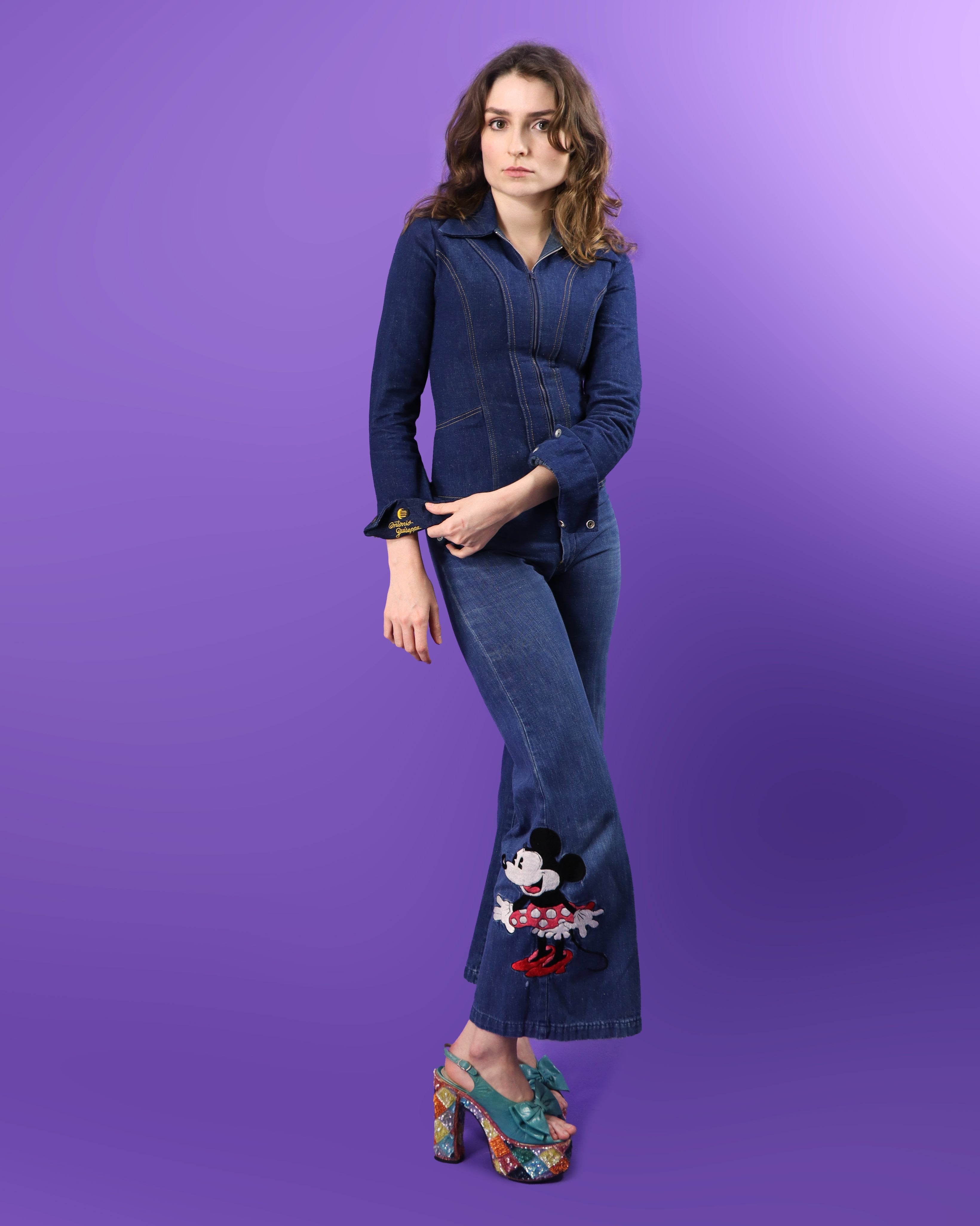 Fantastic vintage 1970s denim suit by iconic LA based brand Antonio Guiseppe, designer Philip Havice. Part of an official collaboration with Disney. Featuring a beautiful embroidery of Minnie Mouse on the back panel of the jacket and side of the flare. High quality dark indigo denim cut with a dagger collar, sunray panelling and double over cuffs. The flares are high waisted with branding on the back pocket. Super cool & rare piece of fashion history!