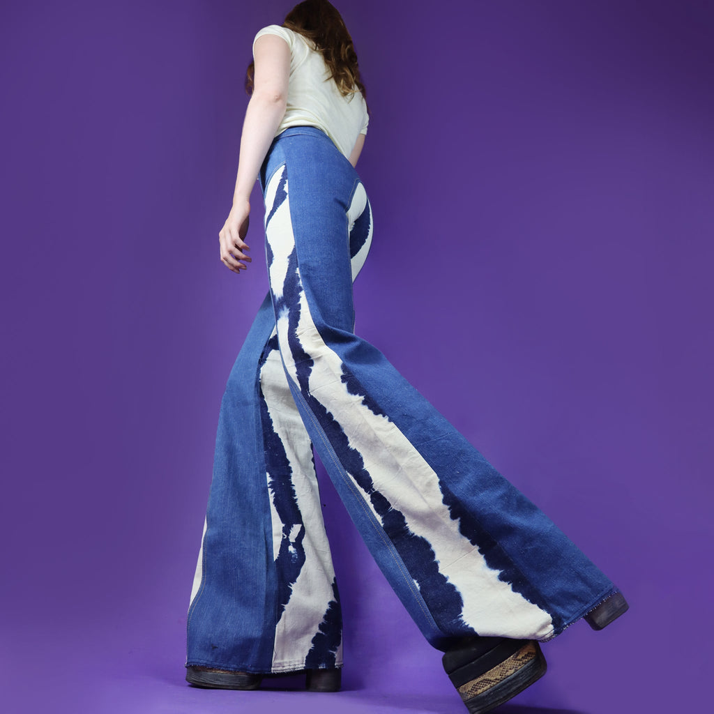 Show stopping holy grail vintage 1970s denim flares by Antonio Guiseppe. An LA based brand from the 70s created by designer Philip Havice, AG produced couture quality unisex denim pieces. Made from lightweight raw indigo denim and featuring contrasted panels with tie dye affect swirling up each leg. Cut with a western saddleback and flattering panelling on the front. Some of the best denim on the planet! Deadstock unworn condition.
