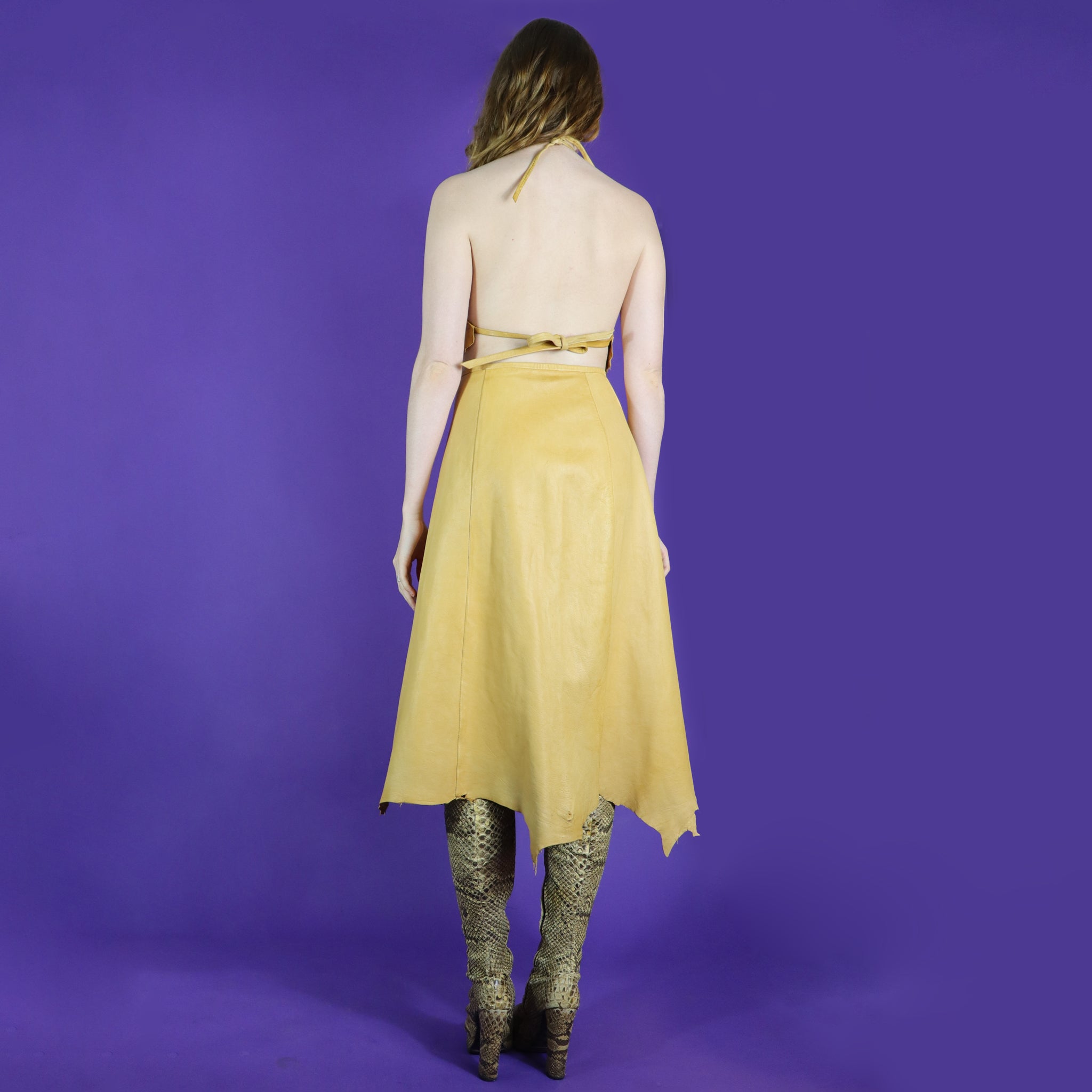 Vintage 1970s native inspired hippie buckskin skirt and halterneck set, hand made in California in the 70s. Beautiful soft warm sand coloured buckskin leather with whipstitch detailing, tassels, beads and feathers. Consists of a halterneck shaped top & wrap skirt with waterfall front. I love the raw cut of the edging & the a-line skirt. Such a rare & specialpiece