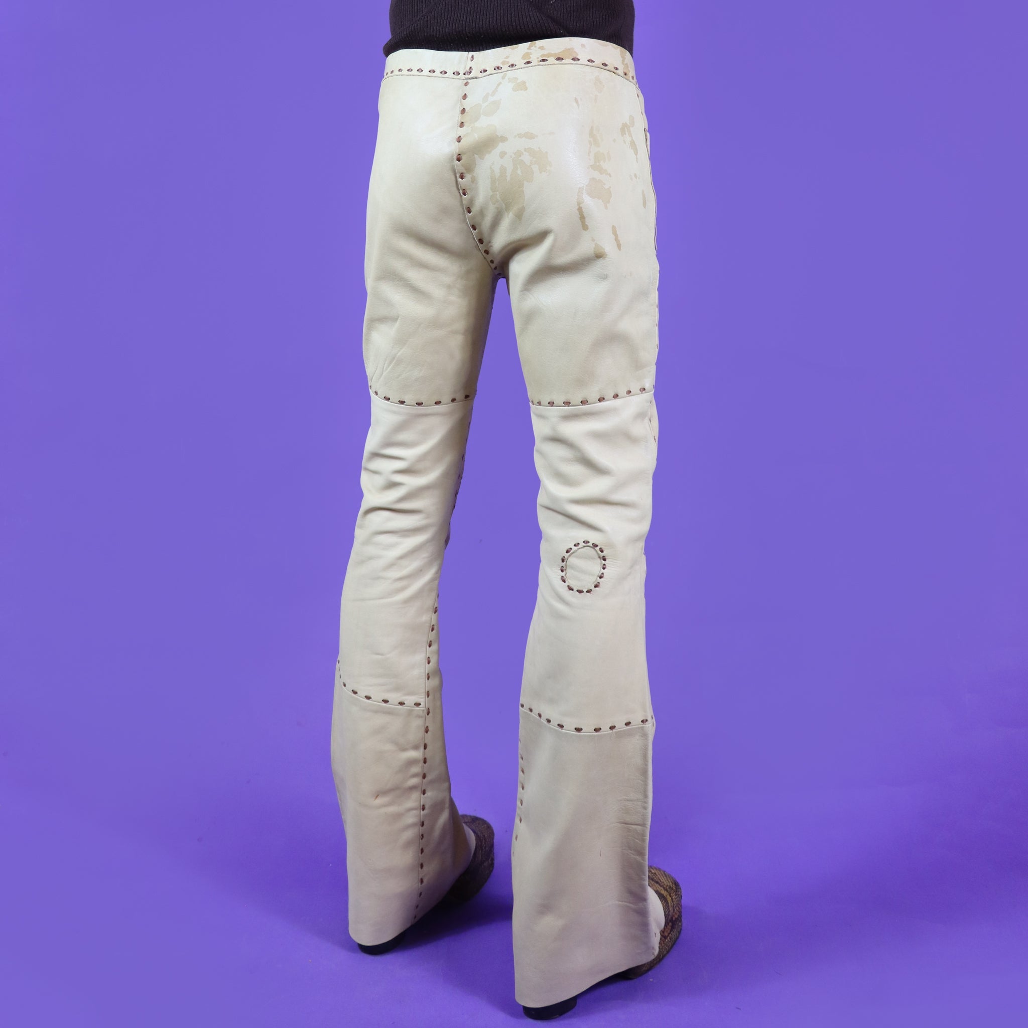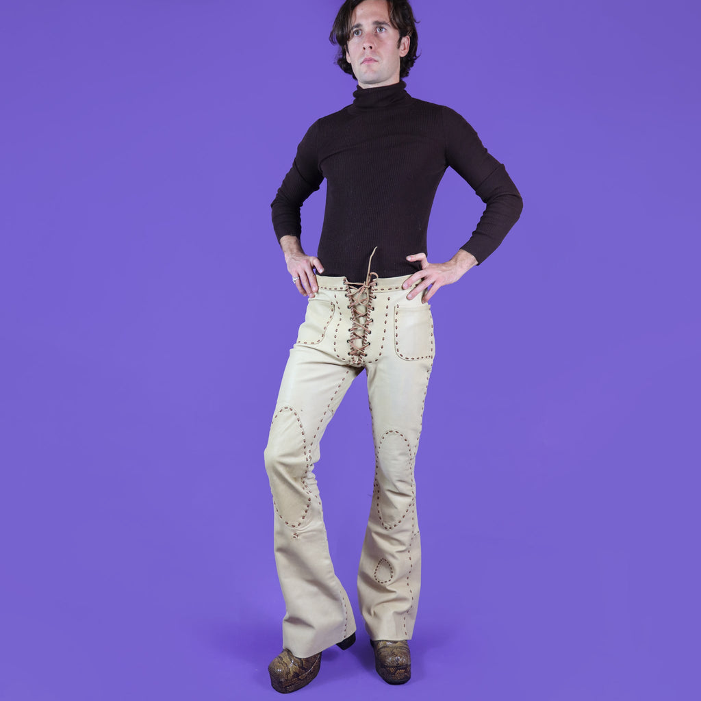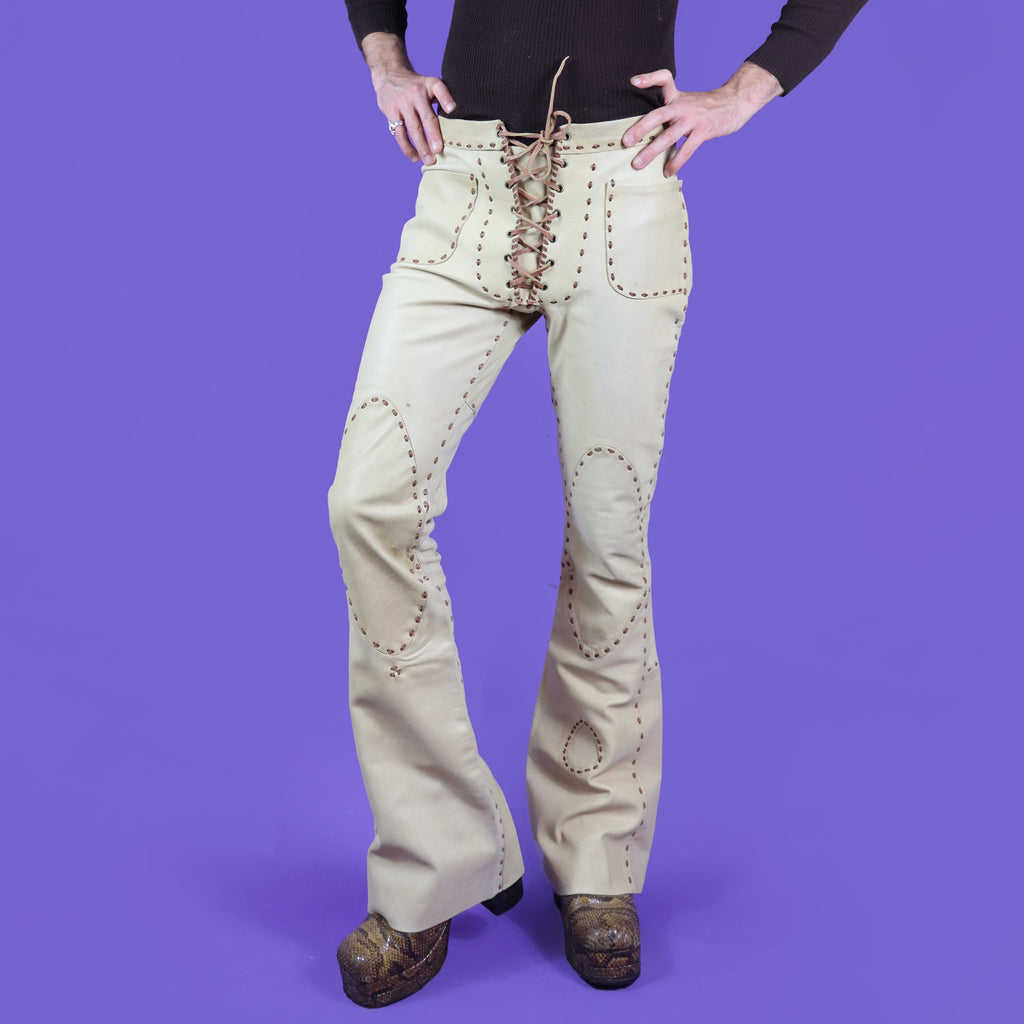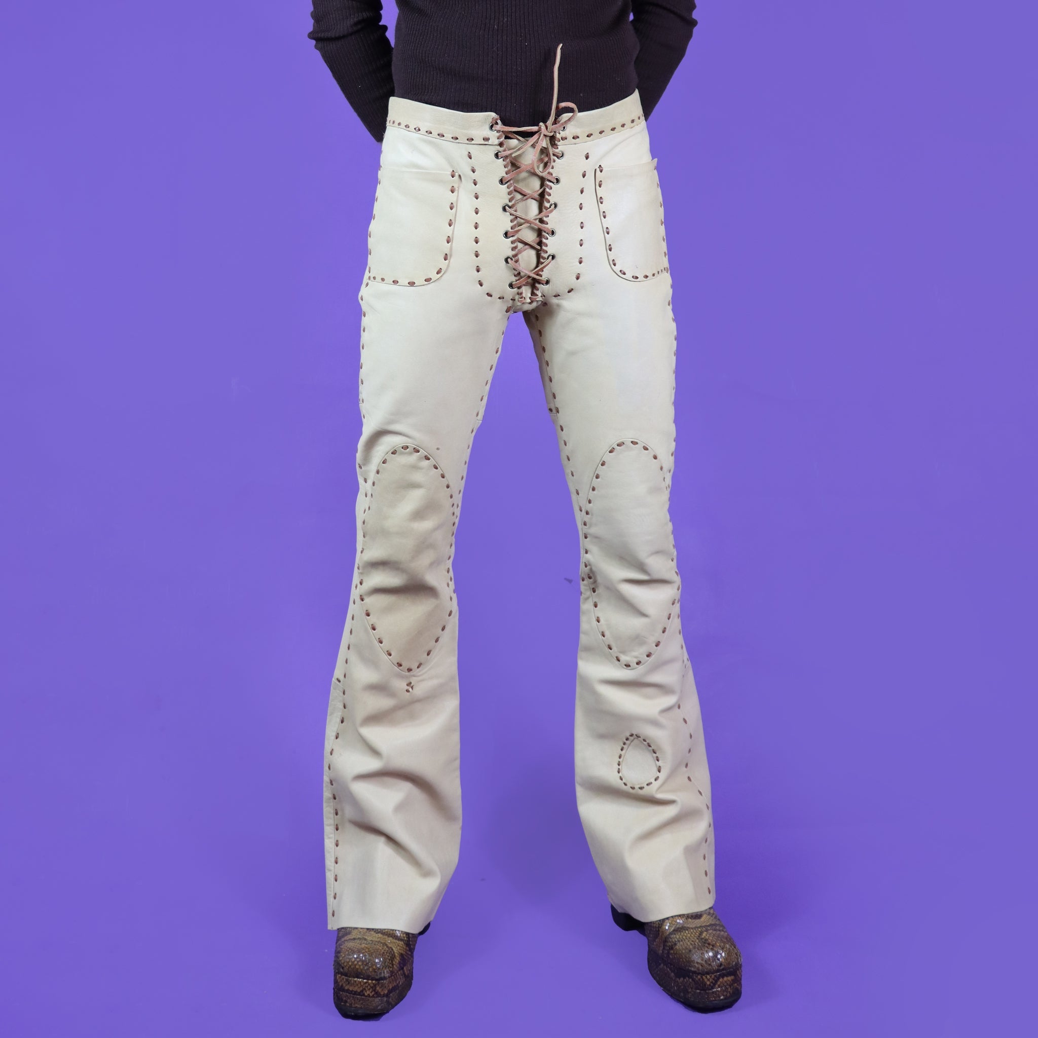 Fantastic vintage 1970s whipstitch leather flares by M&H Leather, a Sante Fe based brand. Beautifully made using thick, high quality cream leather with contrasting tan leather stitch. Very similar to North Beach Leather in styling with lace up fastening, whipstitching around the panels and flare at the knee. I love the whipstitch bordered patches! A true rarity!