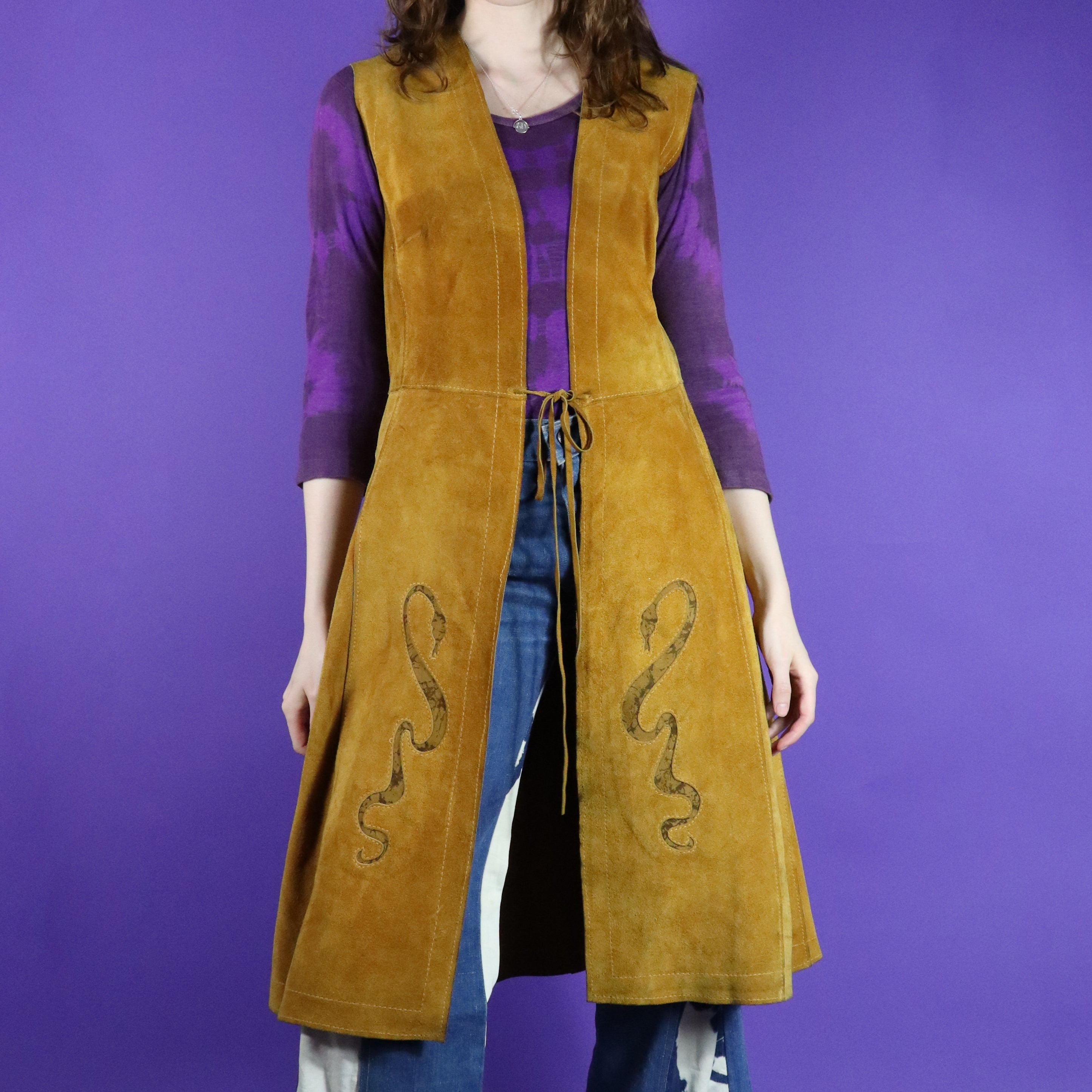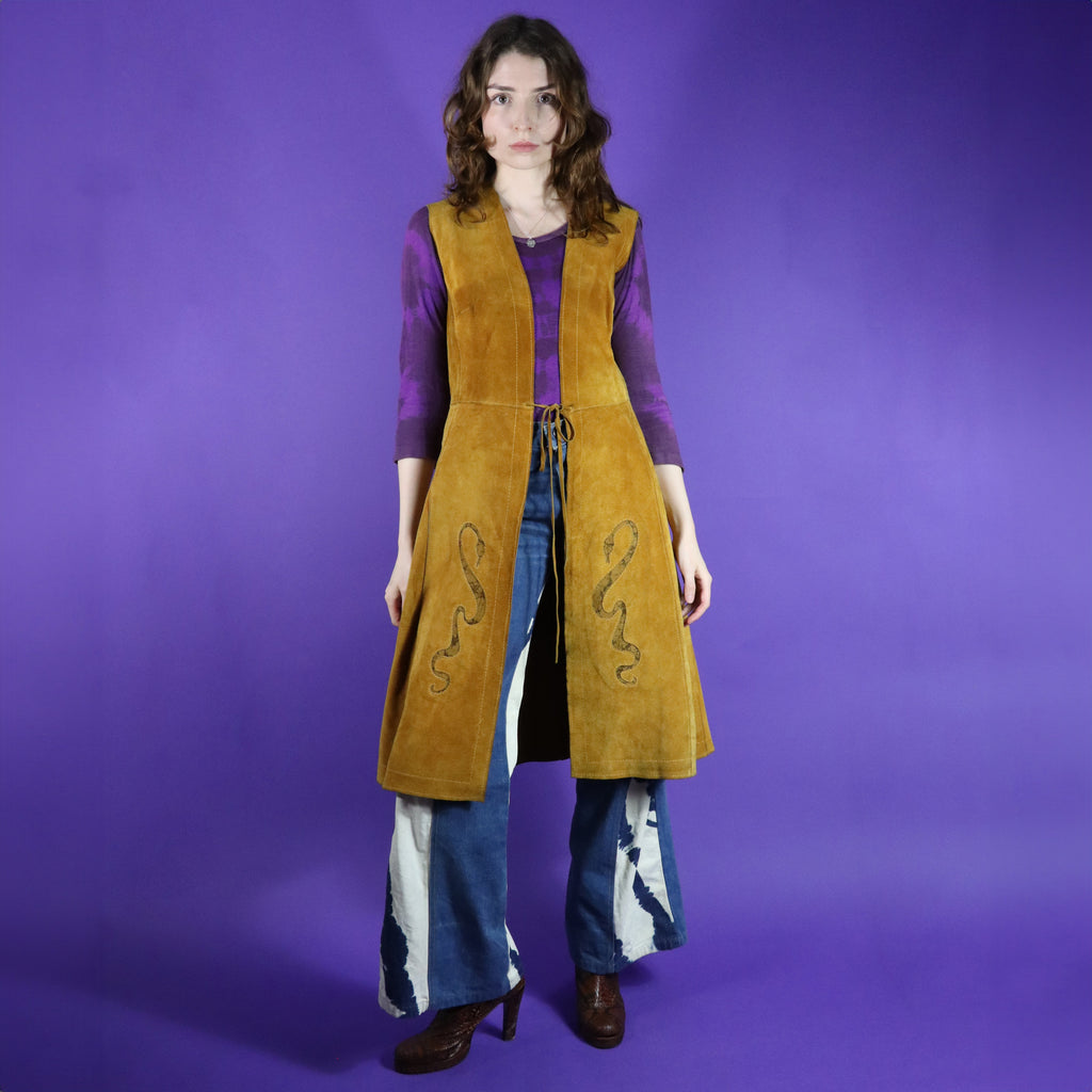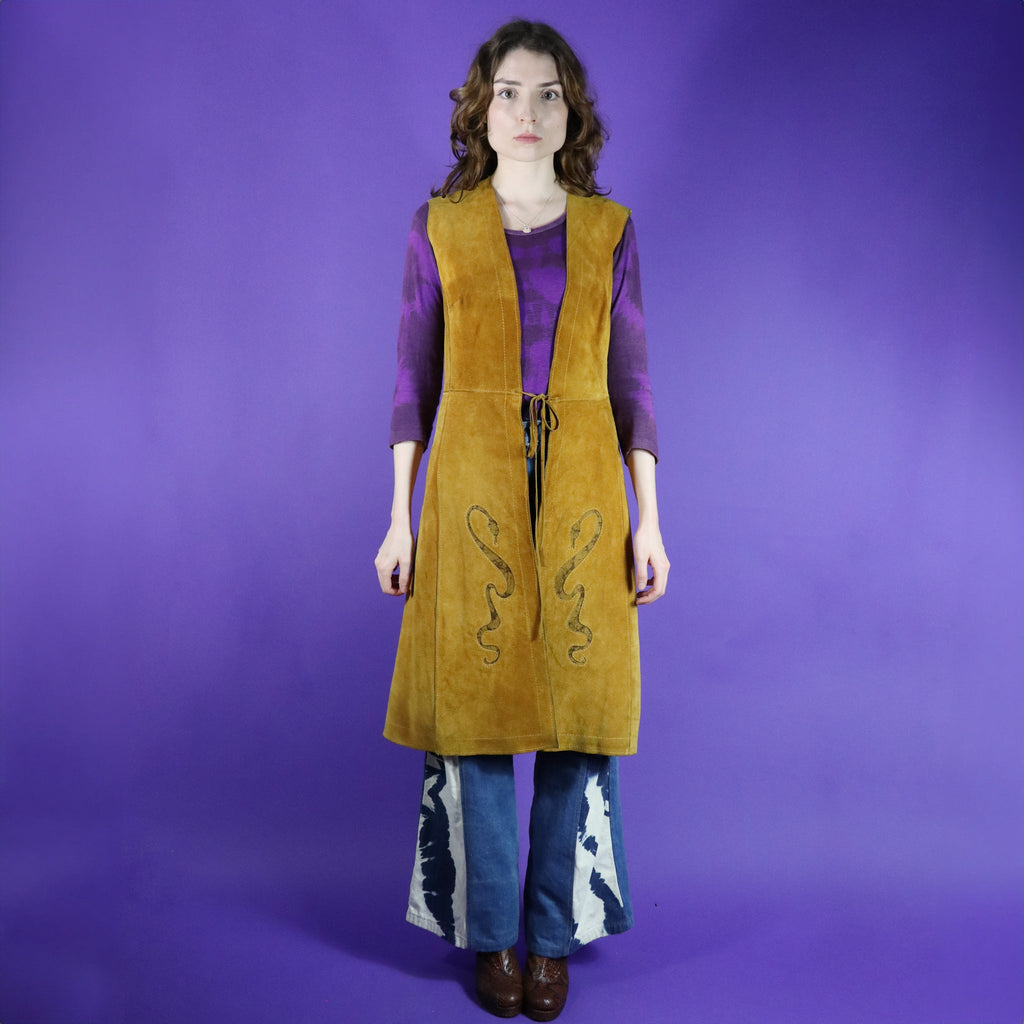 Stunning serpent detail vintage 1960s / 1970s tan suede duster vest. Beautifully made with butter soft golden tan suede & snake shaped cut outs with marbled suede inserts. Knee length & fastens using a tie string- a perfect layering vest. A carefully made piece & a super rare one too- a wearable work of art.