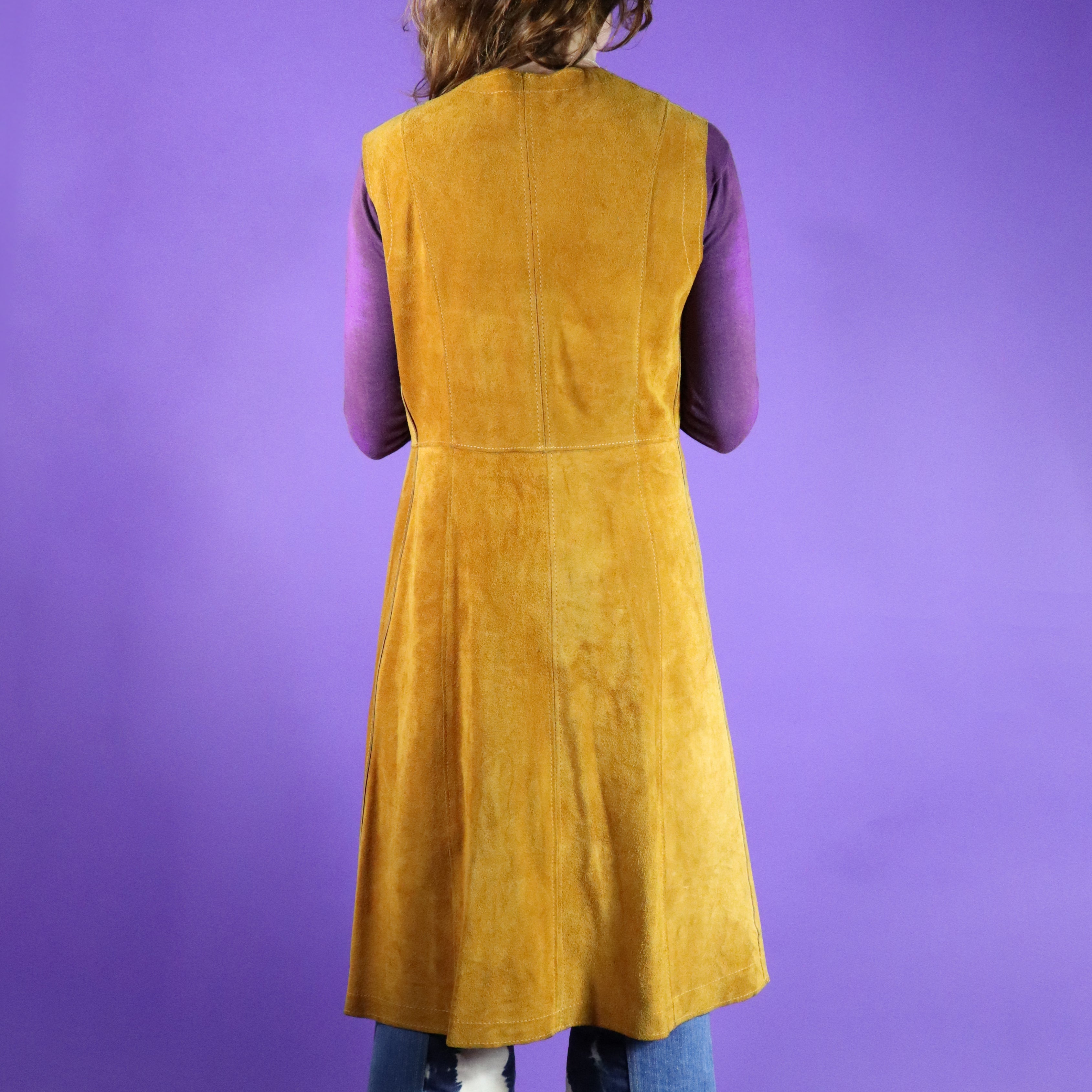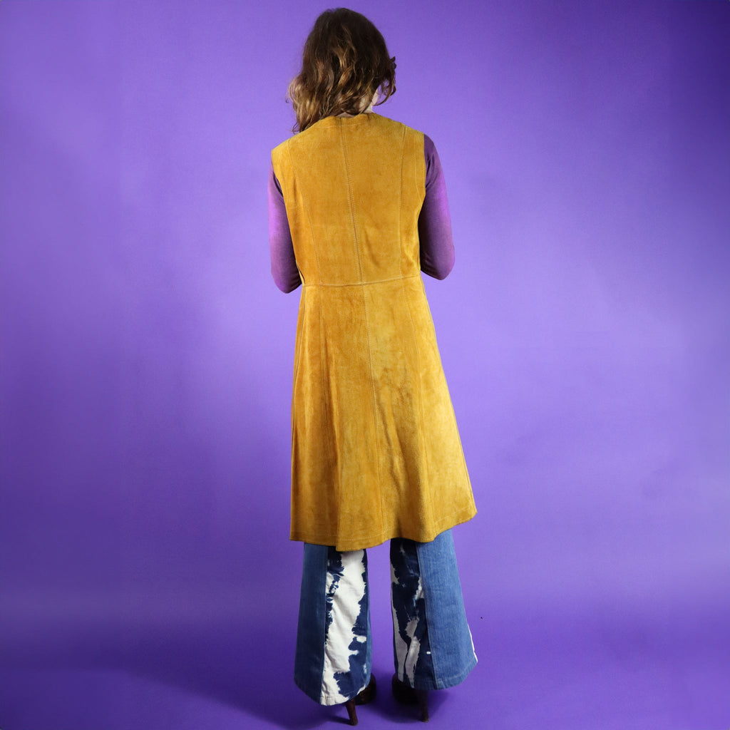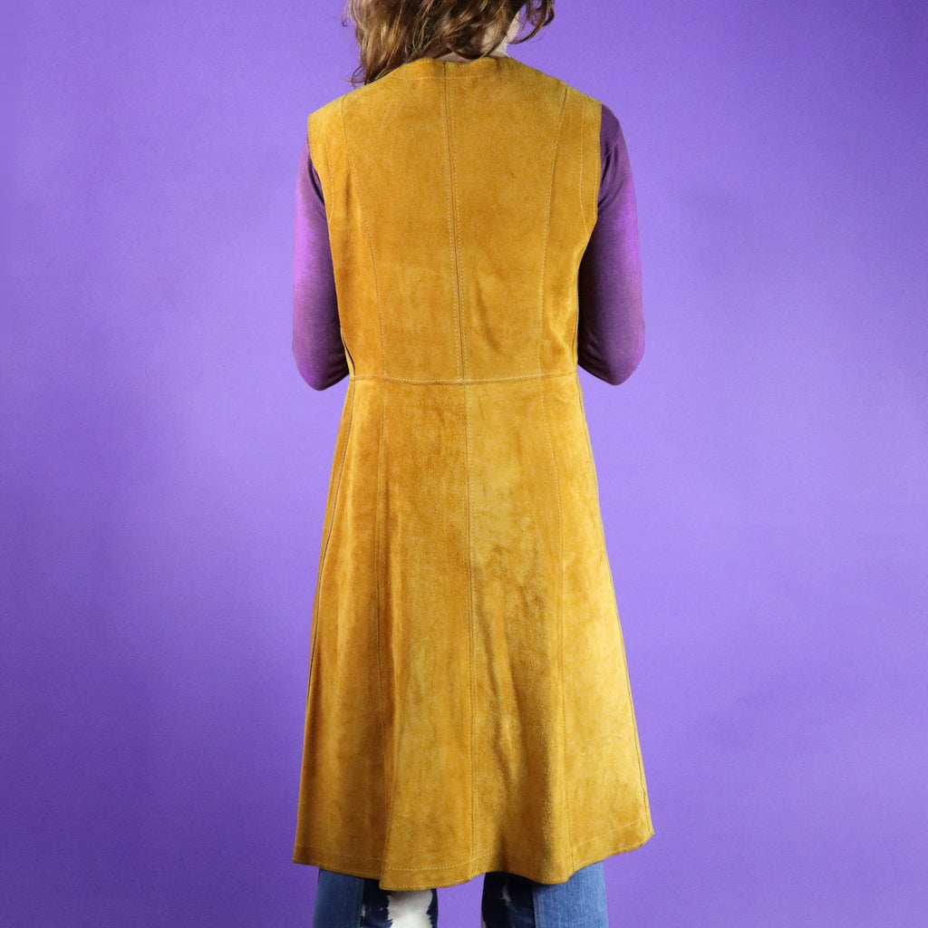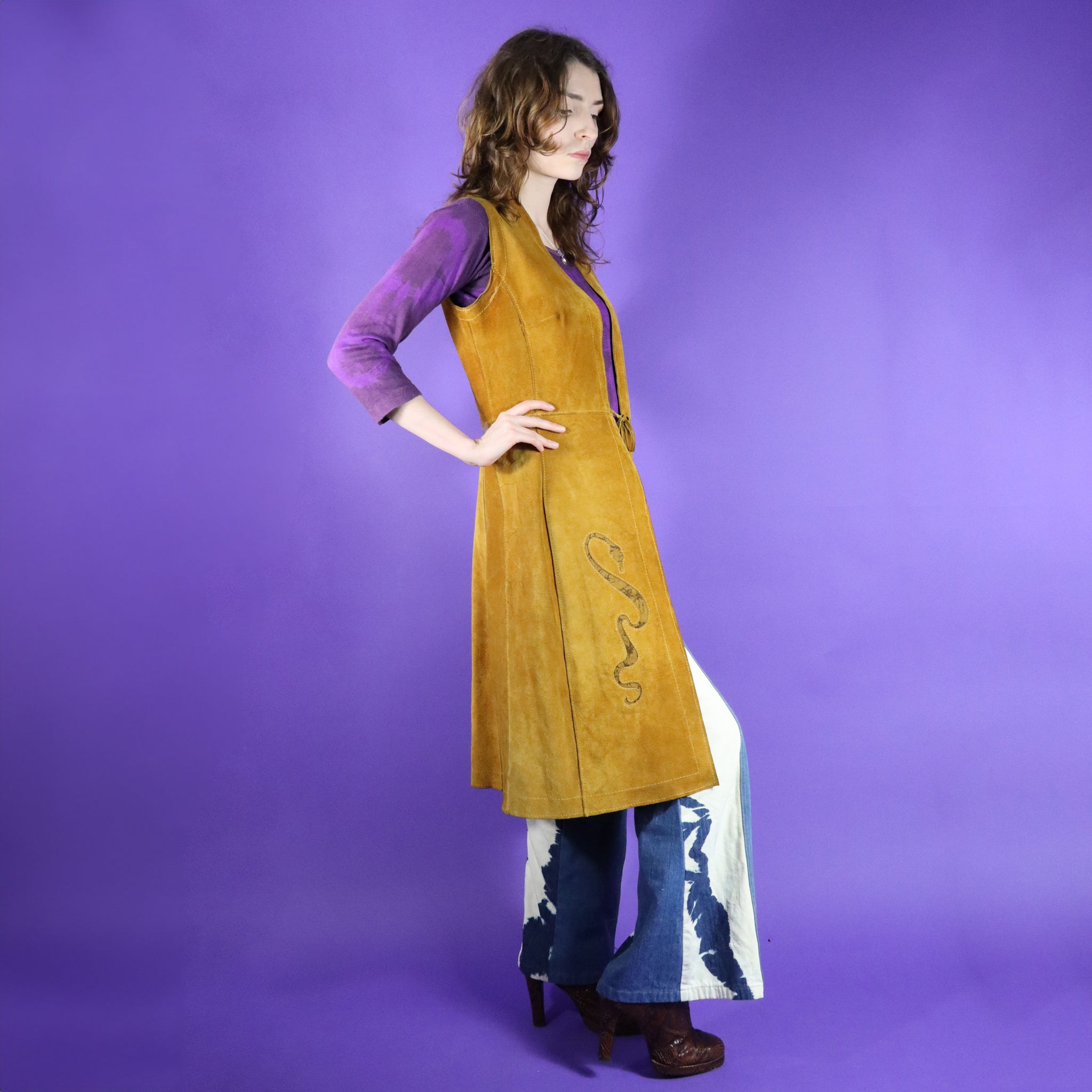 Stunning serpent detail vintage 1960s / 1970s tan suede duster vest. Beautifully made with butter soft golden tan suede & snake shaped cut outs with marbled suede inserts. Knee length & fastens using a tie string- a perfect layering vest. A carefully made piece & a super rare one too- a wearable work of art.