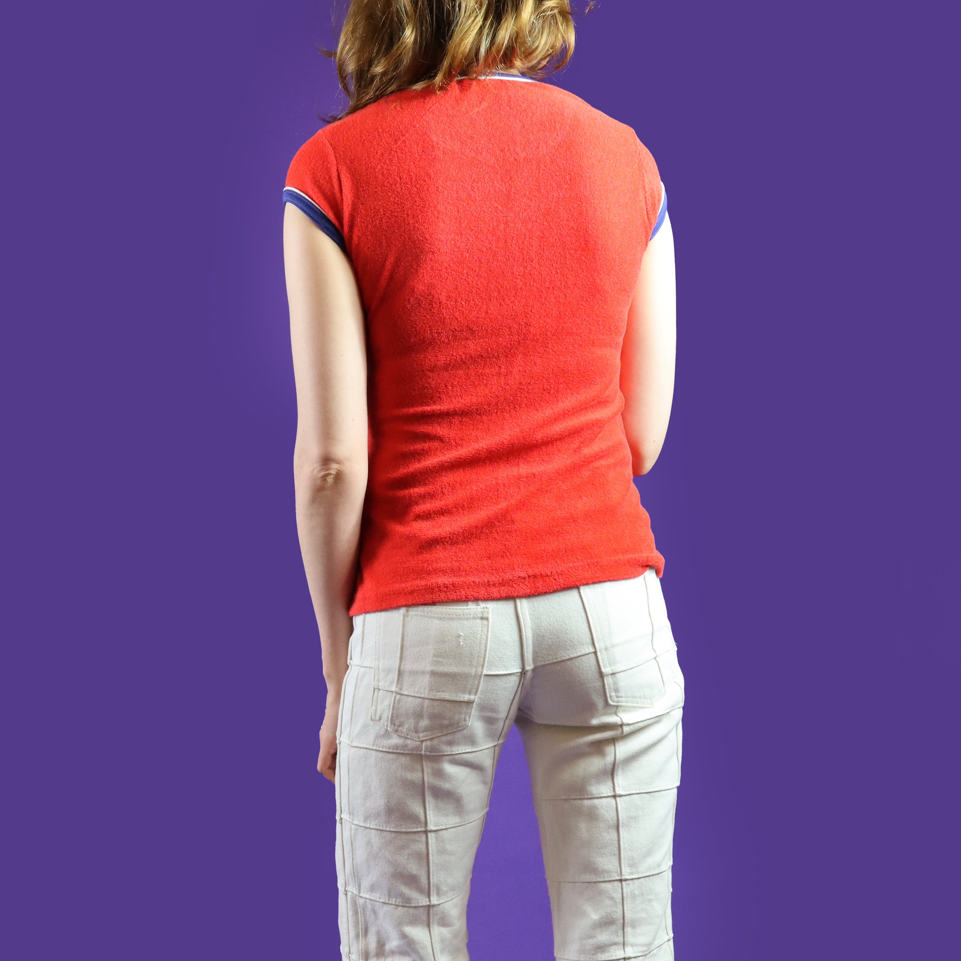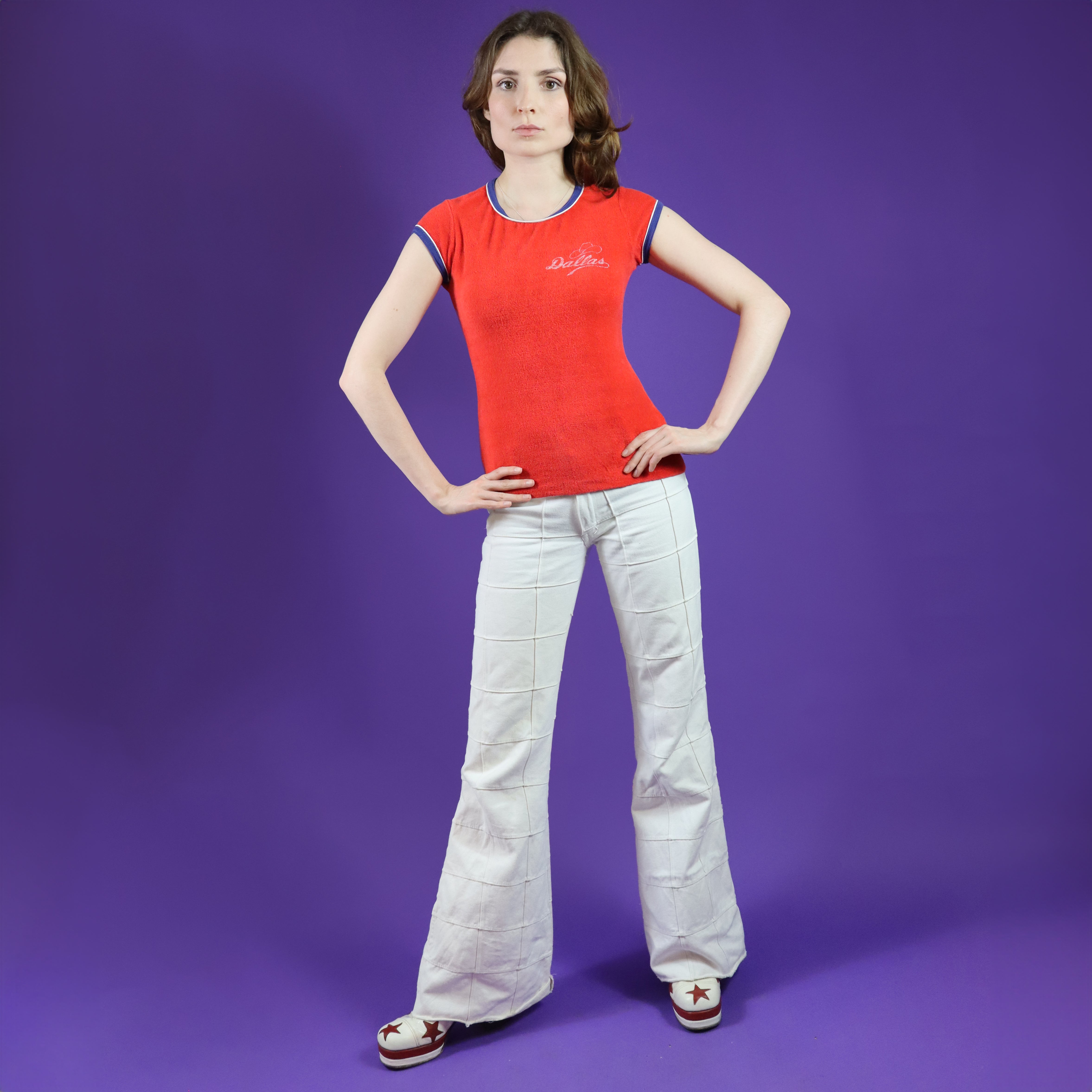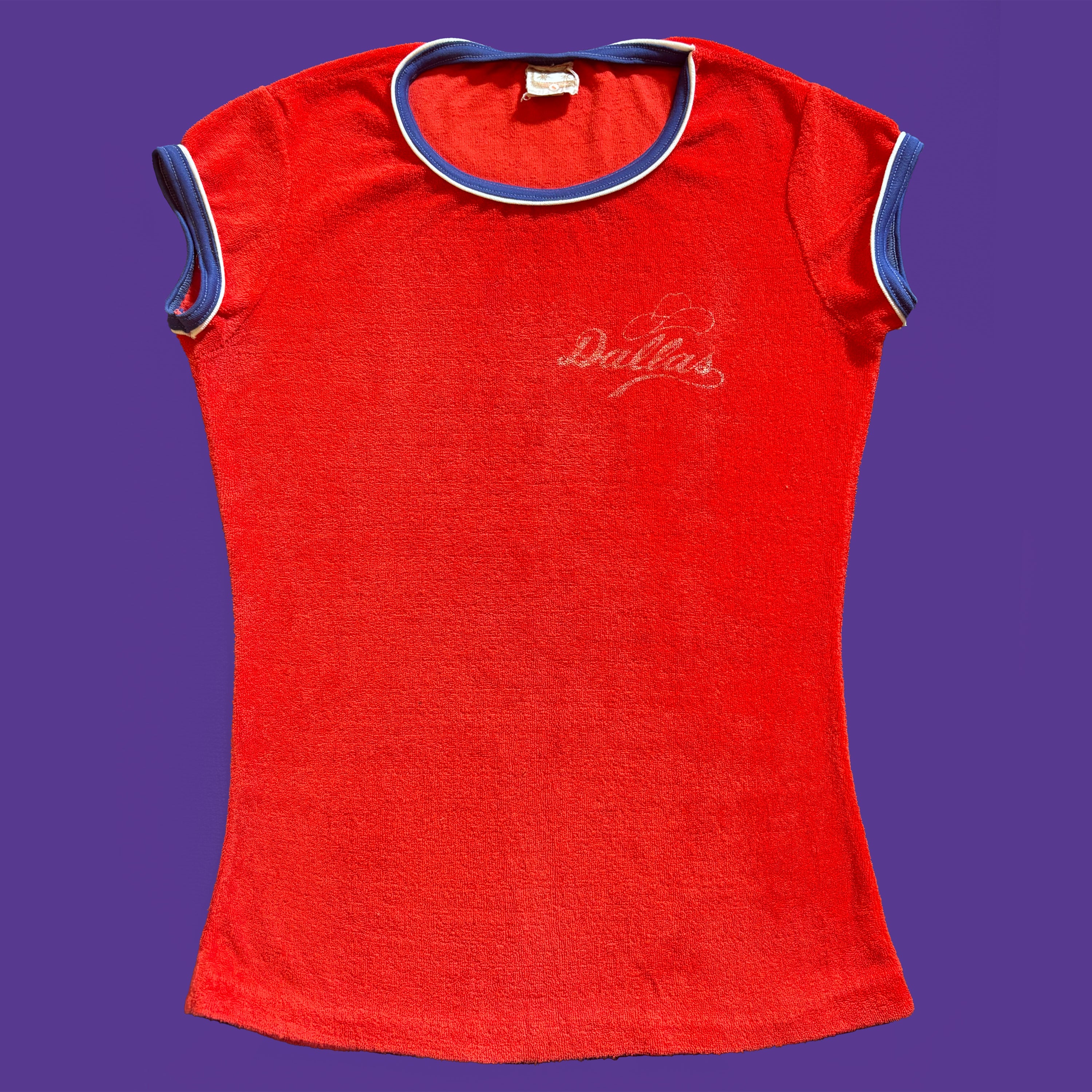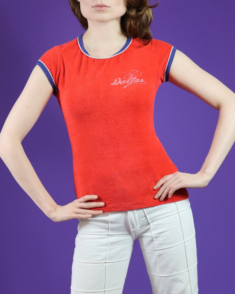This top is red towelling / terry cloth and features muscle tee sleeve with tight blue and white ribbing and printed with Dallas in a coca cola style font and a cowboy hat above. Perfect Summer tee!