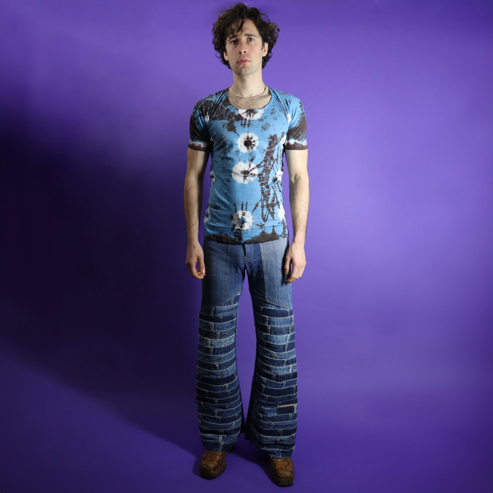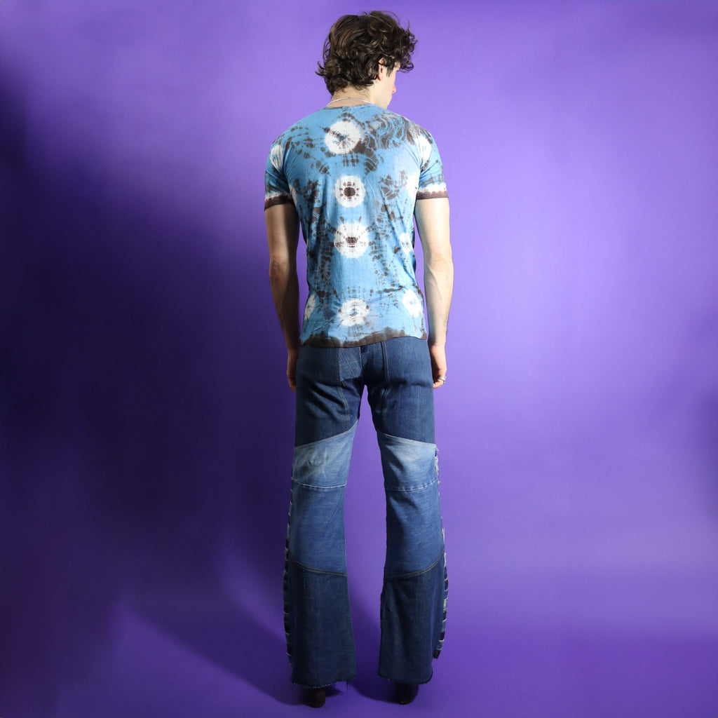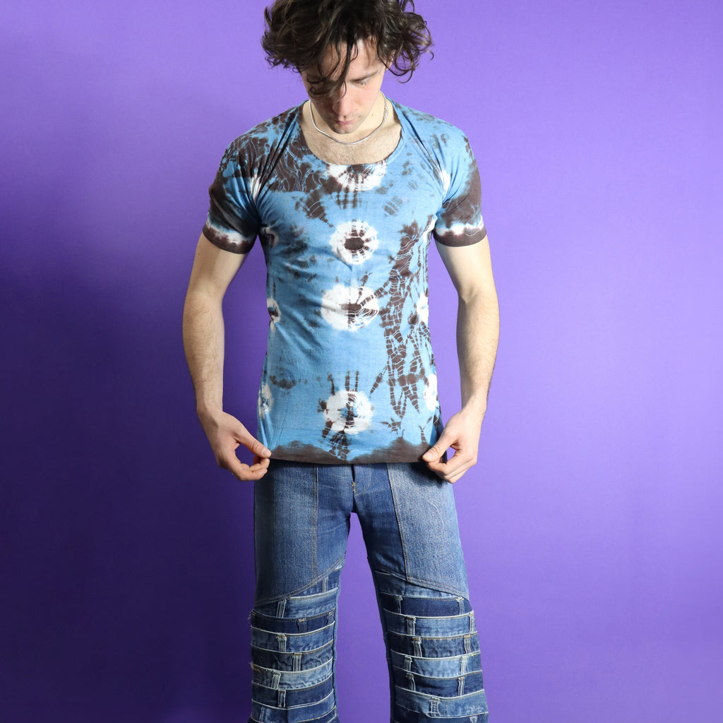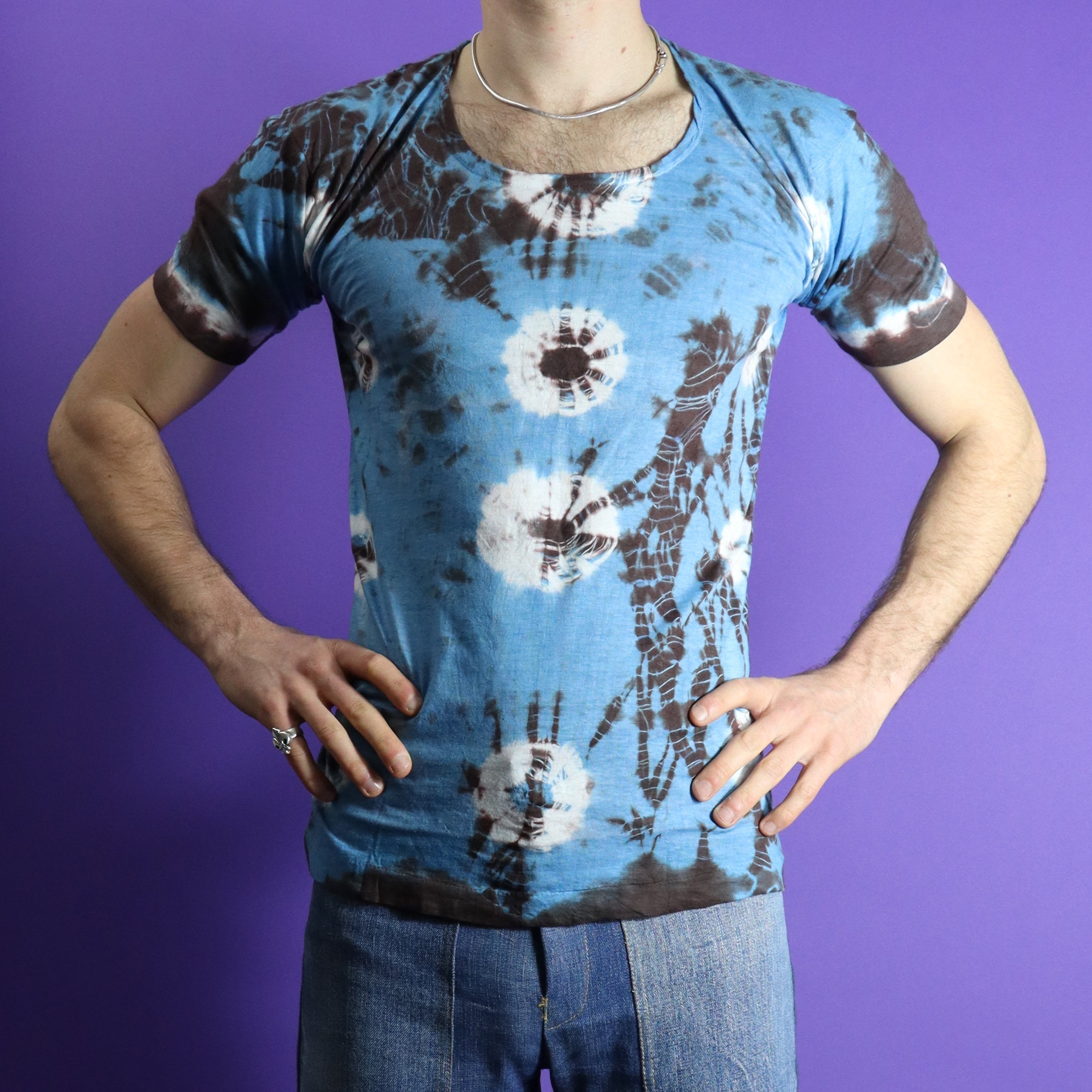 Beautiful deadstock vintage 1970s Indian cotton t-shirt by a Long Beach California based Import label. Beautiful soft cotton tie dyed using blue and brown inks. Classic 70s tee shape with rounded scoop neckline and tight sleeves.