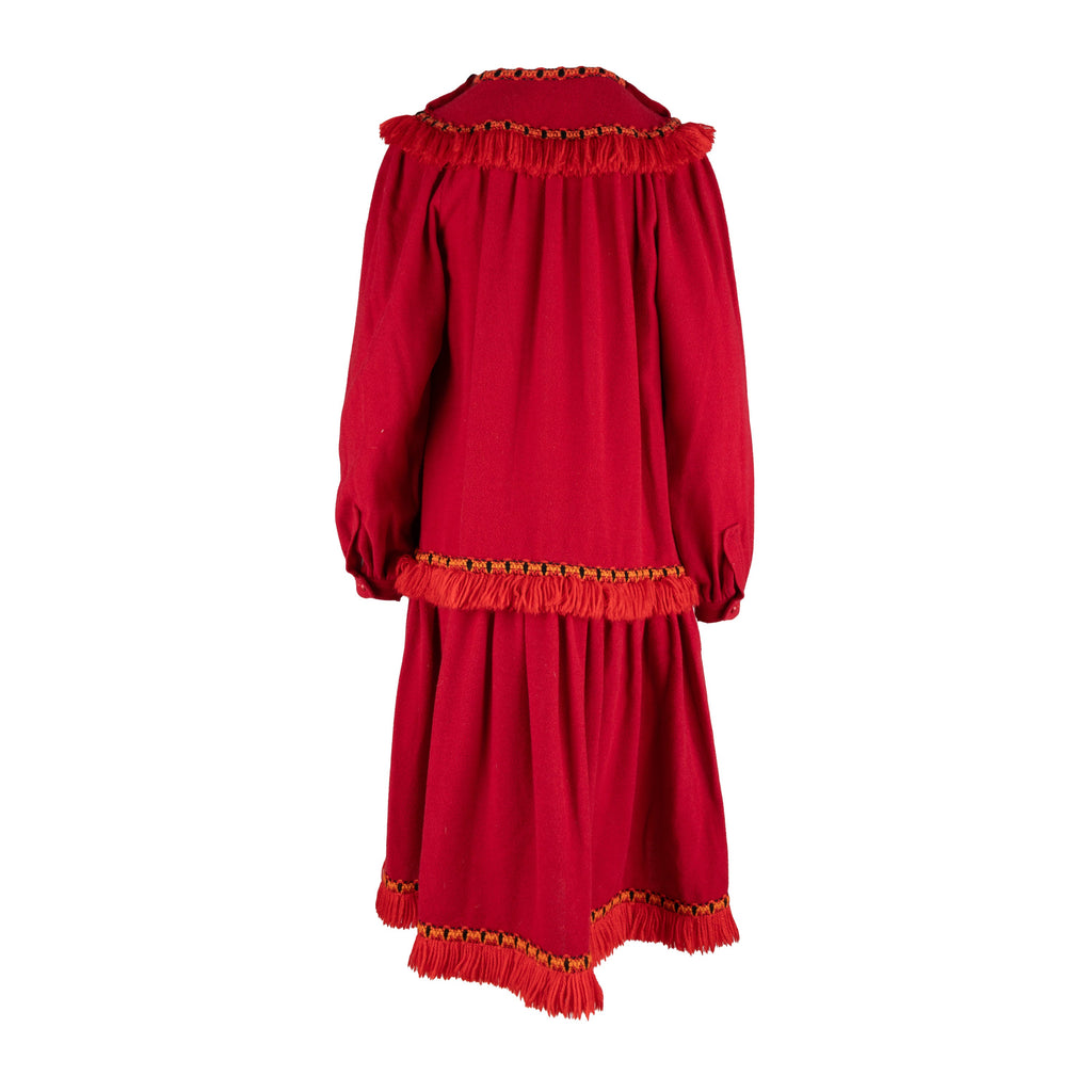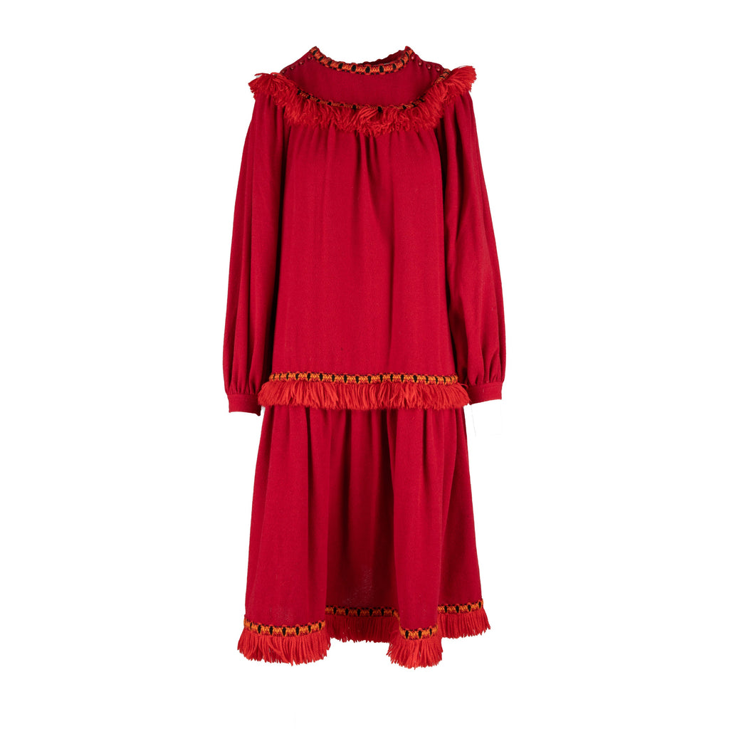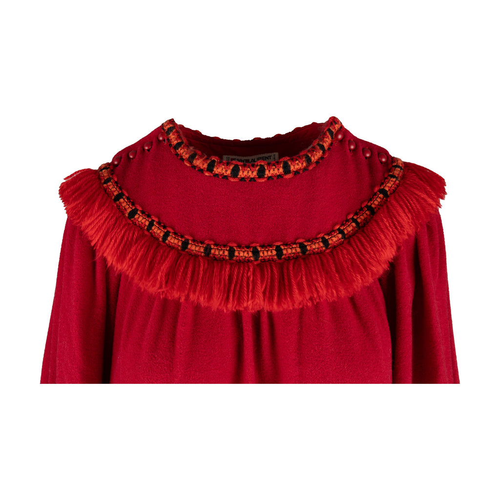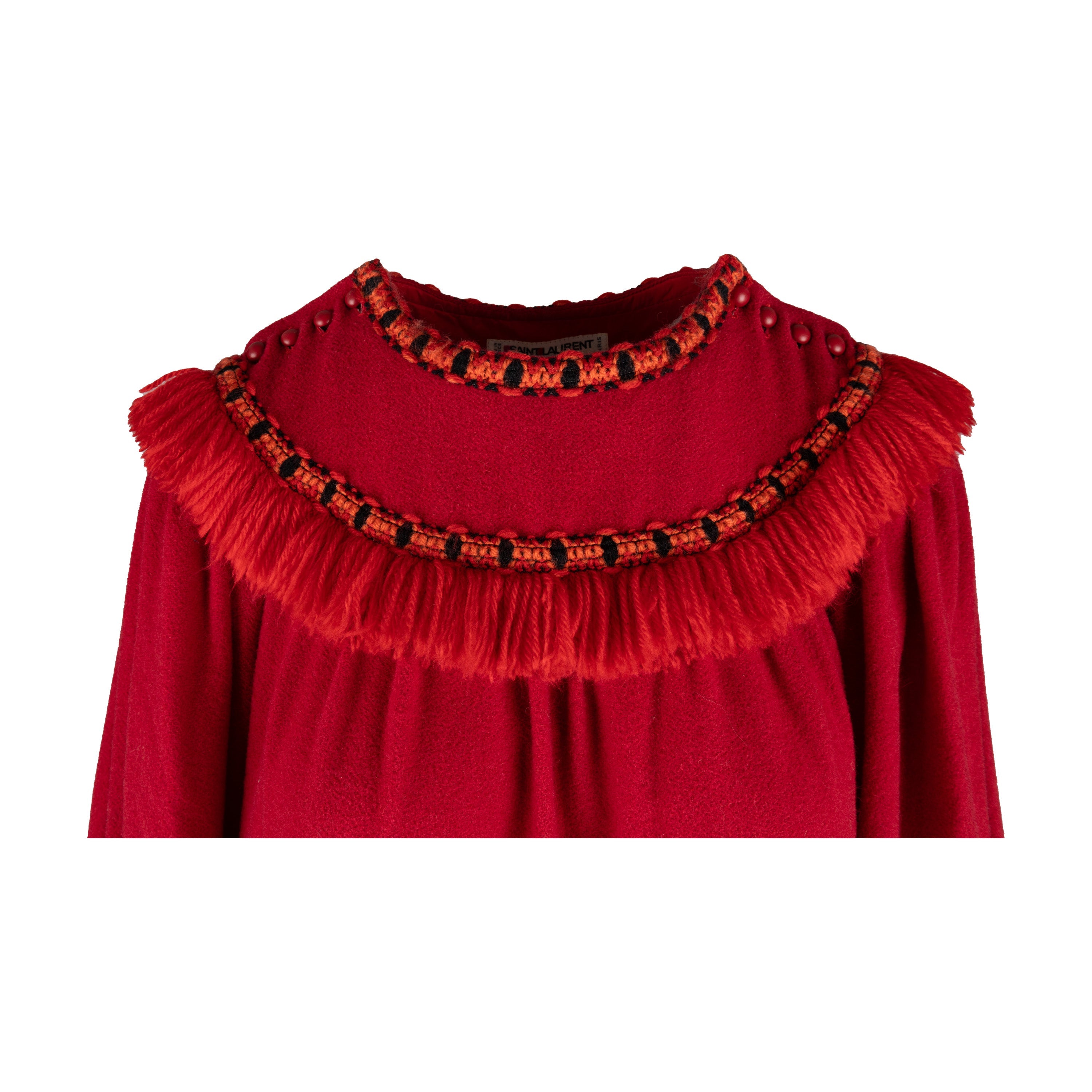 The ultimate vintage find, this Yves Saint Laurent dress from the Fall 1977 collection is crafted from red wool and designed with a tiered silhouette, round collar, puffed sleeves, two side pockets, and wool embroideries and fringes. Its smock style and the functional buttons on the shoulder make it an easy to wear piece. To finish, delicate fringes line the edges of the neckline and curved seams, making this a unique designer item.