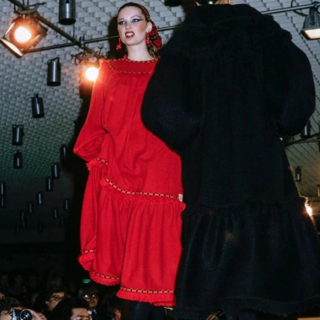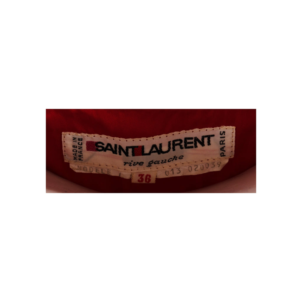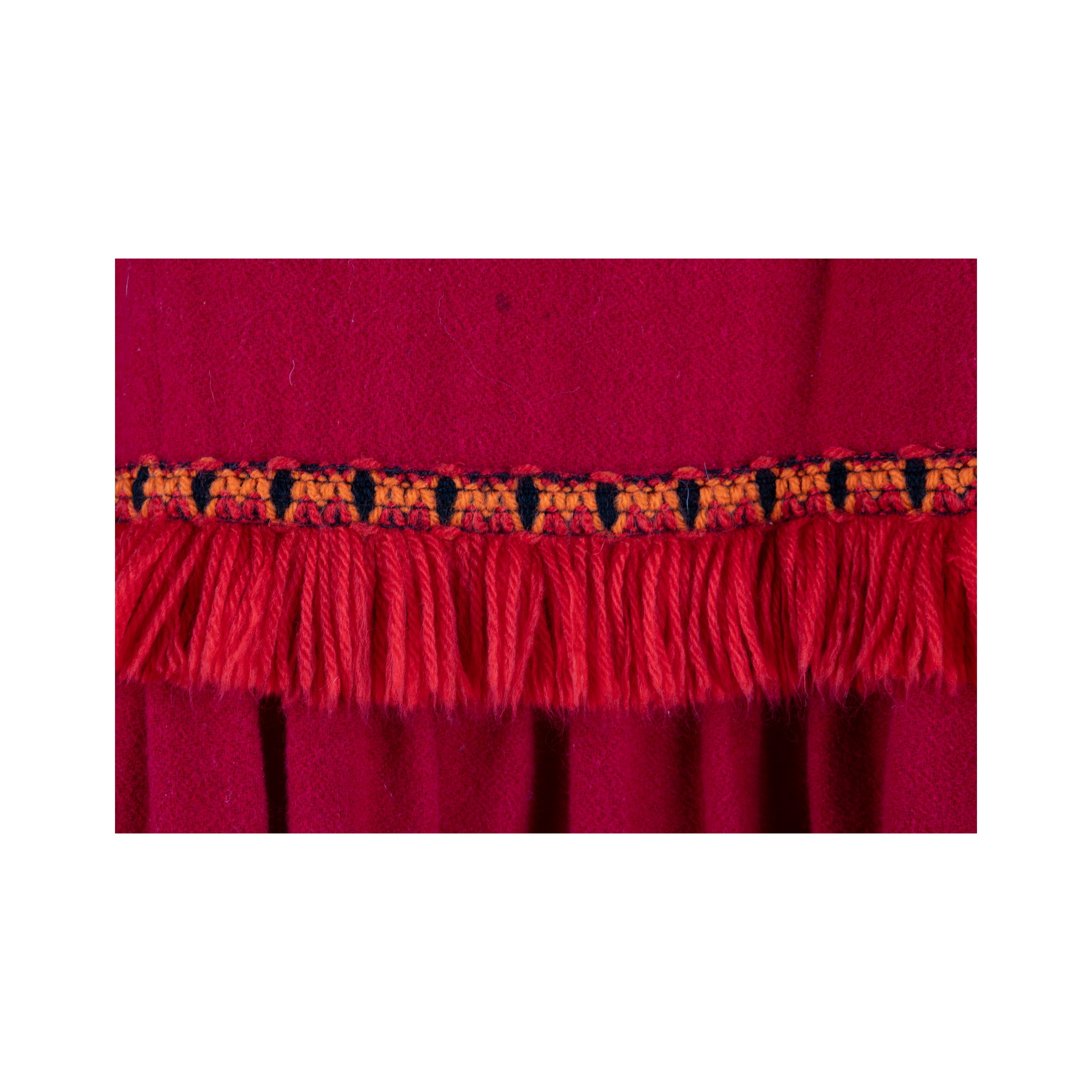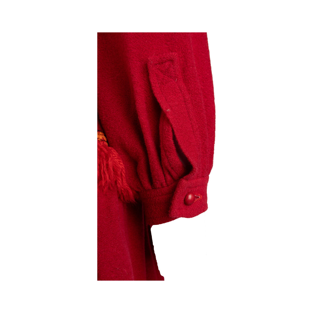 The ultimate vintage find, this Yves Saint Laurent dress from the Fall 1977 collection is crafted from red wool and designed with a tiered silhouette, round collar, puffed sleeves, two side pockets, and wool embroideries and fringes. Its smock style and the functional buttons on the shoulder make it an easy to wear piece. To finish, delicate fringes line the edges of the neckline and curved seams, making this a unique designer item.